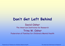 Don’t Get Left Behind David Osher The American Institutes for Research Trina W. Osher Federation of Families for Children’s Mental Health Federation of Families for Children’s Mental Health The American Institutes for Research 1 Overview Federal Role in Education No Child Left Behind Act of 2001 IDEA and Section 504 Improving Schools – what works Criteria for Choosing Improvement Strategies and Programs Federation of Families for Children’s Mental Health The American Institutes for Research 2 www.cecp.air.org Where To Go For: Resources, Links, & Overheads Keep in mind that It’s about being children first – children who need special help to do what their siblings and friends do naturally. Federation of Families for Children’s Mental Health The American Institutes for Research 4 Federal Role in Education No Federal Constitutional Right to Education Education is a STATE Matter Elementary and Secondary Education Act – Title 1- Background Cold War War on Poverty Federation of Families for Children’s Mental Health The American Institutes for Research 5 Federal vs. State Law Federal Law Sets the BASELINE and Takes Precedence Over State Law When there is a conflict, Federal law controls, unless the State confers additional protections or benefits that do not limit rights. Federation of Families for Children’s Mental Health The American Institutes for Research 6 The Logic of Leaving No Child Behind Adapted from: Beth Doll, University of Nebraska Federation of Families for Children’s Mental Health The American Institutes for Research 7 No Child LEFT Behind Background A Nation At Risk Standards Based Reform Goals 2000 Opportunity to Learn Standards Federation of Families for Children’s Mental Health The American Institutes for Research 8 NCLB Act of 2001 Key Provisions Increased Accountability Annual testing in math and reading Annual statewide progress towards meeting state or locally determined objectives reported to families and the public. Federation of Families for Children’s Mental Health The American Institutes for Research 9 NCLB Act of 2001 Specific Requirements A single accountability system Applies the same standards to all students in a State Includes annual measurable objectives Based on the State’s academic standards, academic assessments, and other academic indicators States also required to establish uniform data system on school safety & drug use Goal: continuous and substantial improvement for all students Federation of Families for Children’s Mental Health The American Institutes for Research 10 NCLB Act of 2001 Enhancements Focus on Evidenced-Based Interventions What Work’s Clearing House Improvement of Title One Program for Delinquent and Neglected Youth Access to general curriculum Focus on transition Focus on Accountability Parental & Student Choice Academic Failure Persistently Dangerous Schools Victims of Violent Crime Federation of Families for Children’s Mental Health The American Institutes for Research 11 Adequate Yearly Progress-(AYP) Applies the state or locally determined objectives to specific groups of students Measures progress separately for reading/language arts and math Accounts for participation rates of students (overall and subgroups (poverty, race, ethnicity, disability, limited English proficiency) Includes other academic indicators such as: graduation rates in high school, attendance, grade-to-grade retention rates Federation of Families for Children’s Mental Health The American Institutes for Research 12 AYP Making IT: A school (or LEA) makes AYP if: each group of students for which disaggregated data are reported meets or exceeds the annual measurable objectives; each group meets or exceeds the ‘other academic indicator;’ at least 95% participation for each disaggregated group applies to both math and reading/language arts. Federation of Families for Children’s Mental Health The American Institutes for Research 13 Sanctions for Not Making AYP Year 1 – Parental choice + improvement plan developed + technical assistance Year 2 – PLUS supplementary educational services Year 3 – PLUS designating a specific corrective action(s) Year 4 – PLUS develop a plan to implement an alternative governance arrangement Year 5 – RESTRUCTURE SCHOOL Federation of Families for Children’s Mental Health The American Institutes for Research 14 Questions About NCLB Federation of Families for Children’s Mental Health The American Institutes for Research 15 Federation of Families for Children’s Mental Health The American Institutes for Research 16 IDEA Foundation The Individuals With Disabilities Education Act guarantees children with disabilities a free, appropriate, public education in the least restrictive environment. It is built on the same constitutional principles applied to eliminate racial segregation in school – namely providing equal access. (If the state provides something to one class of individuals - public education in the case of schools - then it must give all members of the class the same opportunity to participate and benefit.) Federation of Families for Children’s Mental Health The American Institutes for Research 17 Purposes of the IDEA #1 To ensure that all children with disabilities have available to them a free appropriate public education that emphasizes special education and related services designed to meet their unique needs and prepare them for employment and independent living; [Parts B & C and the IEP Process] To ensure that the rights of children with disabilities and parents of such children are protected; and [procedural safeguards] To to assist States, localities, educational service agencies, and Federal agencies to provide for the education of all children with disabilities. [Part D and funding] Federation of Families for Children’s Mental Health The American Institutes for Research 18 Purposes of the IDEA #2 to assist States in the implementation of a statewide, comprehensive, c