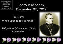 In This Lesson: Mendelian Genetics and Heredity (Lesson 3 of 3) Today is Monday, th December 8 , 2014 Pre-Class: Who’s your daddy, genetics? Tell your neighbor something about him. Today’s Agenda • Mendelian genetics – The Return of the Punnett Square! • Inheritance and heredity – Complete dominance, incomplete dominance… • Pedigrees • Chromosomal mutations • A geep, a zorse, a beefalo, and a cama. • Where is this in my book? – Chapters 14-15. • I will be skipping around between the two, but it’s all in there. – And by “all” I mean “mostly.” » You’ll be fine. By the end of this lesson… • You should be able to recognize patterns of inheritance. • You should be able to determine the probability of certain genotypes and phenotypes occurring from a given cross. • You should be able to read a pedigree. • You should be able to identify several chromosome-level mutations. Introduction • Bill Bryson – Genetic Relations Warm-Up • Genetics Practice 1: Basic Mendelian Genetics worksheet – The last one may be a little new…we’ll talk about it. The Big Disclaimer • No one in this class will be able to 100% determine their genetic lineage. • It’s like a putting on a play – the script may be the same each time, but exactly how it looks on stage might be different. • I’ll explain what I mean by this with a story. Gregor Mendel • As you might guess, the story starts with Gregor Mendel, the Austrian monk. – By the way, he had a formal scientific training and a library. He wasn’t scientifically illiterate like sometimes he’s portrayed. • That said, modern genetics began in the garden of a monastery sometime in the mid-1800s. Gregor Mendel’s Pee Pea • In an excellent example of the scientific method in action, Mendel noticed seven traits that only existed in one of two different possibilities: – Flowers are purple or white, located at the end of the stem or lower down. – Stems are long or short. – Seeds are green or yellow, round or wrinkled. – Peapods are green or yellow, inflated or condensed. • Through controlled experiments with large sample size (plus a fair degree of luck and patience), Mendel began to pick up on the notion of dominant/recessive traits. Pea Plant? Mendel’s Luck • Had Mendel attempted to study humans, he wouldn’t have had much success. Unlike us: – Peas can self-fertilize OR cross pollinate. – Their generation time is short. – Easily-observed traits follow simple inheritance. • Remember “detached/attached earlobes,” “tongue rolling,” and “hitchhiker’s thumb” from previous classes? – Most evidence suggests those are probably not as simple as “dominant” or “recessive.” Mendel + Darwin = • Darwin, working around the same time, set forth the idea of “descent with modification.” – He had the “why” of modification but not the “how.” • Mendel, whose work was published in 1866 but not actually recognized until 1900, provided the “how.” • Thus, Darwin and Mendel are the “parents” of biology. – Without their work, nothing makes sense. About “Heritable” and “Progeny” • Just for the record, the word “heritable” means “can be passed down.” • If something is not heritable, it means there likely isn’t a genetic component to it. • Also, you’ll [uncommonly] see the word “progeny.” – It means the same thing as offspring. • Okay then, back to our PowerPoint…we have a lot of slides to go. True Breeding • Mendel started his experiments with true breeding plants as his parental generation. – True breeding plants are those that lead to offspring of their own phenotypes. • In this case, Mendel cross-pollinated an all-white population with an all-purple population. – This is the P Generation. • The offspring of the P generation was entirely purple. – This is the F1 generation (first filial generation). • Mendel let the F1 generation self-pollinate, creating the F2 generation. – And thus the drama begins. Mendel’s Generations • The P generation is all white and all purple. – They’re cross-pollinated. • The resulting F1 generation is all purple. – They’re allowed to self-pollinate. • The resulting F2 generation is purple and white (!?!?) in a 3:1 ratio. – How did white reappear? Mendel’s Generations • As Mendel (and you) learned, the disappearance of white flowers suggested that purple flowers are somehow dominant to white flowers. • The reappearance of white flowers suggested that something about the white flowers was carried by those F1 purple flowers. • Out of further studies and many more years arose Mendel’s laws. – You know these, although perhaps not by name. Mendel’s Laws G GG G 1. Law of Segregation – During meiosis, alleles segregate into separate gametes. – Thus, each allele for a trait is passed on separately. • This process occurs in metaphase I, though Mendel wasn’t aware of that. g gg g G Gg g Mendel’s Laws G GG G 2. Law of Independent Assortment – The segregation process of metaphase I is random. • Remember that? g gg g – NOTE that there are exceptions to this rule that we will discuss later. G Gg g Mendel’s Laws GG 3. Law of Dominance – Some alleles/traits are dominant to others. • Remember that? gg Gg What Do Mendel’s Findings Tell Us? • Traits, coded for by genes, come in different versions. – An allele is thus a version of a gene. • We all have a gene for hair color, but we have different alleles. – Alleles vary in the sequence of nucleotides at the gene’s locus. • A locus is the spot on a chromosome/DNA molecule where a gene is located. • Plural = loci. What Do Mendel’s Findings Tell Us? • Some traits mask others. – Discrete inheritance, not blended. – The recessive allele may make a malfunctioning protein or not function at all. • Out of this arises the concept of a genotype and phenotype: – Geno