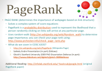 • PAGE RANK (determines the importance of webpages based on link structure)
