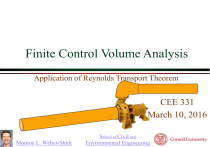 Finite Control Volume Analysis Application of Reynolds Transport Theorem CEE 331 March 10, 2016 Monroe L. Weber-Shirk School of Civil and Environmental Engineering Moving from a System to a Control Volume Mass Linear Momentum Moment of Momentum Energy Putting it all together! Conservation of Mass B = Total amount of ____ mass in the system 1 b = ____ mass per unit mass = __ DBsys Dt DM sys Dt t t bdV ˆ dA cv equation bV n cv dV cs ˆ dA But DMsys/Dt = 0! V n cv cs V nˆ dA t cs dV Continuity Equation cv mass leaving - mass entering = - rate of increase of mass in cv Conservation of Mass If mass in cv V nˆ dA t dV is constant 1 cs òr n̂ cv 1 V1 ×n ˆ 1dA + cs1 òr 2 V2 ×n ˆ 2 dA = 0 A1 V1 cs2 V nˆ dA ± r VA = ± m [M/T] cs V 2 V nˆ dA cs A Unit vector n̂ is ______ normal to surface and pointed ____ out of cv on We assumed uniform ___ the control surface V is the spatially averaged velocity normal to the cs Continuity Equation for Constant Density and Uniform Velocity V nˆ dA 1 cs1 1 1 2 ˆ 2 dA 0 Density is constant across cs V2 n cs2 1V 1 A1 2 V 2 A2 0 V 1 A1 V 2 A2 Q V1 A1 V2 A2 Q Density is the same at cs1 and cs2 [L3/T] Simple version of the continuity equation for conditions of constant density. It is understood that the velocities are either ________ uniform or _______ spatially ________. averaged Example: Conservation of Mass? The flow out of a reservoir is 2 L/s. The reservoir surface is 5 m x 5 m. How fast is the reservoir surface h dropping? ˆ cs V ndA t cv dV V Constant density cs V nˆ dA t dV Qout Qin Velocity of the reservoir surface dt dh Q Ares dh Qout dt Ares dt Example Linear Momentum Equation DBsys Dt t B mV DmV Dt t bdV cv ˆ dA cv equation bV n cs momentum VdV cv F 0 b mV momentum/unit mass m ˆ dA V V n Vectors! cs DmV Steady state ˆ dA V V n Dt cs This is the “ma” side of the F = ma equation! Linear Momentum Equation DmV ˆ dA V V n Dt cs DmV ˆ 1dA V2 2 V2 n ˆ 2 dA V1 1V1 n Dt cs1 cs2 DmV 1V1 A1 V1 2V2 A2 V2 Dt M1 1V1 A1 V1 Q V1 M 2 2V2 A2 V2 Q V2 Vectors!!! Assumptions Uniform density Uniform velocity V A Steady V fluid velocity relative to cv Steady Control Volume Form of Newton’s Second Law F D mV Dt M1 M 2 What are the forces acting on the fluid in the control volume? Gravity Shear at the solid surfaces Pressure at the solid surfaces Pressure on the flow surfaces F W F p1 F M 1 M2 Fp2 Fpwall F wall Why no shear on control surfaces? _______________________________ No velocity tangent to control surface Resultant Force on the Solid Surfaces The shear forces on the walls and the pressure forces on the walls are generally the unknowns Often the problem is to calculate the total force exerted by the fluid on the solid surfaces The magnitude and direction of the force determines size of _____________needed to keep thrust blocks pipe in place force on the vane of a pump or turbine... F W F p1 Fp2 Fss Fss Fpwall F wall =force applied by solid surfaces Linear Momentum Equation F W F p1 Fp2 Fss Fp2 ma M1 M 2 M2 M1 M 2 W Fp1 Fp2 Fss Fssx Forces by solid surfaces on fluid The momentum vectors have the same direction as the velocity vectors M1 Fp1 W Fssy M1 Q V1 M 2 Q V2 Example: Reducing Elbow 2 Reducing elbow in vertical plane with water flow of 300 L/s. The volume of water in the elbow is 200 L. 1m Energy loss is negligible. 1 Calculate the force of the elbow on the fluid. g*volume=-1961 N ↑ W = ________________________ M1 M 2 W Fp Fp Fss section 1 section 2 z D 50 cm 30 cm 0.196 m2 A ____________ ____________ 0.071 m2 1.53 m/s ↑ 4.23 m/s → V ____________ ____________ x ? p 150 kPa ____________ Direction of V vectors -459 N ↑ 1270 N → M ____________ ____________ ?← 29,400 N ↑ Fp ____________ ____________ 1 2 Example: What is p2? V12 p2 V22 z1 z2 1 2g 2 2g p1 V12 V22 p2 p1 z1 z2 2 g 2 g 2 2 1.53 m/s 4.23 m/s 3 3 p2 150 x 10 Pa 9810 N/m 0 1 m 2 2 9.8 m/s P2 = 132 kPa Fp2 = 9400 N Example: Reducing Elbow Horizontal Forces M1 M 2 W Fp1 Fp2 Fss 2 Fp2 Fss M1 M 2 W Fp1 Fp2 Fssx M 1x M 2x Wx Fp1x Fp2 x Fss M 2 Fp x x M2 1 2x Fssx 1270 N -9400 N Fssx 10.7kN Force of pipe on fluid Fluid is pushing the pipe to the ______ left z x Example: Reducing Elbow Vertical Forces Fssz M 1z M 2z Wz Fp1z Fp2 z Fssz M 1z Wz Fp1z Fssz 459N 1,961N 29,400N 2 1 Fp1 Fssz 27.9kN 28 kN acting downward on fluid up Pipe wants to move _________ W M1 z x Example: Fire nozzle A small fire nozzle is used to create a powerful jet to reach far into a blaze. Estimate the force that the water exerts on the fire nozzle. The pressure at section 1 is 1000 kPa (gage). Ignore frictional losses in the nozzle. 8 cm 2.5 cm Fire nozzle: Solution Identify what you need to know P2, V1, V2, Q, M1, M2, Fss Determine what equations you will use Bernoulli, continuity, momentum 8 cm 1000 kPa 2.5 cm Find the Velocities V12 p2 V22 z1 z2 2g 2g p1 V12 V22 2g 2g p1 continuity→ V1 D12 V2 D22 4 p1 2 2 D2 2 V V 1 D 1 2 2 2 1 V V 2g 2g 4 D2 V 1 p1 2 D1 2 2 V2 2 p1 D 4 1 2 D1 Fire nozzle: Solution section 1 section 2 D 0.08 0.025 m A P V Fp M Fssx Q 0.00503 1000000 4.39 5027 -96.8 -4132 22.1 8 cm 1000 kPa 2.5 cm 0.00049 m2 Which direction does the nozzle want to go? ______ 0 Pa 44.94 m/s Is Fssx the force that the firefighters need to brace N against? ____ __________ NO! Moments! 991.2 N N force applied by nozzle on water L/s Fssx M 1x M 2x Wx Fp1x Fp2 x Example: Momentum with Complex Geometry Find Q2, Q3 and force on the wedge in a horizontal plane. Q1 10 L/s V1 20 m/s q2 cs2 y Fy 0 q 1 10 q 2 130 1000 kg / m q 3 50 x cs1 3 q1 Q2, Q3, V2, V3, Fx Unknown: ________________ cs3 q3 5 Unknowns: Need 5 Equations Identify the 5 equations! Unknowns: Q2, Q3, V2, V3, Fx Continuity Q1 Q2 Q3 Bernoulli (2x) p1 V12 p2 V22 z1 z2 1 2g 2 2g q2 cs2 V1 V2 V1 V3 Momentum (in x and y) M1 M 2 M3 W Fp1 Fp2 Fp3 Fss y x cs1 q1 cs3 q3 Solve for Q2 and Q3 M1 M 2 M3 W Fp1 Fp2 Fp3 Fss Fssy 0 M1 y M 2 y M 3 y atmospheric pressure M1 Q V1 0 QV 1 1 sin q 1 Q2V2 sin q 2 Q3V3 sin q 3 V sin q Component of velocity in y direction y Q1 