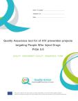 Name of project: ………………………………………….. Assessed by: ………..…………………………………….. Date: …………..……………………………………………… Quality Assurance tool for of HIV prevention projects targeting People Who Inject Drugs PIQA 0.6 QUALITY ASSESSMENT/QUALITY ASSURANCE FORM This work is part of the Joint Action on Improving Quality in HIV Prevention (Quality Action), which has received funding from the European Union within the framework of the Health Programme. COLOPHON Title: PIQA 0.6 Quality Assessment/Quality Assurance Form Authors: Annemiek Dorgelo, Dutch Institute for Improvement of Health Care and Health Promotion, CBO Cor Blom, Soa Aids Nederland With contributions from: Viveca Urwitz, Swedish Institute for Disease Control Marica Ferri, European Monitoring Centre for Drugs and Drug Addiction (EMCDDA) Anastasia Pharris, European Centre for Disease Control (ECDC) Katrin Prins-Schiffer, Eberhard Schatz, Correlation Network Acknowledgements: PIQA is built on the Health Promotion Effect Management Instrument Preffi 2.0. The owner of this instrument, CBO, had granted permission to Quality Action to use Preffi 2.0 for the purpose of developing PIQA. Publication date: March 2014 Financed by: PIQA is part of Quality Action (the Joint Action on Improving Quality in HIV prevention in Europe), which has received funding from the European Union within the framework of the Health Programme. Copyright: Quality Action, 2014 www.qualityaction.eu www.qualityaction.eu INTRODUCTION PIQA is a Quality Assurance tool for HIV prevention and health promotion projects targeted at People Who Inject Drugs(PWID). The tool consists of: A quality assessment/quality assurance form A user guide You are now reading the introduction to the quality assurance form. WHAT YOU NEED TO KNOW ABOUT PIQA The PIQA tool will help you to assure the quality of your HIV prevention (or health promotion) project(s) targeting PWID. You can use it to assess and receive feedback on the strong and weak points of your project. It will also help you to decide on steps to take to improve, and thus assure the quality of, your project. PIQA can be used for projects that are intended to prevent HIV, STI, Hepatitis, TB and other infections that are common among PWID. It can also be used for other health promotion projects targeting PWID and for quality assurance of the health promotion aspects of other PWID projects. PIQA can be used by those implementing the project, by project coordinators and by representatives from the target group who know about the project. PIQA is a self-assessment tool. It is most useful when it involves a range of people in the assessment process, including project team members, the target group and other key stakeholders. PIQA is based on evidence from research, practical experience and logic. The clusters and questions in the quality assessment form have been shown to be important for project success. For more general information please refer to the user guide. In this guide you will find: General and back ground information on PIQA Explanation of clusters and terms used Online references to information relevant for answering the questions in the quality assurance form www.qualityaction.eu www.qualityaction.eu USING PIQA Before you use the tool we advise you to: Read the user guide Have information about the project to hand Decide how and with whom you will do the assessment and organise the assessment process After using the tool we advise you to: Formulate an action plan Involve stakeholders in realising this action plan Repeat the assessment process USING THE QUALITY ASSESSMENT/QUALITY ASSURANCE FORM First fill in the name of the project, the names of the people who assessed the project, and the date of the assessment. Assessment questions: You can indicate if you think your project is strong, moderate or weak on the item the question asks for by colouring the box green for strong, orange for moderate and red for weak. If you do not understand any part of the question, see Chapter 3 of the user guide for explanations. If you do not have the information to answer the questions, see Chapter 3 of the user guide for references to information and examples. If you are not able to assess a question or you think it is irrelevant, you can tick the relevant box. www.qualityaction.eu www.qualityaction.eu Overall assessment of cluster: If you have assessed all the questions in a cluster, you can assess the quality of the cluster as a whole. You do this by assessing whether the questions in the cluster are mostly assessed as strong (lots of green boxes), mostly moderate (lots of orange boxes), or mostly weak (lots of red boxes). Colour the box Overall Assessment of cluster green for strong, orange for moderate or red for weak. Explanation of assessment per cluster: Use this box to explain the assessment i.e. why you think the question in this cluster should be assessed strong, moderate or weak. This makes it possible for others to understand the rationale for your assessment. Points of improvement: Use this box to formulate up to a maximum of five points for improvements on the questions which are assessed weak (red) or moderate (orange). Start with the questions assessed weak (red). Prioritised actions: Use this box to formulate and prioritise three actions for improvement of the project, taking into consideration urgency, capacity and budget. Look at all the points for improvement you identified and start by prioritising the actions that should be taken in the short term. www.qualityaction.eu www.qualityaction.eu Overall assessment of project: If you have assessed all the clusters, you can assess the quality of the project as a whole. Transfer the overall assessments for each cluster to Part 9 of the tool. Then look at the overall impression. Is the project assessed as mostly strong (lots of green boxes), mostly moderate (lots of orange boxes), o
