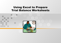 Using Excel to Prepare Trial Balance Worksheets What are Trial Balance Worksheets? • Trial Balance Worksheets are prepared by accountants at the end of an accounting period. • A Trial Balance is prepared from the General Ledger. All accounts and their respective balances are listed on a worksheet. • The Trial Balance is footed. Total Debit Accounts must equal Total Credit Accounts. The Trial Balance LUCILLE'S PHONE SERVICE TRIAL BALANCE WORKSHEET TRIAL BALANCE MARCH 31, 20X3 The Trial Balance for Lucille's Phone Service is shown here: Notice that: ..The accounts are listed in general ledger order-assets first then liabilities, then equities, revenues and finally expenses. ..The debit and credit columns are footed and are equal. ..A double line is used to indicate a final total. DR CR CASH 7,961 ACCOUNTS RECEIVABLE 8,472 SUPPLIES 810 PREPAID RENT 1,600 EQUIPMENT 9,300 ACCUMULATED DEPR., EQUIPMENT ACCOUNTS PAYABLE 4,347 ACCRUED WAGES PAYABLE UNEARNED ANS. SERV REV 1,776 COMMON STOCK 10,866 RETAINED EARNINGS 1,000 DIVIDENDS 4,268 ANSWERING SERV REV 19,003 WAGE EXPENSE 3,891 REPAIR EXPENSE 690 DEPRECIATION EXPENSE SUPPLIES EXPENSE RENT EXPENSE ------------------------------36,992 36,992 ======= ===== The Trial Balance-A Closer Look The Trial Balance for Lucille's Phone Service is shown again for a closer look ..By using excel the accountant can insert a formula which will automatically add up a column of numbers. ..There are many ways to do this. Two Examples are: 1. Write out the formula 2. Use the sum sign on the tool bar. (It looks like an "E".) And highlight the cells to be added. LUCILLE'S PHONE SERVICE TRIAL BALANCE MARCH 31, 20X3 CASH ACCOUNTS RECEIVABLE SUPPLIES PREPAID RENT EQUIPMENT ACCUMULATED DEPR., EQUIPMENT ACCOUNTS PAYABLE ACCRUED WAGES PAYABLE UNEARNED ANS. SERV REVENUE COMMON STOCK RETAINED EARNINGS DIVIDENDS ANSWERING SERV REV WAGE EXPENSE REPAIR EXPENSE DEPRECIATION EXPENSE SUPPLIES EXPENSE RENT EXPENSE Rows 2 3 4 5 6 7 8 9 10 11 12 13 14 15 16 17 18 19 20 21 22 23 Column G DR 7,961 8,472 810 1,600 9,300 Column H CR 4,347 1,776 10,866 1,000 4,268 19,003 3,891 690 --------------------------------------------------------------------=SUM(G5:G23) =SUM(H5:H23) =============================== ============= The Trial Balance – An Even Closer Look The Trial Balance for Lucille's Phone Service is shown again for an even closer look LUCILLE'S PHONE SERVICE TRIAL BALANCE MARCH 31, 20X3 Rows 2 3 4 Column G Column H DR CR CASH 5 7,961 ACCOUNTS RECEIVABLE 6 8,472 The formula in the first SUPPLIES 7 810 column is: =SUM(G5:G23) PREPAID RENT 8 1,600 (To work it must be exact.) EQUIPMENT 9 9,300 ACCUMULATED DEPR., EQUIPMENT 10 All excel formulas begin ACCOUNTS PAYABLE 11 with an "=" sign. ACCRUED WAGES PAYABLE 12 UNEARNED ANS. SERV REVENUE To add a column of COMMON STOCK numbers use "SUM"; RETAINED EARNINGS Use "(" then the first DIVIDENDS cell in the group --ie. "G5"; ANSWERING SERV REV then ":"; then the last WAGE EXPENSE cell in the group --ie. "G23". REPAIR EXPENSE DEPRECIATION EXPENSE Highlighting the cells SUPPLIES EXPENSE G5,G6,G7,G8,G9 etc. to G23 RENT EXPENSE will work just as well. 13 14 15 16 17 18 19 20 21 22 23 4,347 1,776 10,866 1,000 4,268 19,003 3,891 690 --------------------------------------------------------------------=SUM(G5:G23) =SUM(H5:H23) ============================== ============= Why Do Accountants Prepare Trial Balance Worksheets? Trial Balance Worksheets allow accountants to adjust general ledger balances for economic events that have occurred but are not yet reflected in the books and records. What kind of events require adjustments? • Allocations • Accruals • Corrections What accounts require allocation adjustments? • Prepaid Expenses, • Unearned Revenues, [Assets] that have [Liabilities] arising been used up or from customer expired, require deposits and adjustment to reflect advances, that have actual end of been earned also accounting period require adjustment to balances: reflect actual end of accounting period – Prepaid Rent balances: – Prepaid Insurance – Unearned Fees – Supplies – Unearned – Accumulated Subscriptions Depreciation What Accounts Require Accruals? • Revenue that has been earned but has not yet been recorded at the end of an accounting period must be adjusted for accruals: – Accrued Receivables – Interest Receivable – Accounts Receivable • Expenses that have been incurred but not yet recorded at the end of an accounting period must be adjusted for accruals: – Accrued Payables – Wages Payable – Utilities Payable – Accounts Payable Adjusting Entries-Examples Lucille’s Phone Service is preparing adjusting entries for the period ended March 31, 20X3 for the following economic events. a. The remaining supplies not yet used are counted and found to be equal to $260. b. On January 1, 20X3, Lucille paid 4 months rent ($1,600). An adjustment needs to be made to record the expired portion of rent which covered January, February, and March. c. Depreciation for the period is $110. d. $300 of Unearned Answering Service Revenue has been earned by March 31, 20X3. e. Wages of $200 due to employees on March 31, 20X3 will not be paid until April 3, 20X3. Adjusting Entries • Adjusting entries are recorded in the General Journal. • The Accountant Posts the adjusting entries to a Trial Balance Worksheet. • The Worksheet is used to determine the ending balances for the period before the adjustments are actually posted to the general ledger. • Financial statements can be prepared from the Worksheet. Adjusting Entries-A Closer Look Journal Entries need to be prepared in good form before the Trial Balance can be adjusted LUCILLE'S PHONE SERVICE A djusting Journal Entries March 31, 20X3 a SUPPLIES EXPENSE SUPPLIES 550 550 OFFICE SUPPLIES OF $810 NEED TO BE ADJUSTED TO REFLECT THE ACTUAL AMOUNT OF OFFICE SUPPLIES REMAINING OF $260. b RENT EXPENSE PREPA ID RENT 1,200 1,200 JANUARY, FEBRUARY AND MARCH REPRESENT