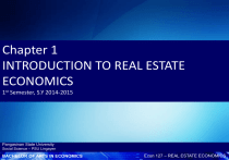 Chapter 1 INTRODUCTION TO REAL ESTATE ECONOMICS 1st Semester, S.Y 2014-2015 Pangasinan State University Social Science – PSU Lingayen BACHELOR OF ARTS IN ECONOMICS Econ 127 – REAL ESTATE ECONOMICS Chapter Outline A. B. C. D. E. F. G. H. I. J. K. L. M. N. O. Definition of Real Estate Economics Importance of Real Estate Economics Microeconomics vs. Macroeconomics Land as an Economic Resource Renewable and Nonrenewable Resources Estate Categories of Estates Land: Surface and Subsurface Rights Real Estate Economic and Physical Characteristics of Land / Real Estate Real Property Bundle of Rights Real Property vs. Personal Property Fixtures Trade Fixtures Pangasinan State University Social Science – PSU Lingayen BACHELOR OF ARTS IN ECONOMICS Econ 127 – REAL ESTATE ECONOMICS What is Real Estate Economics? A study of people & how their actions affect property values. Application of economic principles techniques to the real estate market. and Develops theories and models that help people think through the complicated dynamics of property, value and exchange. Pangasinan State University Social Science – PSU Lingayen BACHELOR OF ARTS IN ECONOMICS Econ 127 – REAL ESTATE ECONOMICS What is Real Estate Economics? General Economics Principles and Theory Real Estate Economics Real Estate Principles and Practice Real estate economics draws principles from both general economics and real estate practice. It then combines them to study changes in real estate use, value, and activity. The focus is on real estate change. The main reason to study real estate economics is to help understand issues and changes, and the impact these will have on local real estate use and values. Pangasinan State University Social Science – PSU Lingayen BACHELOR OF ARTS IN ECONOMICS Econ 127 – REAL ESTATE ECONOMICS Real Estate Defined Land and attachments (buildings). This refers to land or land improvements, and the rights of use associated with the ownership. Property, land or fixtures whose nature is definable and whose ownership rights are specifiable through law. Pangasinan State University Social Science – PSU Lingayen BACHELOR OF ARTS IN ECONOMICS Econ 127 – REAL ESTATE ECONOMICS Economics Defined Economics deals with how individuals and societies choose to allocate and use scarce resources to produce, distribute, and consume goods and services. The study of choices The study of scarcity The study of resource allocation The study of production and consumption Pangasinan State University Social Science – PSU Lingayen BACHELOR OF ARTS IN ECONOMICS Econ 127 – REAL ESTATE ECONOMICS Two Categories of Economics Macroeconomics. It is concerned with the economy as a whole and issues affecting it, including unemployment, inflation, economic growth, fiscal and monetary policy. Microeconomics. This analyzes the behavior of the individual units in the economy such as households and firms, markets, and their interactions. Pangasinan State University Social Science – PSU Lingayen BACHELOR OF ARTS IN ECONOMICS Econ 127 – REAL ESTATE ECONOMICS Let’s Check Your Understanding! Determine whether each of the following cases on real estate economics is a concern of microeconomics or macroeconomics. 1. The percentage contribution of real estate segment in the increase of GDP 2. Mr. Cruz’s decision whether to rent an apartment or buy a housing unit 3. Occurrence of real estate bubble in recent years 4. The determinants that affect the supply of retail spaces in SM Malls 5. The price to be charged for a three-night stay in a luxurious resort Pangasinan State University Social Science – PSU Lingayen BACHELOR OF ARTS IN ECONOMICS Econ 127 – REAL ESTATE ECONOMICS Why Study Real Estate Economics? Understand value fluctuations Estimate real estate values Solve real estate problems Understand fluctuations & changes to local real estate markets. Personal reasons To best understand owning v. renting, buying v. investing, when to buy, what to buy, how to buy, where to buy. Professional reasons To best serve customers in their real estate transactions— property or financing or investment advice. Pangasinan State University Social Science – PSU Lingayen BACHELOR OF ARTS IN ECONOMICS Econ 127 – REAL ESTATE ECONOMICS Why is Real Estate Economics so Interesting? Everything that we do also involves real estate: where we live, where we work, where we play, and more. And every real estate decision is also an economic decision! One dream of a Filipino is to buy a home—but where? And how? Today, almost every other newspaper headline involves issues in real estate economics—mortgage problems, interest rates, the impact of real estate employment, foreclosures, property values—all are issues that are discussed here! Pangasinan State University Social Science – PSU Lingayen BACHELOR OF ARTS IN ECONOMICS Econ 127 – REAL ESTATE ECONOMICS Economic Resources in Real estate Economic resources in real estate are inputs used by developers in the building or construction process. These may include the following: 1. 2. 3. 4. Land Labor Capital Entrepreneurial skills Pangasinan State University Social Science – PSU Lingayen BACHELOR OF ARTS IN ECONOMICS Econ 127 – REAL ESTATE ECONOMICS Economic Resources in Real Estate Land includes all the natural resources found in nature a country possesses, such as water, minerals, animals, and forests. Labor is the work time and work effort that people devote to producing goods and services. Capital refers to produced goods that can be used as resources for further production. Entrepreneurship is the human resource that combines the factors of production creatively and efficiently. Pangasinan State University Social Science – PSU Lingayen BACHELOR OF ARTS IN ECONOMICS Econ 127 – REAL ESTATE ECONOMICS Let’s Check Your Understanding! Determine what category of resources in real estate sector does each of the following belong. 1. Cement and bricks 2. Heavy-duty trucks 3. Civil engin