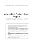 USDA RURAL DEVELOPMENT RURAL BUSINESS-COOPERATIVE SERVICE Value-Added Producer Grant Program APPLICATION TOOLKIT for PLANNING GRANTS NOTICE TO ALL VALUE ADDED PRODUCER GRANT (VAPG) APPLICANTS Use of this application template is not required (optional). However, applicants must provide the required information. Use of the template does not imply or ensure a favorable eligibility determination. In addition to the information requested in the template, applicants must complete and submit all required Federal forms and registrations, and append specified documentation to support claims for applicant and project eligibility, priority points, reserved funding, and matching funds verification; as specified by the program. Applications received that do not include ALL required materials will be considered incomplete. Certifications, statements, and other standard verbiage used throughout this toolkit that refer to “you,” “I”, “we,” “it”, “applicant”, “entity”, “grantee”, and other similar terms are meant to refer to the legal applicant entity applying for the ValueAdded Producer Grant unless otherwise noted.” USDA Value-Added Producer Grant Application Toolkit for Planning TABLE OF CONTENTS PROGRAM OVERVIEW................................................................................................................................................ ii DOCUMENT PURPOSE ................................................................................................................................................ ii CHECKLIST ................................................................................................................................................................ iii REQUIRED STANDARD FORMS and IMPORTANT APPLICATION RESOURCES ................................................................. v APPLICATION TEMPLATE ............................................................................................................................................ 1 SECTION 1: SUMMARY INFORMATION .............................................................................................................................. 1 SECTION 2: EXECUTIVE SUMMARY OF PROJECT ................................................................................................................ 1 SECTION 3: GENERAL ELIGIBILITY REQUIREMENTS ............................................................................................................ 2 SECTION 4: APPLICANT ELIGIBILITY .................................................................................................................................... 3 SECTION 5: PROJECT ELIGIBILITY ........................................................................................................................................ 6 SECTION 6: EVALUATION CRITERIA .................................................................................................................................. 11 SECTION 7: MATCHING FUNDS ........................................................................................................................................ 14 APPENDICES ................................................................................................................................................................ APPENDIX A Tribes and Tribal Entities as VAPG Applicants……………………………………………………………………………………………A APPENDIX B Section 3.2 Legal Authority and Good Standing ............................................................................................. B APPENDIX C Supporting Documentation ........................................................................................................................... C APPENDIX D Matching Funds Verification .......................................................................................................................... D APPENDIX D.1 Applicant Cash ...................................................................................................................................... D.1 APPENDIX D.2 Applicant Approved Loan or Line of Credit .......................................................................................... D.2 APPENDIX D.3 Applicant In-Kind Contribution............................................................................................................. D.3 APPENDIX D.4 Third-Party Cash ................................................................................................................................... D.5 APPENDIX D.5 Third-Party In-Kind ............................................................................................................................... D.6 APPENDIX E Reserved Funding and Priority Point Eligibility ............................................................................................... E APPENDIX E.1 Priority Points and/or Reserved Funding for Beginning Farmers or Ranchers ..................................... E.2 APPENDIX E.2 Priority Points and/or Reserved Funding for Socially Disadvantaged Farmers or Ranchers ................ E.3 APPENDIX E.3 Priority Points and/or Reserved Funding for Mid-Tier Value Chains.................................................... E.5 APPENDIX E.4 Priority Points Operators of a Small- or Medium-sized Farms or Ranches Structured as a Family Farms or Ranches (SMFFR) ..................................................................................................................................................... E.8 APPENDIX E.5 Priority Points Farmer or Rancher Cooperatives (CO-OP) .................................................................. E.10 Optional Feedback ........................................................................................................... Error! Bookmark not defined. i 11/20/2013 USDA Value-Added Producer Grant Application Toolkit for Planning PROGRAM OVERV