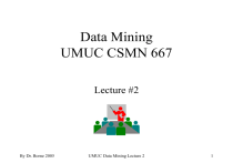 Data Mining UMUC CSMN 667 Lecture #2 By Dr. Borne 2005 UMUC Data Mining Lecture 2 1 Term Paper - Data Mining Case Analysis • Refer to Project Descriptions section of WebTycho course Syllabus for detailed information. • 1-page Summary (Abstract+Outline) due: April 4, 2005 • Final Paper Due Date: 12midnight, April 18, 2005 • Submit both in your WebTycho Assignments Folder • Term Paper Page Restrictions: 5-8 pages • I will submit your paper to TurnItIn.com for verification of originality – per UMUC Graduate School policies. • Format/Style: Use the SPIE Conference Proceedings Style, which is available at: http://www.spie.org/app/Publications/index.cfm?fuseaction=authinfo&type=manspecs [ONLY USE THIS FOR STYLE FILES AND FORMATTING INSTRUCTIONS] By Dr. Borne 2005 UMUC Data Mining Lecture 2 2 Case Analysis Instructions (1) The goal of the paper assignment is to complete an in-depth study of a data mining application. Examples of applications include financial, scientific, medical, intrusion detection, and web mining. Describe data types, data volumes, technical challenges, end-goals, who is the user community, which data mining algorithms are most relevant, why data mining, how is it used, what is the current status of data mining usage in this field? --- Possible case topics include: A direct mailing application looking to maximize cross-selling opportunities (e.g., Doubleclick). A bank determining the credit worthiness of a potential customer (e.g., American Express, Bank of America). A medical insurer looking to detect medical fraud. Gene detection in BioInformatics (e.g., Celera). Glitch or anomaly detection in scientific time series data. Abnormal network access behavior for detection of computer system intrusion and security violation. By Dr. Borne 2005 UMUC Data Mining Lecture 2 3 Case Analysis Instructions (2) • You may choose to go in depth in either one of these two areas: – A data mining application domain: Evaluate the application area in detail, as explained on the previous slide, including a review and analysis of the different data mining techniques employed there. Or – A data mining technique: Research in depth the different application domains where this technique has been used. Answer the questions on the previous slide when evaluating this technique’s different application areas. By Dr. Borne 2005 UMUC Data Mining Lecture 2 4 Case Analysis Paper - Instructions (3) • Please e-mail me your suggested topic (application area to be researched) so that I may verify that it is okay. By Dr. Borne 2005 UMUC Data Mining Lecture 2 5 Case Analysis Paper - Instructions (4) • Submit your completed paper in WebTycho. • You may submit your paper in any of these formats: PDF, or Microsoft WORD, or postscript (PS). • You must submit it no later than midnight on April 18. WebTycho will not allow submissions after that time. • Submit the paper in your "Assignments Folder" (on the left menu bar within the WebTycho course website). By Dr. Borne 2005 UMUC Data Mining Lecture 2 6 Lecture 2: “Data Mining Roots” (Chapter 2 of Dunham textbook) By Dr. Borne 2005 UMUC Data Mining Lecture 2 7 Lecture 2 Outline • • • • • • • • • • • • Summary of “What is Data Mining?” Tutorial Foundations of Data Mining Database Systems Data Warehousing and OLAP Statistics and Data Mining Information Retrieval Data Mining as “Rule Induction” Fuzzy Sets and Logic Machine Learning Steps in the Data Mining Process Major Issues in Data Mining A Case Study: The NASA Mars Rover By Dr. Borne 2005 UMUC Data Mining Lecture 2 8 “What is Data Mining?” From online reading assigment -Data Mining Tutorial at : http://www.megaputer.com/dm/dm101.php3 By Dr. Borne 2005 UMUC Data Mining Lecture 2 9 Summary of “What is Data Mining?” Tutorial • • • • • • What is data mining? Why use data mining? What can Data Mining do for you? Reasons for the growing popularity of Data Mining Tasks Solved by Data Mining Different DM Technologies and Systems Subject-oriented analytical systems Statistical packages Neural Networks Evolutionary Programming Memory Based Reasoning Decision Trees Genetic Algorithms Nonlinear Regression Methods By Dr. Borne 2005 UMUC Data Mining Lecture 2 10 What can Data Mining do for you? (business-focused list) • Identify your best prospects and then retain them as customers. • Predict cross-sell opportunities and make recommendations. • Learn parameters influencing trends in sales and margins. • Segment markets and personalize communications. By Dr. Borne 2005 UMUC Data Mining Lecture 2 11 Reasons for the Growing Popularity of Data Mining • Growing Data Volumes • Limitations of Human Analysis • Low Cost of Machine Learning Tasks Solved by Data Mining • Prediction • Explicit Modeling • Classification • Detection of Relations • Deviation Detection By Dr. Borne 2005 • Clustering • Market Basket Analysis UMUC Data Mining Lecture 2 12 Foundations of Data Mining By Dr. Borne 2005 UMUC Data Mining Lecture 2 13 Foundations of Data Mining: Databases, Statistics, and Machine Learning • David Hand (1998. “Data Mining: Statistics and More?”, The American Statistician, 52, pp. 112– 118) used the following definition. – "Data mining is a new discipline lying at the interface of statistics, database technology, pattern recognition, machine learning, and other areas. It is concerned with the secondary analysis of large databases in order to find previously unsuspected relationships which are of interest or value to the database owners.” – Why “secondary”? … Because the data were typically collected for other purposes (such as billing, accounting, customer addresses, etc.). Primary analysis of large databases is generally the domain of STATISTICS. By Dr. Borne 2005 UMUC Data Mining Lecture 2 14 Slide from Lecture 1 Evolution of Data Mining <http://www.thearling.com/text/dmwhite/dmwhite.htm> Evolutionary Step 