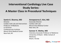 Interventional Cardiology Live Case Study Series: A Master Class in Procedural Techniques Samin K. Sharma, MD Annapoorna S. Kini, MD Director Cardiac Cath Lab and Intervention Professor of Medicine Co-Director Cardiovascular Institute Mount Sinai Medical Center New York, NY Associate Director Cardiac Cath Lab Mount Sinai Medical Center New York, NY Sameer K. Mehta, MD Voluntary Associate Professor of Medicine University of Miami - Miller School of Medicine, Miami, Florida September 21, 2010: Case #1: NJ, 72-y-o man Presentation: Crescendo exertional angina and SOB for 2 months and stress MPI revealed moderate-to-severe multivessel ischemia and TID History: Hypertension, hyperlipidemia, ex-smoker, colon ca s/p colectomy & chemotherapy 2006 CRi Medications: ASA, clopidogrel, simvastatin, metoprolol, amlodipine SOB = shortness of breath; MPI = myocardial perfusion imaging; TID = transient ischemic dilation; Cri = incomplete blood cell count recovery; ASA = acetylsalicylic acid Case #1 (cont) Cardiac Cath: 8/6/2010: SYNTAX Score 26 Three-vessel CAD with LVEF 65% Left main: no obstruction LAD: 80% long calcified lesion of proximal LAD (large) with 70% apical lesion and mild diffuse first diagonal LCx: 50% prox LCx, 80% OM1 & 50% distal LCx (Medina 1,1,1) RCA: 70%-99% multiple lesions in RCA, fills via LAD PCI 8/6/10: PCI of RCA (XienceV® x 4, 3-3.5 mm size) Plan Today: PCI of calcified LAD lesion using RotaDES and LCx bifurcation CAD = coronary artery disease; LVEF = left ventricular ejection fraction; LAD = left anterior descending; LCx = left circumflex; OMI = first obtuse marginal; RCA = right coronary artery; PCI = percutaneous coronary intervention; RotaDES = rotablation and drug-eluting stent implantation ® Abbott Laboratories, Abbott Park, Ill. Issues Involving the Case • Choice of Antithrombotic Therapy • Treatment of Calcified Lesions • Bifurcation Lesion Intervention REPLACE-2 vs ACUITY PCI: 30-day Events REPLACE-2 PCI ACUITY PCI Heparin + GP IIb/IIIa (n = 3008) Bivalirudin alone (n = 2994) Heparin + GP IIb/IIIa (n = 2619) Bivalirudin alone (n = 2561) P = .30 % P = .40 7.0 7.6 10.0 % P = .45 9.2 8.2 8.8 P < .001 P < .001 4.1 4.2 2.4 Ischemic Composite P = .49 11.1 10.5 Major Bleeding 2.1 Net Clinical Outcomes Lincoff AM, et al. JAMA. 2003;289:853-863 Ischemic Composite Major Bleeding Net Clinical Outcomes Stone GW, et al. N Engl J Med. 2006;355:2203. HORIZONS AMI Trial: 30-Day Mortality of PCI Heparin + GPIIb/IIIa inhibitor (n = 1662) Bivalirudin monotherapy (n = 1678) Death (%) HR = 0.63 [0.40, 0.99] 2.8% P = .049 Cardiac 1.8% Noncardiac Number at risk Bivalirudin 0.2% 0.1% Time in days 1678 1647 1640 1632 1620 1563 Heparin + GPIIb/IIIa 1662 1631 1615 1598 1583 512 From Stone GW, et al. N Engl J Med .2008;358:2218. © 2008 Massachusetts Medical Society. All rights reserved. 1635 1604 HORIZONS AMI Trial: 30-Day Mortality of PCI Death (%) This higher early events Heparin + GPIIb/IIIa inhibitor (n = 1662) in bivalirudin group were due to Bivalirudin monotherapy (n = 1678) higher acute stent thrombosis and can be eliminated by HR = 0.63 [0.40, 0.99] extended (1-3 hours) infusion P = .049 after PCI or by prasugrel load instead of clopidogrel load. 2.8% Cardiac 1.8% Noncardiac Number at risk Bivalirudin 0.2% 0.1% Time in days 1678 1647 1640 1632 1620 1563 Heparin + GPIIb/IIIa 1662 1631 1615 1598 1583 512 From Stone GW, et al. N Engl J Med .2008;358:2218. © 2008 Massachusetts Medical Society. All rights reserved. 1635 1604 HORIZONS-AMI: Clinical Follow-Up 1-Year FU % 2-Year FU P = .98 % Heparin+GP IIb/IIIa (n = 1802) Bivalirudin group (n = 1800) P = .98 20 Heparin+GP IIb/IIIa (n = 1802) Bivalirudin group (n = 1800) 15 11.9 11.9 P < .001 9.2 P < .001 10 P = .22 5.8 P = .005 4.4 3.6 3.8 9.6 P = .04 P = .03 P = .03 6.4 6.9 P = .005 5.1 4.8 2.5 2.1 0 Major Reinfarction Cardiac All-Cause Bleeding Mortality Mortality 6.1 4.6 4.2 5 3.5 18.7 18.8 MACE Mehran R, et al. Lancet. 2009:374:1149 Major Bleeding Reinfarction Cardiac Mortality All-Cause MACE Mortality Data presented by Stone GW, Trans Catheter Cardiovascular Therapeutics, 2009, San Francisco, Calif. ACUITY Trial: Impact of MI and Major Bleeding (non-CABG) in the First 30 Days on Risk for Death Mortality at 390 Days % Both MI and Major Bleed (n = 94) MI onlyMajor Bleed only Without Major Bleed Without MI (n = 611) (n = 551) Stone G, et al. N Engl J Med. 2006;355:2203-2216. No MI Major Bleed (n = 12,557) TRITON-TIMI 38 Trial: Net Clinical Benefit Bleeding Risk Subgroups – Therapeutic Consideration Reduced maintenance dose guided by PK 16% Age ≥ 75 or Wt < 60 kg 4% Avoid Prasugrel Prior CVA/TIA Subgroups With Positive Benefit: • • • • • • STEMI Multivessel/diabetes SAT on clopidogrel Clopidogrel non-/hypo-responders Clopidogrel allergy Complex or high-risk lesions CVA = cerebrovascular accident; TIA = transient ischemic attack; SAT = subacute stent thrombosis Wiviott S, et al. Circulation. 2007;116:2923. Significant Net Clinical Benefit with Prasugrel 80% Maintenance Dose 10 mg Updated Dual Anti-Platelet Therapy (DAPT) Post Stenting Incorporating Prasugrel: Optimal DAPT post stenting continues to evolve with aspirin (81-325 mg PO daily) lifelong and clopidogrel (600 mg load/75 mg PO daily) for 1-12 months being used routinely. Two new recommendations have emerged from the results of major randomized trials: 1. Increasing clopidogrel dose to 150 mg for 1 week as per OASIS-7 trial. 2. Use of prasugrel (TRITON TIMI-38 trial): Prasugrel (60 mg load/10 mg PO daily for 1-15 months) is more effective than clopidogrel in reducing primary endpoints of death, MI, stroke, and stent thrombosis. The relative benefit of prasugrel was higher in patients with STEMI and in diabetes. But prasugrel use was associated with higher fatal, major and minor bleeding vs clopidogrel especially in patients with prior CVA (also less effective in this subgroup), age > 75 years and weight < 60 kg. Updated DAPT Post Stenting Incorporating Prasugrel