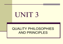 UNIT 3 QUALITY PHILOSOPHIES AND PRINCIPLES Unit Objectives Who are the quality gurus or philosophers that have shaped quality thinking and practices? What are the characteristics of contemporary quality philosophies? How has the concept of quality changed and evolved over the years? How quality principles evolve over the years? The Quality Gurus or Philosophers The Quality Gurus can be divided into four main periods: 1. The pioneer (Walter Shewhart) 2. The early Americans who took messages of quality to the Japanese in the early 1950s (W Edwards Deming, Joseph M Juran and Armand V Feigenbaum). 3. The Japanese response from the late 1950s onwards (Dr Kaoru Ishikawa, Dr Genichi Taguchi and Shigeo Shingo). 4. The new Western wave concentrating on Quality Awareness from the 1970s onwards (Philip Crosby, Tom Peters and Claus Moller). The Quality Philosophers/Gurus Walter Shewhart (1891-1967) Western Electric & Bell Telephone Engineer Father of Statistical Quality Control (SQC) Founder of the Control Chart (e.g. X-bar R chart) Originator of PDCA cycle ASQC (American Society for Quality) 1st Honorary Member 1947 William Edwards Deming Studied under Shewhart at Bell Laboratories (Awarded a Ph. d in Mathematical Physics in 1928) Western Electric Statistician Advisor, Author, Teacher & Consultant ASQC Honorary member in 1970 Invited to Japan; Led the Japanese Quality Movement Deming introduced the statistical quality-control element to Japanese industry in the 1950s. Founder, Third Wave of Industrial Revolution Bureau of Census Advisor in Population Sampling Popularized Shewhart PDCA cycle (1900-1993) PDCA CYCLE/DEMING CYCLE Standardization Future Plan Monitoring Comparing Against TARGET Problem identification Problem selection Problem analysis Cause Verification Target Setting Propose intervention Management Consent Training Implement Counter measures Joseph Moses Juran (1904-?) Joined Western Electric as an Industrial Engineer Developed the western Electric Statistical Quality Control Handbook Also well-known for helping improve Japanese quality Developed the Juran Trilogy for managing quality Enlightened the world on the concept of the vital few, trivial many which is the foundation of pareto charts Pareto Charts Pareto Charts The Pareto effect even operates in quality improvement: 80% of problems usually stem from 20% of the causes. Pareto charts are used to display the Pareto principle in action, arranging data so that the few vital factors that are causing most of the problems reveal themselves. Concentrating improvement efforts on these few will have a greater impact and be more cost-effective than undirected efforts. Philip B. Crosby (1926-2001) Vice president, Quality at International Telephone & Telegraph (ITT) Introduced the four absolutes of quality Written the book “ Quality is Free” (1979) Armand Vallin Feigenbaum (??) President/CEO, General Systems Company Founder, International Academy for Quality ASQC President (1961-63) US Army Material Command Advisor of Quality Assurance Stressed a systems approach to quality Cost of quality may be separated into costs for prevention, appraisal, and failures (e.g., scrap, warranty) Kaoru Ishikawa (1915-1989) Ph. D in Engineering A university Professor Leader of the Japanese Quality Movement Developed the Japanese Quality Strategy Developed concept of true and substitute quality characteristics Advocate the use of the 7 tools (e.g., cause-and effect diagram, pareto chart, etc.,) Advanced the use of QCC (Quality Control Circle) Developed concept of Japanese Total Quality Control/Companywide quality control (CWQC) Genichi Taguchi (1924-?) Worked in Electrical Communication Laboratory of the Nippon Telephone and Telegraph Co A visiting Professor at the Indian Statistical Institute & Visiting Research Associate at Prince University A Professor at Aoyama Gakuin U in Tokyo Director of the Japanese Academy of Quality Advisor at the Japanese Standard Association Introduced quality loss function (deviation from target is a loss to society) Promoted the use of parameter design Shigeo Shingo (1909 -1990) Graduated in Mechanical Engineering in 1930 A professional management consultant, manager, advisor and trainer President of the Institute of Management Improvement Worked in Toyota Motor Co, Matsushita Electrical Industrial Co Advocated the replacement of (SPC) with source inspection (controlling at the source rather than through sampling inspections) Developed Poka-Yoke devices/system (mistake proofing devices) such as sensors and monitors to identify defects at the point they occur “Zero defect” approach because zero defects is the ultimate goal Tom Peters Educated in engineering & business Worked as a principal at Mckinsey & Co when he wrote his book “In search of Excellence” (1982) – excellent performance within 43 large American Companies Identified leadership as being central to quality improvement process Best known for his customer orientation Describe 12 attribute or traits of quality revolution Claus Moller European – a Danish business economist Founded Time Manager International (TMI) in 1975 TMI provide management training in the Soviet Union & EEC TMI also involved with quality management training His 1st book “Personal quality” was published in 1988 The Shewhart Philosophy Shewhart was the pioneer and visionary of modern quality control. Shewhart is most widely recognized for his control chart development and statistical contributions through Bell Laboratories. Indeed, the Shewhart charts (e.g., X-bar and R charts) have become fundamental tools of quality control; but, of wider impact, Shewhart published, in 1931, Economic Control of Quality of Manufactured Product, a landmark book in modern quality control. His book was used by the Japanese after World War II, with the aid of visiting consultants, to help shape modern quality practice in Japan. The Shewhart Philosophy Shewhart, using a literal definition of quality (Latin