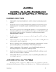 CHAPTER 2 DEFINING THE MARKETING RESEARCH PROBLEM AND DEVELOPING AN APPROACH LEARNING OBJECTIVES 1. Understand the importance of and process used for defining the marketing research problem. 2. Describe the tasks involved in problem definition including discussion with decision maker(s), interview with industry experts, secondary data analysis, and qualitative research. 3. Discuss the environmental factors affecting the definition of the research problem: past information and forecasts; resources and constraints; objectives of the decision maker; buyer behavior; legal environment; economic environment; and marketing and technological skills of the firm. 4. Clarify the distinction between the management decision problem and the marketing research problem. 5. Explain the structure of a well-defined marketing research problem including the broad statement and the specific components. 6. Discuss in detail the various components of the approach: analytical models, research questions and hypotheses, and identification of the information needed. 7. Acquire an appreciation of the complexity involved in defining the problem and developing an approach in international marketing research. 8. Describe how social media can be used to identify and define the marketing research problem and aid in developing an approach. 9. Understand the ethical issues and conflicts which arise in defining the problem and developing the approach. AUTHOR'S NOTES: CHAPTER FOCUS This chapter provides an appreciation of the importance and complexities involved in defining the marketing research problem. It provides an overview of the process and components ScholarStock 20 of an approach to a marketing research problem. The problem definition process is described. The tasks involved in problem definition are discussed. The factors affecting the environmental context of the problem are identified. The distinction and the relationship between the management decision problem and the marketing research problem are emphasized. The appropriate formulation of the marketing research problem is explained. Furthermore, the process of developing an approach is described. The components of an approach—analytical framework and models, research questions and hypotheses, and specification of the information needed—are identified and explained. This chapter is different from competing texts in that an entire chapter is devoted to the problems of defining the marketing research problem and the development of an approach to the problem. One half of an entire chapter is devoted to defining the marketing research problem. The discussion in other texts is relatively brief. The material on the errors involved in problem definition and the appropriate way of defining the problem is unique. The discussion of the development of an approach to the problem in other texts is relatively brief or even missing in many. Much of the material presented in this chapter is unique. This chapter could be taught by focusing on the opening questions sequentially. Greater emphasis could be placed on discussion with decision makers and industry experts (Learning Objective 2) and the environmental context of the problem (Learning Objective 3). The distinction between the management decision problem and the marketing research problem, as well as the definition of the marketing research problem (Learning Objective 4) should also be emphasized. The analytical framework and models, and research questions and hypotheses should be explained (Learning Objective 6). Discussions of the difficulties in international marketing research (Learning Objective 7), social media (Learning Objective 8) and ethical concerns of defining the marketing research problem and developing an approach can also be interesting and beneficial to students (Learning Objective 9). CHAPTER OUTLINE 1. 2. 3. 4. 5. 6. Overview The Importance of Defining the Problem The Process of Defining the Problem and Developing an Approach Tasks Involved i. Discussion with Decision Makers ii. Interviews with Industry Experts iii. Secondary Data Analysis iv. Qualitative Research Environmental Context of the Problem i. Past Information and Forecasts ii. Resources and Constraints iii. Objectives of the Decision Maker iv. Buyer Behavior v. Legal Environment vi. Economic Environment vii. Marketing and Technological Skills Management Decision Problem and Marketing Research Problem ScholarStock 21 7. 8. 9. 10. 11. 12. 13. 14. Defining the Marketing Research Problem Components of the Approach i. Analytical Framework and Models ii. Research Questions and Hypotheses iii. Specification of Information Needed International Marketing Research Social Media and Marketing Research Ethics in Marketing Research Summary Key Terms and Concepts Acronyms TEACHING SUGGESTIONS Learning Objective 1 * Explain the rationale behind the problem definition process. Begin by noting that a clearly defined problem serves as a guideline to the researcher in designing and conducting research properly. Thus, it helps the researcher in answering the question: what is to be done? In absence of a well-defined problem, the data collected may be worthless to the decision maker. Stress that a clearly laid down research problem leads to goal directed research, which will meet the objectives of the decision maker instead of haphazard research, which often provides incomplete information. The following example may prove instructive here. * Discuss the process of formulating the problem. Emphasize that formulating the problem is a sequential process. The first step involves discussion with the decision maker. Stress to the students that the researcher needs to understand the nature of both the problem and the decision which management faces in order to determine the underlying information needs. Sometimes discussions with industry experts, analysis of secondary data, and preliminary research are required to identify the factors that must be considered for the