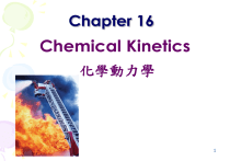 Chapter 16 Chemical Kinetics 化學動力學 1 Outline 1. The Rate of a Reaction 2. Nature of the Reactants 3. Concentrations of the Reactants: The RateLaw Expression 4. Concentration Versus Time: The Integrated Rate Equation 5. Collision Theory of Reaction Rates 6. Transition State Theory 7. Reaction Mechanisms and the Rate-Law Expression 8. Temperature: The Arrhenius Equation 9. Catalysts 2 The Rate of a Reaction • Kinetics is the study of rates of chemical reactions and the mechanisms by which they occur. • The reaction rate is the increase in concentration of a product per unit time or decrease in concentration of a reactant per unit time. • A reaction mechanism is the series of molecular steps by which a reaction occurs. 3 The Rate of a Reaction • Thermodynamics (Chapter 15) determines if a reaction can occur. • Kinetics (Chapter 16) determines how quickly a reaction occurs. – Some reactions that are thermodynamically feasible are kinetically so slow as to be imperceptible. C diamond O 2 g CO 2 g G o 298 396 kJ VERY SLOW H +aq + OH-aq H 2 O l G o298 = -79 kJ INSTANTANE OUS 4 The Rate of Reaction • Consider the hypothetical reaction, aA(g) + bB(g) cC(g) + dD(g) • equimolar amounts of reactants, A and B, will be consumed while products, C and D, will be formed as indicated in this graph: 5 The Rate of Reaction Concentrations of Reactants & Products 1.2 1 0.8 [A] & [B] [C] & [D] 0.6 0.4 0.2 0 35 0 30 0 25 0 20 0 15 0 10 50 0 0 Time • [A] is the symbol for the concentration of A in M ( mol/L). • Note that the reaction does not go entirely to 6 The Rate of Reaction • Reaction rates are the rates at which reactants disappear or products appear. • This movie is an illustration of a reaction rate. 7 The Rate of Reaction • Mathematically, the rate of a reaction can be written as: Rate = - A a t - B b t + C c t + D d t 8 The Rate of Reaction • The rate of a simple one-step reaction is directly proportional to the concentration of the reacting substance. A (g) B(g) + C(g) Rate A or Rate = kA • [A] is the concentration of A in molarity or moles/L. • k is the specific rate constant. – k is an important quantity in this chapter. 9 The Rate of Reaction • For a simple expression like Rate = k[A] – If the initial concentration of A is doubled, the initial rate of reaction is doubled. • If the reaction is proceeding twice as fast, the amount of time required for the reaction to reach equilibrium would be: A.The same as the initial time. B.Twice the initial time. C.Half the initial time. • If the initial concentration of A is halved the initial rate of reaction is cut in half. 10 The Rate of Reaction • If more than one reactant molecule appears in the equation for a one-step reaction, we can experimentally determine that the reaction rate is proportional to the molar concentration of the reactant raised to the power of the number of molecules involved in the reaction. 2 X g Yg + Zg Rate X or Rate = kX 2 2 11 The Rate of Reaction • Rate Law Expressions must be determined experimentally. – The rate law cannot be determined from the balanced chemical equation. – This is a trap for new students of kinetics. • The balanced reactions will not work because most chemical reactions are not one-step reactions. • Other names for rate law expressions are: 1. rate laws 2. rate equations or rate expressions 12 The Rate of Reaction • • Important terminology for kinetics. The order of a reaction can be expressed in terms of either: 1 each reactant in the reaction or 2 the overall reaction. Order for the overall reaction is the sum of the orders for each reactant in the reaction. • For example: 2 N 2 O 5g 4 NO2 g + O 2 g Rate = kN 2 O 5 This reaction is first order in N 2 O 5 and first order overall. 13 The Rate of Reaction • A second example is: CH3 3 CBraq OH-aq CH3 3 COHaq Br-aq Rate = k[CH3 3 CBr ] This reaction is first order in CH3 3 CBr, zero order in OH- , and first order overall. 14 The Rate of Reaction • A final example of the order of a reaction is: 2 NO + O 2 NO g 2 g Rate = k[NO] O 2 g 2 2 This reaction is second order in NO, first order in O , and third order overall 2 REMEMBER, ALL RATE EXPRESSION S ARE DETERMINED EXPERIMENTALLY 15 The Rate of Reaction • Given the following one step reaction and its rate-law expression. – Remember, the rate expression would have to be experimentally determined. 2 A g B g C g Rate = kA 2 • Because it is a second order rate-law expression: – If the [A] is doubled the rate of the reaction will increase by a factor of 4. 22 = 4 – If the [A] is halved the rate of the reaction will decrease by a factor of 4. (1/2)2 = 1/4 16 Factors That Affect Reaction Rates • 1. 2. 3. 4. • There are several factors that can influence the rate of a reaction: The nature of the reactants. The concentration of the reactants. The temperature of the reaction. The presence of a catalyst. We will look at each factor individually. 17 Nature of Reactants • This is a very broad category that encompasses the different reacting properties of substances. • For example sodium reacts with water explosively at room temperature to liberate hydrogen sodium hydroxide. 2 Na s and 2 H 2form O 2 NaOH aq H 2 g This is a violent and rapid reaction. The H 2 ignites and burns. 18 Nature of Reactants • Calcium reacts with water only slowly at room temperature to liberate hydrogen and form calcium hydroxide. Ca s 2 H 2O Ca OH2 aq H 2g This is a rather slow reaction. 19 Nature of Reactants • The reaction of magnesium with water at room temperature is so slow that that the evolution of hydrogen is not perceptible to the human eye. Mg s H 2O No reaction 20 Nature of Reactants • However, Mg reacts with steam rapidly to liberate H2 and form magnesium oxide. Mg s H 2O( g ) MgO s H 2g 100o C • The differences in the rate of these three reactions can be attributed to the changing “nature of the reactants”. 21 Concentrations of Reactant