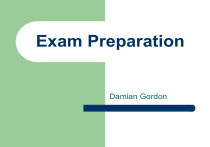 Exam Preparation Damian Gordon The Purpose of Exams The Purpose of Exams Exams test: • • • • • • • The amount you can write in a given time Whether you understand the exam question Whether you can cope with exam pressure Your ability to apply knowledge Your understanding of key concepts and theories Whether you can argue a point of view Your ability to criticise and analyse The Purpose of Exams In addition, examinations provide lecturers with a guarantee that the work being assessed is entirely the student’s own work. NB how well you do in exams is up to you! Even when students have studied a course thoroughly they can fail to do themselves justice in the exam through: – – inadequate/ inefficient revision poor exam technique Revision Revision Plan For each module, list the topics you need to cover Estimate how much time you have left to revise Assign topics as either topics you enjoy or do not enjoy Divide out your remaining time better these topics Alternating between topics you enjoy, and those you don’t Create a master timetable – BE REALISTIC Take into account all your other commitments e.g. employment, family etc. Tick off the topics as you complete them Pat yourself on the back frequently by looking back on what you have already covered. Revision Tips Reading stuff is NOT helpful Try to be active in your revision Vary the methods you use to revise, some examples ahead… Revision Tips SUMMARISE – A good starting point is to summarise the notes you have on each topic: Try to reduce your notes to key words and phrases. This will form the basis of your revision notes. Reduce your notes further so that information fits on one side of A4 or an index card (portable). Revision Tips FLASH CARDS – – – – – Get a bunch of index cards (different colours) Write down one key idea per card On one side write down the TITLE On the other write down the points associated with it Use different colours for different themes Revision Tips COVER CARDS – As you are revising from your book, read what you are trying to memorise. Use the cover card to conceal what you’ve just read. Try reciting, or reading facts from memory. Check until you are sure you have mastered the facts. Revision Tips SONGS, RHYMES – Use songs, rhymes, mnemonics and acronyms. Making up catch phrases or rhymes can help you with crucial bits of information Revision Tips I remember normalisation as; – – – – “the key, the whole key, and nothing but the key, So help me Codd” Revision Tips I remember normalisation as; Which means 1NF: Identify primary key – – – – “the key, the whole key, and nothing but the key, So help me Codd” 2NF: Identify partial dependencies 3NF: Identify Non-key dependencies BCNF: Candidate key dependencies Revision Tips DIAGRAMS – Use diagrammatical notes if you memorise material more easily in a visual form. – Use colours, highlighting and/ or different coloured paper to make the notes distinctive. Revision Tips MINDMAPS Revision Tips CONCEPT MAPS Revision Tips Mind Maps Good for an overview of a topic Good to put key details on one page Highly visual aids memory Concept Maps Good for linking information Good to apply details and knowledge to exam questions Visual easy to see how far you can apply your knowledge Revision Tips SQR3 – ACTIVE READING – Survey - Here you are attempting to gain an impression of the material. Revision Tips SQR3 – ACTIVE READING – Question - before you begin to read, draw up a mental list of questions to try to answer during reading Revision Tips SQR3 – ACTIVE READING – Read - at this point the aim is to understand what the text is saying. Try to assess the writer’s viewpoint, what the main idea is in each paragraph and how the content is structured. Keep making connections between the information in the text and what you have read in other texts or have heard about in lectures. Take note of all cross-references that you come across. Revision Tips SQR3 – ACTIVE READING – Recall - the next stage of the process is to close the text and try to remember what you have read and then note the key points. This is the longest stage. Revision Tips SQR3 – ACTIVE READING – Review - the final stage involves checking your notes against the text. Spend some time filling the gaps and correcting errors. Revision Tips QnA – – Divide a page into two columns Write down questions on one side and answers on the other Revision Tips RECORDERS – Consider using digital recorder or tape to help remember key facts. Revision Tips ACRONYM – Acronym is a word formed from the first letters or groups of letters in a name or phrase. Example: ROY G. BIV = The colors of the rainbow, in order: Red, Orange, Yellow, Green, Blue, Indigo, Violet. Revision Tips ACROSTIC – Acrostic is a series of lines from which particular letters (such as the first letters of all lines) from a word or phrase. My Very Educated Mother Just Served Us Nine Pizzas = Mercury, Venus, Earth, Mars, Jupiter, Saturn, Uranus, Neptune, Pluto Revision Tips ACROSTIC King Phillip called out fifty good soldiers. i h l r a e p n y a d m n e g l s e i u c d u s r l s i o m m y e s Revision Tips IMAGERY – – Imagery is used to memorize pairs of words. An image is formed as a result of each word given, and then two images are joined through mental visualization. Example: Piggy bank = + = Revision Tips KEYWORD METHOD Spanish word: lapiz trapeze (keyword) pencil (meaning of lapiz) Revision Tips KEYWORD METHOD Spanish word: patio (pronounced pot-o) patio pot duck (meaning of patio) Revision Tips RHYMES – – A rhyme is a saying that has similar distinctive sounds at the end of each line. Studies have shown that rhyming makes things easier to remember because it can be stored with acoustic encoding. Example: – In fourteen hundred and ninety-two Columbus sailed the Ocean Blue. – 30 Days has September, April, June, and November. All the rest have 31, except Februar