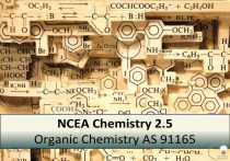 NCEA Chemistry 2.5 Organic Chemistry AS 91165 GZ Science Resources 2013 Achievement Standard This achievement standard involves demonstrating understanding of the properties of selected organic compounds. Selected organic compounds are limited to: alkanes, alkenes, alkynes, haloalkanes, primary amines, alcohols, and carboxylic acids. Properties are limited to: • structural and geometric (cis–trans) isomerism. • classification of alcohols and haloalkanes as primary, secondary or tertiary. • solubility, melting and boiling points. • chemical reactions. Chemical reactions are limited to: • addition reactions of alkenes with H2/Pt, Cl2, Br2, H2O/H+ (conc. H2SO4/H2O) and hydrogen halides (including identification of major and minor products on addition to asymmetric alkenes), polymerisation • substitution reactions of: alkanes with halogens (limited to monosubstitution) alcohols with hydrogen halides haloalkanes with ammonia • oxidation of: primary alcohols to form carboxylic acids with MnO4-/H+ or Cr2O72-/H+ alkenes with MnO4–/H+ • elimination of: water from alcohols hydrogen halides from haloalkanes • acid–base reactions of carboxylic acids and amines. Organic Chemistry We define organic chemistry as the chemistry of compounds that contain both carbon and hydrogen. Carbon has four valence electrons. The electronegativity of carbon is too small for carbon to gain electrons from most elements to form C4- ions, and too large for carbon to lose electrons to form C4+ ions. Carbon therefore forms covalent bonds with a large number of other elements, including the hydrogen, nitrogen, oxygen, phosphorus, and sulfur. Covalent bonding between atoms Covalent bonding occurs where valence electrons around atoms are shared between neighbouring atoms. This type of bonding is found between the C and H atoms in hydrocarbons and the C, H and O atoms in alcohol and is called intramolecular bonding. This bonding is very strong. The bonding between molecules is called intermolecular bonding and this is much weaker. When hydrocarbons are heated and they change state into liquids and gases it is this bonding that is broken not the covalent bonding. Note the distinction: Intra-molecular Forces: the strong bonding forces within a molecule. i.e. the covalent bonds holding the molecule together. Inter-molecular Forces: the weak bonding forces between molecules due to the attractions between partial charges. Covalent bonding between atoms Lewis diagram of CH4 (methane) Hydrogen electron Carbon electron H x x x H Cx H H Bonded pair Lewis diagrams can be used to show how atoms are arranged in a molecule and which valence electrons are used in bonding. A bonding pair of electrons can also be shown as a line: H H C H H Organic Chemistry Formula Molecular Formula – type and number of each atom. i.e. Propane C3H8 Structural Formula – placement of each atom. H Condensed Structural Formula CH3-CH2-CH3 Structural isomers are molecules with the same molecular formula but different structural formula. H C H H C H H C H H Functional groups Organic compounds are divided into main functional groups. This is determined by the type and arrangement of atoms – this determines chemical properties. The families of organic compounds which have the same general formula and functional group are called homologous series. The compounds which make up a homologous series will have same chemical properties. The selected functional groups covered at this level include alkanes, alkenes, alkynes, haloalkanes, primary amines, alcohols, and carboxylic acids. Reaction types Substitution reactions are characterized by replacement of an atom or group (Y) by another atom or group (Z). Aside from these groups, the number of bonds does not change. Addition reactions increase the number of bonds to the Carbon chain by bonding additional atoms, usually at the expense of one or more double bonds. Elimination reactions decrease the number of single bonds by removing atoms and new double bonds are often formed. Acid Base Reactions involve the transfer of a proton from the acid to the base which produces a salt and water Oxidation reactions involve a lost of electrons from the organic molecule or a gain of oxygen. An oxidant such as dichromate or permanganate is used. Polymerisation reactions join monomers together to form a polymer. Addition polymerisation breaks double bonds of alkenes and joins monomers Condensation polymerisation removes a molecule of water (H from one monomer and OH from another) and joins the two ends of the monomers together Combustion reactions require oxygen and the products are H2O and CO2 (CO or C in limited O2) Alkanes Compounds that contain only carbon and hydrogen are known as hydrocarbons. Those that contain as many hydrogen atoms as possible are said to be saturated. The saturated hydrocarbons are also known as alkanes. Alkanes Straight-chain hydrocarbons, in which the carbon atoms form a chain that runs from one end of the molecule to the other .i.e. butane H H H H H C C C C H H H H H Alkanes also form branched structures. The smallest hydrocarbon in which a branch can occur has four carbon atoms. This compound has the same formula as butane (C4H10), but a different structure. Compounds with the same formula and different structure are called structural isomers. generic formula CnH2n+2 H H H H C C C H H C H H H H Sources of Alkanes Alkanes are found in petroleum (either crude oil or natural gas). They are formed by the anaerobic decomposition of marine plant and animal organisms. The main components in new Zealand natural gas are methane (one carbon alkanes) and carbon dioxide. Crude oil is imported into New Zealand from other countries and contains a mixture of different hydrocarbons with different length carbon chains. The different chain length hydrocarbons are separated by a process called fractional distillation as they have different boiling points. Prefixes Prefixes are used to indicate numbe