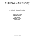 Millersville University A Guide for Student Teaching Office of Field Services Millersville University P.O. Box 1002 Millersville, PA 17551 (717) 871-5752 Revised, July 2015 TABLE OF CONTENTS Quick Reference .................................................................................................................... 1 Professional Education Unit- Conceptual Framework .......................................................... 2 Professional Education Unit- Mission and Vision Statement ................................................ 3 Student Teaching Policies and Procedures ............................................................................4 Certification Requirements ....................................................................................................6 Responsibilities of the: Student Teacher .........................................................................................................7 Cooperating Teacher ..................................................................................................8 University Supervisor ................................................................................................ 9 Teaching & Classroom Management .................................................................................... 10 Planning for Instruction .........................................................................................................11 Observation, Self-Reflection, Formative Evaluation ............................................................. 12 Formal Evaluation of Student Teaching Millersville Adapted Danielson Evaluation ............................................................... 13 Pennsylvania Statewide Evaluation Form (PDE 430) – Instructions ........................ 14 Pennsylvania Statewide Evaluation Form (PDE 430) – Form ..................................17 Appendices A) Student Teaching Absence Form .........................................................................22 B) Pennsylvania Code of Professional Ethics........................................................... 23 QUICK REFERENCE What to Do In Case Of: Situation: Call: Action: Illness or family emergencies such as illness in family, funeral, etc. Cooperating teacher and University Supervisor. Follow the instructions on Pages 4 and 5 under ‘Attendance of Student Teacher.’ Situation: Action: Anticipated absences such as job interviews, observations in other schools. Follow the instructions on Pages 4 and 5 under ‘Attendance of Student Teacher.’ Situation: Action: In-Service Days or Meetings. You are expected to attend if district permits or make arrangements with cooperating teacher to work in the classroom. Situation: Action: Inclement weather conditions which impede travel. Listen to radio or TV reports which announce whether or not your assigned school district is open or delayed. Follow your district’s schedule. Important Phone Numbers and E-Mail Addresses Student Teaching Office (717) 871-5752 student.teaching@millersville.edu Student Teaching Fax (717) 871-7945 ____________________________ University Supervisor #1 _____________ ____________________________ University Supervisor #2 _____________ ____________________________ Cooperating Teacher #1 _____________ ____________________________ Cooperating Teacher #2 _____________ ____________________________ School Office #1 _____________ ____________________________ School Office #2 _____________ ____________________________ Note: Numbers must be obtained from the University Supervisors, Cooperating Teachers, and Schools. ALWAYS check with your Cooperating Teacher and University Supervisor regarding proper procedure and permission to call the person at home. Student Teaching Website……..www.millersville.edu/studentteaching/ Affirmative Action Statement Millersville University is an Equal Opportunity/Affirmative Action institution. Coordinators: Services for Students with Disabilities- Mrs. Sherlynn Bessick, Director, Office of Learning Services, Lyle Hall, 717-872-3178; Mr. Robert Wood, Student Memorial Center (717) 871-4100; ADA Coordinator- Mr. Louis DeSol, Associate Vice President for Human Resources, Dilworth Building, 717-872-3017 A Member of the Pennsylvania State System of Higher Education. Revision July 2015 1 PROFESSIONAL EDUCATION UNIT CONCEPTUAL FRAMEWORK- ABSTRACT All members of the Millersville University Professional Education Unit will create learning communities of inquiry and action, focus on students, and demonstrates exemplary professional practices. Learning Communities of Inquiry and Action- We will engage in learning communities in which reflection, collaboration, lifelong learning, and habits of mind are developed and nurtured. Focus on Students- We will balance knowledge and the principles and the concepts delineated in professional and state standards with an appreciation of all students’ individuality, diversity, and cultures. Exemplary Professional Practices- We will demonstrate the knowledge, skills and disposition of exemplary professionals. We will have strong competence in our content knowledge, pedagogical content knowledge and skills as delineated in professional, state, and institutional standards. We will demonstrate professional dispositions or standards of conduct; will be supportive of students, families, the school, and community; and will serve as catalysts for positive and responsible change. To view the full text of the Conceptual Framework, visit the College of Education and Human Services webpage at http://www.millersville.edu/education/. NOTE: The term Students in this document and the Mission and Vision Statement refer to school-age (preschool to grade 12) students. Revision July 2015 2 PROFESSIONAL EDUCATION UNIT MISSION STATEMENT The Professional Education Unit (PEU) is committed to the preparation and continuing development of education professionals (e.g. teachers, school leaders, and professional support person