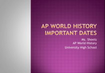 Ms. Sheets AP World History University High School Arrange each event in chronological order and if you can, assign a specific date to each. Beginnings of early river valley civilizations Beginnings of early agriculture 6000 BCE- Beginnings of agriculture 3000 BCE- Beginnings of early River Valley civilizations Definition: •Transition from nomadic life to stationary one •Hunting and gathering method replaced by farming •Agricultural development included the domestication of animals as well as the cultivation of crops Significance: •Produced a more constant and substantial food supply could support a bigger population, so population growth •Population growth settlement in villages and development of early civilizations Definition: •Mesopotamia: in between Tigris and Euphrates Rivers; Sumerians cuneiform, first writing system developed, ziggurats built for temples, The Epic of Gilgamesh; irrigation; Hammurabi’s code •Egypt: Nile River-prone to flooding; pharaoh or god-king; defined social classes; writing system developed with hieroglyphs •Indus River Valley: Harappa and Mohenjo-Daro; unpredictable and violent flooding; structured cities; Harappan writing yet to be deciphered; conquered by Aryans •Huang He River Valley: very isolated; iron-working and flood control/irrigation projects; earliest Chinese dynasty with written records is the Shang dynasty Significance: •First civilizations developing that led to rise of peoples, cultures, and dynasties within certain geographical areas Arrange each event in chronological order and if you can, assign a specific date to each. End of Han Dynasty Greek Golden Age Death of Jesus Christ/beginning of Christianity Fall of Western Roman Empire Buddha, Confucius, Lao Tsu Alexander the Great 6th century BCE- Buddha, Confucius, Lao Tsu (Buddhism, Confucianism, Daoism) 5th century BCE- Greek Golden Age 323 BCE- Alexander the Great 32 CE- Death of Jesus Christ/beginning of Christianity 220 CE- End of Han Dynasty 476 CE- Fall of Western Roman Empire Definition: •Buddha-Indian prince Saddhartha Gautama; troubled by suffering in world so spent 6 years fasting and meditating; became Buddha or the “enlightened one”; ultimate goal of nirvana reached by following Noble Eight-fold Path; rapidly spread (Silk Roads) •Confucius-believed source of good government was in maintenance of tradition which was maintained by personal standards of virtue; patriarchy and filial piety; government stability dependent on welleducated officials; beliefs gathered into Analects •Lao Tsu-adapted traditional Chinese concepts of balance in nature (yin and yang); human understanding comes from following “The Way” (a life force in nature); political involvement and education unnecessary; natural balance resolves problems Significance: •Created three dominant religions/philosophies that spread rapidly around the world via trade routes (Silk Roads) and heavily influenced culture, government, traditions, and beliefs Definition: •Period of great cultural and intellectual flourishing in ancient Greece •Philosophy-Sophocles, Aristotle, emphasis on power of human reason, stoicism •Science and math-Pythagoras, Euclidean geometry, studies of human anatomy and physiology by Galen, calculation of the circumference of the Earth by Eratosthenes, Ptolemy’s geocentric theory Significance: •Intellectual advancements produced that had great effect on scholars all over the world and in later time periods •Founded basis of mathematical and scientific understanding still used today Definition: •Son of Philip of Macedon •Invaded Greece during period of weakness after the Peloponnesian War •Conquered Greece, Egypt, Syria, Palestine, and Persia by death •Period of his rule called the Hellenistic Age because of Greek influence and cultural diffusion Significance: •Spread Hellenism (Greek culture) all over Mediterranean •Conquered large areas of land for Macedonia Definition: •Jesus believed to be Messiah sent by God •He and his 12 disciples traveled throughout the Roman province of Judea preaching •Believed to be a threat to Roman and Jewish authority and so put to death •Network of Roman roads facilitated spread of Christianity and allowed missionaries, traders, and other travelers to spread Jesus’s teachings Significance: •Gained popularity because of its appeal to all social classes but especially the poor •Gave women new status because it preached genders equal in faith •Creation of religion that heavily influenced rulers, empires, peoples, wars, and still exists today Definition: •Began to decline around 100 CE •Causes: heavy taxes levied on peasants, decline of interest in Confucian intellectual goals, poor harvests, population devastated due to disease, social unrest, decline in morality, weak emperors and heavy influence of army generals, unequal land distribution, trade decline, pressure from bordering nomadic tribes •Difficult to resist invasions from nomadic tribes so fell to neighboring tribes Significance: •After nomadic tribes invaded, led to a period of disorder and political disorganization known as Era of the Warring States •Despite threats to Chinese civilization, culture remained (Confucian tradition among the elite, rise in Daoism as peasants look for comfort) Definition: •Pax Romana came to an end •Causes of decline: ineffective emperors more concerned with luxury than with ruling, influence of army generals, decline of trade, increasing taxes, decreased money flow into the empire because conquests ceased, population decline as result of disease, poor harvests, unequal land distribution, dependence on slave labor, nonRomans in Roman army; large empire difficult to control, nomadic invasions •Huns began to migrate southwest, putting pressure on bordering nomadic tribes, Rome too weak and disorganized to resist Significance: •Led to new rule and influence in area of Roman empire •Eastern portion o