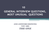 10 GENERAL INTERVIEW QUESTIONS, MOST UNUSUAL QUESTIONS AND ANSWERS SHOWING YOU ARE THE ONE 2 A few tips to begin with: questions start the minute the interview does show that you are an exceptional candidate be prepared to answer not only the typical questions, but also the unexpected expect questions regarding your qualifications, your academic preparation, career interests, experience, and ones that assess your personality. 3 1. Tell me about yourself is the most often asked question in interviews Let’s pretend this is a job intervju; you have a minute to think how to describe yourself. have a short statement prepared in your mind be careful that it does not sound rehearsed limit it to work-related items unless instructed otherwise talk about things you have done and jobs you have held that relate to the position you are interviewing for start with the item farthest back and work up to the present. 4 WEIRD THINGS SAID AT JOB INTERVIEWS Interviewer: Use three adjectives to describe yourself. He said: 'Well, as you can see, I'm a young, virile man and I'm single -- if you ladies know what I'm saying.' Then he looked at one of the fair-haired board members and said, 'I particularly like blondes.' - Petri R.J. Darby, president, Darby Darnit Public Relations "I hate questions like this." - Katrina Meistering, manager of outreach, National Fatherhood Initiative 5 2. Why did you leave your last job? stay positive regardless of the circumstances never refer to a major problem with management and never speak ill of supervisors, co-workers or the organization; if you do, you will be the one looking bad keep smiling and talk about leaving for a positive reason such as an opportunity, a chance to do something special or other forward-looking reasons. WEIRD THINGS SAID AT JOB INTERVIEWS "I was fired from my last job because they were forcing me to attend anger management classes." - Smith 6 3. What experience do you have in this field? speak about specifics that relate to the position you are applying for or if you do not have specific experience, get as close as you can 4. Do you consider yourself successful? always answer yes and briefly explain why; a good explanation, e.g. would be that you have set goals, and you have met some and are on track to achieve the others. 5. What do co-workers say about you? be prepared with a quote or two from co-workers, either a specific statement or a paraphrase will work. 7 6. What do you know about this organization? do some research on the organization before the interview find out where they have been and where they are going, what are the current issues and who are the major players 7. What have you done to improve your knowledge in the last year? try to include improvement activities that relate to the job mention a wide variety of activities as positive selfimprovement have some good ones handy to mention 8 8. Are you applying for other jobs? be honest but do not spend a lot of time in this area keep the focus on this job and what you can do for this organization, anything else is a distraction 9. Why do you want to work for this organization? be careful, this may take some thought and certainly, should be based on the research you have done on the organization sincerity is extremely important here and will easily be sensed relate it to your long-term career goals. Wrong answers: "Just for the benefits." - Jennifer Juergens, JJ Communications "My old boss didn't like me, so one day, I just left and never came back. And here I am!" - Matt Cowall, communications manager, Appia Communications 9 10. Do you know anyone who works for us? be aware of the policy on relatives working for the organization be careful to mention a friend only if they* are well thought of 11. What kind of salary do you need? do not answer it, it’s a loaded question, a nasty little game that you will probably lose if you answer first instead say something like, ”That's a tough question. Can you tell me the range for this position?” In most cases, the interviewer, taken off guard, will tell you. if not say that it can depend on the details of the job and give a wide range. ______________ * remember politically correct language 10 12. Are you a team player? you are, of course, a team player be sure to have examples ready say you often perform for the good of the team rather than for yourself emphasize your team attitude do not brag, just say it in a matter-of-fact tone; this is a key point 13. How long would you expect to work for us if hired? don’t be specific, something like this should work: ”I'd like it to be a long time.” or ”As long as we both feel I'm doing a good job.” 11 14. Have you ever had to fire anyone? How did you feel about that? do not make light of it or in any way seem like you like to fire people, this is serious say you will do it when it is the right thing to do; when it comes to the organization vs. the individual who has created a harmful situation, you will protect the organization remember firing is not the same as layoff or reduction in force. 15. What is your philosophy towards work? don’t offer the interviewer a long or flowery dissertation here express your strong feelings that the job gets done give a short and positive answer which would show a benefit to the organization – that’s the type of answer that works best here 12 16. If you had enough money to retire right now, would you? answer yes if you would say no if you need to work and this is just the type of work you prefer do not say yes if you do not mean it 17. Have you ever been asked to leave a position? say no if you have not say yes if you have be honest, brief and avoid saying negative things about the people or organization involved 13 18. Explain how you would be an asset to this company highlight your best points as they relate to the position being discussed a pun: "Well, I do own a bike." 19. Why should we hire you? point out how your assets meet what the organization