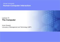 Virtual University Human-Computer Interaction Lecture 13 The Computer Imran Hussain University of Management and Technology (UMT) 1 Virtual University - Human Computer Interaction © Imran Hussain | UMT In the Last Lecture • Conceptual Models • Visibility • Affordance • Constraints • Mapping • Consistency • Feedback 2 Virtual University - Human Computer Interaction © Imran Hussain | UMT In Today’s Lecture • Text Entry Devices • Positioning, Pointing and Drawing • Display Devices • 3D Interaction and Virtual Reality • Physical Controls and Sensors • Paper: Printing and Scanning 3 Virtual University - Human Computer Interaction © Imran Hussain | UMT The Computer a computer system is made up of various elements each of these elements affects the interaction – input devices – text entry and pointing – output devices – screen (small&large), digital paper – virtual reality – special interaction and display devices – physical interaction – e.g. sound, haptic, bio-sensing – paper – as output (print) and input (scan) – memory – RAM & permanent media, capacity & access – processing – speed of processing, networks 4 Virtual University - Human Computer Interaction © Imran Hussain | UMT Interacting With Computers to understand human–computer interaction … need to understand computers! what goes in and out devices, paper, sensors, etc. what can it do? memory, processing, networks 5 Virtual University - Human Computer Interaction © Imran Hussain | UMT A ‘Typical’ Computer System • screen, or monitor, on which there are windows • keyboard • mouse/trackpad window 1 window 2 • variations – desktop – laptop – PDA 12-37pm the devices dictate the styles of interaction that the system supports If we use different devices, then the interface will support a different style of interaction 6 Virtual University - Human Computer Interaction © Imran Hussain | UMT Levels of Interaction Long ago in a galaxy far away … batch processing – punched card stacks or large data files prepared – long wait …. – line printer output … and if it is not right … Now most computing is interactive – rapid feedback – the user in control (most of the time) – doing rather than thinking … Is faster always better? 7 Virtual University - Human Computer Interaction © Imran Hussain | UMT Richer interaction sensors and devices everywhere 8 Virtual University - Human Computer Interaction © Imran Hussain | UMT Text Entry Devices • Keyboards (QWERTY et al.) • Chord keyboards • Phone pads • Handwriting • Speech 9 Virtual University - Human Computer Interaction © Imran Hussain | UMT Keyboards • Most common text input device • Allows rapid entry of text by experienced users • Keypress closes connection, causing a character code to be sent • Usually connected by cable, but can be wireless 10 Virtual University - Human Computer Interaction © Imran Hussain | UMT Keyboards • Alphanumeric – QWERTY – Alphabetic – DVORAK • Chord 11 Virtual University - Human Computer Interaction © Imran Hussain | UMT QWERTY Keyboard • Standardised layout but … – non-alphanumeric keys are placed differently – accented symbols needed for different scripts – minor differences between UK and USA keyboards • QWERTY arrangement not optimal for typing – layout to prevent typewriters jamming! • Alternative designs allow faster typing but large social base of QWERTY typists produces reluctance to change. 12 Virtual University - Human Computer Interaction © Imran Hussain | UMT QWERTY Keyboard 2 1 Q 4 3 W E S A Z 5 R D X 6 C T F Y G V 8 7 U H B N 9 I J M 0 O K P L , . SPACE 13 Virtual University - Human Computer Interaction © Imran Hussain | UMT Alternative Keyboard Layouts Alphabetic – – – – keys arranged in alphabetic order not faster for trained typists not faster for beginners either! Used in some pocket electronic organisers DVORAK – – – – – 14 common letters under dominant fingers biased towards right hand common combinations of letters alternate between hands 10-15% improvement in speed and reduction in fatigue But - large social base of QWERTY typists produce market pressures not to change Virtual University - Human Computer Interaction © Imran Hussain | UMT Special Keyboards • • Designs to reduce fatigue for RSI For One Handed Use e.g. the Maltron left-handed keyboard 15 Virtual University - Human Computer Interaction © Imran Hussain | UMT Chord Keyboards • • only a few keys - four or 5 letters typed as combination of key presses • Can be used – – • For one-handed operation In cramped conditions compact size – ideal for portable applications • short learning time – key presses reflect letter shape • fast – once you have trained BUT - social resistance, plus fatigue after extended use NEW – niche market for some wearable 16 Virtual University - Human Computer Interaction © Imran Hussain | UMT Phone Pad and T9 Entry • use numeric keys with multiple presses 2–abc 6-mno 3-def 7-pqrs 4-ghi 8-tuv 5-jkl 9-wxyz hello = 4433555[pause]555666 surprisingly fast! • T9 predictive entry – – – – 17 type as if single key for each letter use dictionary to ‘guess’ the right word hello = 43556 … but 26 -> menu ‘am’ or ‘an’ Virtual University - Human Computer Interaction © Imran Hussain | UMT Numeric Keypads • for entering numbers quickly: – calculator, PC keyboard • for telephones 1 2 3 7 8 9 not the same!! 4 5 6 4 5 6 7 8 9 1 2 3 * 0 # 0 . = ATM like phone telephone 18 Virtual University - Human Computer Interaction calculator © Imran Hussain | UMT Handwriting Recognition • Text can be input into the computer, using a pen and a digesting tablet – natural interaction – Small but accurate • Technical problems: – capturing all useful information - stroke path, pressure, etc. in a natural manner – segmenting joined up writing into individual letters