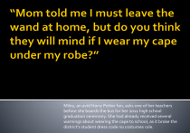 Miley, an avid Harry Potter fan, asks one of her teachers before she boards the bus for her 2011 high school graduation ceremony. She had already received several warnings about wearing the cape to school, as it broke the district’s student dress code no costumes rule. Amy explains to those that pass by her that her flower vase and checkerboard picnic tablecloth were they to stay. She continued setting up her picnic every day after school during the second semester of her junior year. Natasia describes the night the she came home from the hospital after receiving 12 stitches in her head. He foster brother came home mad, threw a hammer across the room and cracked open her skull. Monica, the leader of the Japanese Culture Club, talks about her club’s annual tea party. While a couple of the club’s members come wearing kimonos with their converse, many just opt to wear their blue jeans and Tshirts for the event. FEATURE WRITING A feature story is a journalistic article that tends to take a narrative approach, using opening paragraphs to establish a scene and hook the reader. A feature story shares a lot of the characteristics of short fiction writing (plot, character, setting, conflict, theme) but it requires that all the elements be 100 percent factual. A feature story is about people or groups of people A feature story has a theme or a specific topic A feature story can show a “slice of someone’s life,” be about a dramatic situation, give information to accompany a main news story, dig deep and investigate a topic, explain the background situation for a news event, enlighten readers on universal topics through the perspective of those “in the know” FEATURE WRITING FEATURE WRITING Powerful lead Show the face (character) of the story Open with the specific, full of details and description to flesh out the setting of the story Set the tone of the story by hinting at the plot and upcoming conflict The girl in the window, Lane DeGregory, Times Staff Writer, Posted: Jul 31, 2008 04:35 PM The girl in the window, Lane DeGregory, Times Staff Writer, Posted: Jul 31, 2008 04:35 PM Diving headlong into a sunny paradise , By Lane DeGregory, Times Staff Writer, In Print: Monday, May 30, 2011 Diving headlong into a sunny paradise , By Lane DeGregory, Times Staff Writer, In Print: Monday, May 30, 2011 Largo park keeper says goodbye to his escaped owl friend By Lane DeGregory, In Print: Monday, February 14, 2011 Largo park keeper says goodbye to his escaped owl friend By Lane DeGregory, In Print: Monday, February 14, 2011 The young Egyptian professional could pass for any New York bachelor. Dressed in a crisp polo shirt and swathed in cologne, he races his Nissan Maxima through the rainslicked streets of Manhattan, late for a date with a tall brunette. At red lights, he fusses with his hair. What sets the bachelor apart from other young men on the make is the chaperon sitting next to him -- a tall, bearded man in a white robe and stiff embroidered hat. The imam of a Bay Ridge mosque, Mr. Shata, serves as a chaperone to some 550 "marriage candidates.” The meetings often unfold on the green velour couch of his office, or over a meal at his favorite Yemeni restaurant on Atlantic Avenue. Tending to Muslim Hearts and Islam's Future By: Andrea Elliott March 7, 2006 FEATURE WRITING Nut graph Usually one sentence, but may be two to three Goes from the very narrow focused lead to a more broad theme statement Works like a news story lead to provide a summary Writer may use critical thinking to provide the summary. *If attribution of facts is not in the nut graph (which is okay but may make the graph feel like it has been editorialized), then evidence supporting the conclusion drawn in the nut graph must be attributed as the story continues Nut graph Provides a justification of why the reader should care and why the story is important May provide a news peg and a future date– a newsworthy event that justifies the writing of the feature story and explains why the story is timely. (If news peg is not in the nut graph and there is one available, it should be placed within 2-4 paragraphs after the nut graph). To Young To Diet? By Christopher Scanlan Knight Ridder Newspapers Feb. 19, 1994 To Young To Diet? By Christopher Scanlan Knight Ridder Newspapers Feb. 19, 1994 UIL Wrap Up Slideshow Presentation by Jeanne Acton LEAD Some people say they would give the shirt off their back to help people in need. Junior Salvador Sanchez gave the roof over his head. NUT GRAPH In February, Salvador convinced his parents to sell their 4,500-square-foot home and move into a smaller, less expensive home in a nearby neighborhood. Then he convinced them to donate the profit from the sale, about $175,000, to two local charities, the Capital Area Food Bank and The Bridge Project. DIRECT QUOTE “We are a very blessed family,” Salvador said. “We live a life of ease. We have food on our table every night. We buy the things we want — big screen televisions, video games, nice clothes, nice cars, etc. But our world, our community, is not as blessed.” --CON’T UIL Wrap Up Slideshow Presentation by Jeanne Acton TRANSITION/NEWS PEG Salvador and his family will be honored by the City Council on Tuesday. At that meeting, the council will issue a challenge to the community to match the family’s donation by June 1. People can donate directly to either charity or through leaguetownhall.org. FEATURE WRITING The body For beginners, use basic chronology Lead with a dramatic moment ▪ Use nut graph to reveal theme and to flash back to where the story needs to start Follow a typical plot sequence: beginning, middle, end ▪ Exposition (setting/characters/situation)—*Nut Graph*-Conflict/Rising Action– Climax—Falling Action— Resolution Other writing devices for the more advanced Story within a story Side story Foreshadowing Flashback Plot twist Incluing or infodumping background information Non linear story telling Note: S