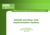 Office of Air Quality Planning and Standards NAAQS and Other CAA Implementation Updates Laura McKelvey National Tribal Forum May 2014 Overview of Presentation NAAQS Schedules and Implementation Updates Ozone PM2.5 SO2 Other NAAQS Exceptional Events Interstate Pollution Transport Air Toxics Program Startup, Shutdown and Malfunction Carbon Rule Petroleum Refineries Appendix 2 NAAQS: ANTICIPATED SCHEDULES & IMPLEMENTATION UPDATE 3 NAAQS Reviews: Status Update (as of May 2014) Last Review Completed Ozone Lead Primary NO2 Primary SO2 Mar 2008 Oct 2008 Jan 2010 Jun 2010 Secondary NO2 and SO2 PM CO Mar 2012 Dec 2012 Aug 2011 Kickoff workshop for next review targeted for early 2015 Kickoff workshop for next review targeted for 2015 (final rule signed) Feb 2014 Draft REAs nd 2 Draft PA 2nd Recent or Upcoming Major Milestone(s)1 Mar 25-27, 2014 CASAC review meeting Nov 2013 Draft ISA 1st Spring 2014 Final PA 2014 Proposed rule Feb 2014 Draft IRP Mar 12-13, 2014 CASAC review meeting Mar 2014 Draft IRP Apr 22, 2014 CASAC review meeting Mar 4-6, 2014 Kickoff workshop for next review Summer 2014 Draft IRP Dec 1, 2014* Proposed rule Oct 1, 2015* Final rule Additional information regarding current and previous NAAQS reviews is available at: http://www.epa.gov/ttn/naaqs/ IRP – Integrated Review Plan; ISA – Integrated Science Assessment; REA – Risk and Exposure Assessment; PA – Policy Assessment * Court ordered dates per April 29, 2014 ruling 1 4 Anticipated NAAQS Implementation Milestones (updated May 2014) Pollutant Final NAAQS Date Infrastructure SIP Due Designations Effective Attainment Plans Due Attainment Date PM2.5 (2006) Oct 2006 Oct 2009 Dec 2009 Dec 2014 Dec 2015 (Mod) Dec 2019 (Ser) Pb (2008) Oct 2008 Oct 2011 Dec 2010/2011 June 2012/2013 Dec 2015/2016 NO2 (2010) (primary) Jan 2010 Jan 2013 Feb 2012 N/A N/A SO2 (2010) (primary) June 2010 June 2013 Oct 2013* (+2 rounds) April 2015 Oct 2018 Ozone (2008) Mar 2008 Mar 2011 July 2012 Mid 2015/2016 2015/2032 PM2.5 (2012) Dec 2012 Dec 2015 Early 2015 Mid 2016 Dec 2021 (Mod) Dec 2025 (Ser) Ozone 2015 Oct 2015 Oct 2018 Dec 2017 Dec 2020/21 2020-2037 5 2008 Ozone NAAQS Implementation Revised primary 8-hr Ozone standard in 2008 (75 ppb) EPA designations for the 2008 Ozone NAAQS effective on July 20, 2012 Litigation on certain final area designations Petition seeking redesignation to nonattainment of areas initially designated as attainment 2008 Ozone NAAQS SIP Requirements Rule Proposed May 29, 2013 (78 FR 34178) Anticipate final rule in Fall 2014 Attainment plans and demonstrations due July 2015 (Moderate) or July 2016 (Serious and above) 6 Overview of Preliminary Staff Conclusions on Ozone Primary Standard o o Current evidence and exposure/risk information call into question the adequacy of public health protection at by current standard (75 ppb) It is appropriate to consider revising the standard to provide greater public health protection, with range of levels from 70 ppb to 60 ppb, in conjunction with the current indicator (O3), averaging time (8-hour), and form (3 year average of 4th highest daily maximum) Secondary Standard o o Current evidence and exposure/risk information call into question the adequacy of public welfare protection provided by current standard (75 ppb) It is appropriate to consider revising the standard to provide greater public welfare protection, focusing on a W126-based cumulative seasonal metric and a range of levels from somewhat above 15 ppm-hrs down to 7 ppm-hrs (3 year average) Staff conclusions in final PA will reflect CASAC review and consideration of public comments 7 Current Ozone NAAQS Review Received court ruling on April 29, 2014 Propose December 1, 2014 Final October 1, 2015 Planning is underway to coordinate the implementation activities and to ensure early involvement similar to previous implementation rules: FACA formed in 1995 to address Ozone, PM and RH implementation for the 1997 standard/rules Topic for discussion on next NTAA call Other interactions?? 8 PM2.5 NAAQS Review EPA revised the annual primary PM2.5 NAAQS to 12 μg/m3 from the previous level of 15 μg/m3 on December 14, 2012 NAAQS effective date: March 18, 2013 Legal challenge filed by industry related to the annual primary PM2.5 standard, near-road monitoring, and implementation-related issues 9 PM2.5 NAAQS Implementation Designations Guidance April 2013 guidance on Initial Area Designations for the 2012 Revised Primary Annual Fine Particle National Ambient Air Quality Standard http://www.epa.gov/pmdesignations/2012standards/docs/april 2013guidance.pdf Available data sets to facilitate area analyses, and interactive designations tools are available on the PM2.5 designations website at http://www.epa.gov/pmdesignations/2012standards/techinfo.h tm and http://geoplatform2.epa.gov/PM_MAP/index.html (PM Designations Mapping Tool) 10 PM2.5 NAAQS Implementation Status of Designations State and Tribal recommendations were due to EPA by December 13, 2013 EPA received recommendations from 50 states, 2 territories, D.C. and 6 tribes 5 states (PA, OH, IL, IA and CA) recommended a total of 15 nonattainment areas (including 39 whole or partial counties) Most states based their recommendations on 2010-2012 data; some used preliminary 2013 data (final 2013 data available after the May 1, 2014, data certification date) Next Steps EPA intends to notify states/tribes of intended modifications to recommendations in “120-day” letters by August 2014 Final designations expected in December 2014 PM2.5 NAAQS SIP Requirements NPRM Propose rule early fall 2014 Finalize as close as possible to effective date of designations for the 2012 PM2.5 NAAQS (in 2015) 11 2010 SO2 NAAQS Implementation Revised primary SO2 standard: June 2010 (75 ppb/1-hr) SO2 Area Designations and Implementation Strategy released February 2013 Designations and Implementation Guidance and Assistance o Issued PSD permit modeling guidance documents applicable to the 1-hr SO2 NAAQS on August 23