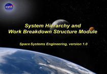 System Hierarchy and Work Breakdown Structure Module Space Systems Engineering, version 1.0 Space Systems Engineering: System Hierarchy Module Module Purpose: System Hierarchy To show how one view of the system architecture is captured by the product breakdown structure (PBS). To describe the benefits and costs of creating a system hierarchy. To show how to capture all of the work necessary for a project by adding the non-product work to the PBS to create the work breakdown structure (WBS). Space Systems Engineering: System Hierarchy Module 2 One View of the Architecture - The Product Breakdown Structure The framework and interrelationships of elements of a system. Typically illustrated by both a pictorial and a decomposition diagram depicting the segments and elements and their interfaces and interrelationships. Architecture is described by the System Hierarchy or Product Breakdown Structure (PBS) Space Systems Engineering: System Hierarchy Module 3 Why Break a Product Down? Breaking a large complex problem (project) into smaller pieces makes them easier to solve since the problems are smaller and specialists can focus on their functional areas. But this process of reductionism creates some new problems. Namely, New interfaces are created between the pieces (subsystems), so they must be defined and managed. System resources (e.g., mass or power) must be allocated to the subsystems and these allocations must be accounted for; and System performance is also allocated to subsystems, so confidence must be established that if all of the subsystems perform as desired, then the system will perform as desired. The creation of the system architecture, the description and management of interfaces, the allocation of resources and performances, and establishing confidence that these allocations are appropriate are all systems engineering responsibilities. Space Systems Engineering: System Hierarchy Module 4 More Value to Creating A System Hierarchy Organizes the work required to complete a flight project. Contains all hardware items, software items, and information items (e.g., documents, databases). Provides the basis for functional analysis. Characteristics: • • • • Top-down, Product-based, Lowest level maps to cognizant engineer or manager, Branch points in hierarchy show how elements will be integrated. Space Systems Engineering: System Hierarchy Module 5 Hierarchical Level Names and Examples Hierarchical Level Name Examples Mission Needs + Objectives + Operation of Everything Necessary to Meet the Objectives System* Total System = Spacecraft + Launch Vehicle + Ground Support Equipment + Communications Systems (TDRSS , etc.) + NASCOM + POC + Science Data Center + ...+ Personnel Segment Flight = Spacecraft Bus + Instruments + Launch Vehicle +... Element Spacecraf t = Structure + Pow er + C&DH + Thermal + ... Subsystem Power = Solar Arrays + Electronics + Battery + Fuses + ... Component Solar Arrays = Solar Cells + Interconnects + Cover Glass + ... Part Solar Cells * Any given system can be organized into a hierarchy composed of segments and/or elements of succeedingly lower and less complex levels, which may in themselves be termed “systems” by their designers. In order to avoid misunderstandings, hierarchical levels for a given mission must be defined early. Space Systems Engineering: System Hierarchy Module 6 System Hierarchy (1/2) Hierarchy/Hierarchical Levels - The relationship of one item of hardware/software with respect to items above and below in the relative order of things. Mission - An individual system or groups of systems operated to meet a specific set of objectives. System - A composite of hardware, software, skills, personnel, and techniques capable of performing and/or supporting an operational role. A complete system includes related facilities, equipment, materials, services, software, technical data, and personnel required for its operation and support to the degree that it can be considered a self-sufficient unit in its intended operational and/or support environment. • The system is what is employed operationally and supported logistically. (More than one system may be needed to conduct a mission.) Space Systems Engineering: System Hierarchy Module 7 System Hierarchy (2/2) Segment - A grouping of elements that are closely related and which often physically interface. It may consist of elements produced by several organizations and integrated by one. Element - A complete, integrated set of subsystems capable of accomplishing an operational role or function. Subsystem - A functional grouping of components that combine to perform a major function within an element. Component - A functional subdivision of a subsystem and generally a self-contained combination of items performing a function necessary for subsystem operation. A functional unit viewed as an entity for purpose of analysis, manufacturing, testing, or record keeping. Part - A hardware element that is not normally subject to further subdivision or disassembly without destruction of designated use. Space Systems Engineering: System Hierarchy Module 8 System Hierarchy Example - Space Shuttle System Segment Element Subsystem System hierarchy is also referred to as the Product Breakdown Structure (PBS). Space Systems Engineering: System Hierarchy Module 9 How complicated it can get… The yellow boxes represent the bottom-level end products. Space Systems Engineering: System Hierarchy Module 10 Work Breakdown Structure (WBS) Definition A hierarchical breakdown of the work necessary to complete a project. The WBS should be a product-based, hierarchical division of deliverable items and associated services. The WBS is based on the System Hierarchy or Product Breakdown Structure (PBS), with the specified prime products at the top, and the systems, segments, subsystems, etc. at successive lower levels. At the lowest level are products, such as hardware and software for which there is a cognizant engineer or mana