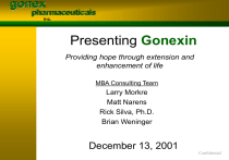 gonex pharmaceuticals inc. Presenting Gonexin Providing hope through extension and enhancement of life MBA Consulting Team Larry Morkre Matt Narens Rick Silva, Ph.D. Brian Weninger December 13, 2001 Confidential gonex pharmaceuticals inc. Concept Gonexin is a revolutionary, patented “smart drug” for cancer treatment. We have the expertise to guide Gonexin to commercial success in a market with huge profit potential. Confidential gonex pharmaceuticals inc. Introduction Opportunity Technology Financial Summary Questions Management and Leadership Dr. Paul Jarosz •Chief Operating Officer •Involved in commercial development of 58 pharmaceutical products •Clinical development executive with Geneva Pharmaceuticals (Novartis), Johnson & Johnson, and Syntex (Roche) Confidential gonex pharmaceuticals inc. Introduction Opportunity Technology Financial Summary Questions Management and Leadership Dr. Terry Nett •Cofounder and board member •Internationally recognized expert in GnRH biology Dr. Mike Glode •Cofounder and board member •Internationally recognized researcher in prostate cancer biology •Consultant on clinical trials for Leupron and Abarelix Confidential gonex pharmaceuticals inc. Introduction Opportunity Technology Financial Global Pharmaceutical Market $400 B 2003 Summary Questions Chemopreventatives $0.23 0.06% Blood Cell Factors $7.73 1.9% Non cancer, w orldw ide pharmaceutical market $370.0 92.9% Immunotherapies $0.14 0.04% Other $5.77 1.4% 0.00% Total Worldw ide Cancer Drug Sales $29.02 7.1% Chemotheraeutics $15.15 3.8% Confidential gonex pharmaceuticals inc. Introduction Opportunity Technology Financial Summary Questions Industry Trends • Trend away from toxic to “smart drugs” • Shift from healthcare spending to pharmaceutical spending • Small R & D firms have innovative advantage Confidential gonex pharmaceuticals inc. Introduction Opportunity Technology Financial Summary Questions Market Growth Potential • Up to 15% growth in human pharmaceutical market • High risk begins at age 50 • Aging population Confidential gonex pharmaceuticals inc. Our Position Introduction Opportunity Technology Financial High Efficacy Gonexin Summary Questions Chemotherapeutic Agents Non-Toxic Toxic Radiation Therapy Hormone Therapy Agents Surgery Immunotherapy and Angiostatic Agents Low Efficacy Confidential gonex pharmaceuticals inc. Market Share Growth Introduction Opportunity Technology Financial % penetration Summary Questions 100 90 80 70 60 50 40 30 20 10 0 Year 1 Gonexin Market Share Year 2 Year 3 Year 4 Year 5 79,000 late stage cases of prostate cancer Confidential treated annually gonex pharmaceuticals inc. Introduction Opportunity Technology Financial Summary Questions Marketing Strategy • Industry publications Confidential gonex pharmaceuticals inc. Introduction Opportunity Technology Financial Marketing Strategy • Trade shows Summary Questions Confidential gonex pharmaceuticals inc. Introduction Opportunity Technology Financial Marketing Strategy • Annual scientific and clinical meetings Summary Questions •Dedicated direct sales team •Web presence Confidential gonex pharmaceuticals inc. Introduction Opportunity Technology Financial Summary Questions Bright Future • We are an innovative Research and Development organization • Other potential indications for Gonexin – Breast cancer – Colon cancer – Uterine cancers – Pancreatic cancer – Some forms of lung cancer Confidential gonex pharmaceuticals inc. Introduction Opportunity Technology Financial Summary Questions The Product • Gonexin • Two therapeutic indications- Prostate Cancer •Hormone therapy •Chemotherapy • Leupron, Zolodex, and Viadur only offer hormone therapy mechanism • Other Epithelial Cancers Confidential gonex pharmaceuticals inc. Introduction Opportunity Technology Financial Normal Physiology GnRH Summary Questions Receptor Gonadotroph Non Target Cell Confidential gonex pharmaceuticals inc. Introduction Opportunity Technology Financial Normal Physiology GnRH Summary Questions Receptor Gonadotroph Non Target Cell Confidential gonex pharmaceuticals inc. Introduction Opportunity Technology Financial Normal Physiology GnRH Summary Questions Receptor Gonadotroph Non Target Cell Confidential gonex pharmaceuticals inc. Introduction Opportunity Technology Financial Summary Questions Normal Physiology GnRH Receptor Gonadotroph Non Target Cell Confidential gonex pharmaceuticals inc. Introduction Opportunity Technology Financial Normal Physiology Summary Questions GnRH Receptor Gonadotroph Non Target Cell Confidential gonex pharmaceuticals inc. Introduction Opportunity Technology Financial Normal Physiology Summary Questions GnRH Receptor Gonadotroph Non Target Cell Confidential gonex pharmaceuticals inc. Introduction Opportunity Technology Financial Normal Physiology Summary Questions GnRH Receptor Gonadotroph Non Target Cell Testosterone Confidential gonex pharmaceuticals inc. Introduction Opportunity Technology Financial Normal Physiology Summary Questions GnRH Receptor Gonadotroph Non Target Cell Testosterone Confidential gonex pharmaceuticals inc. Introduction Opportunity Technology Financial Normal Physiology Summary Questions GnRH Receptor Gonadotroph Non Target Cell Testosterone Confidential gonex pharmaceuticals inc. Introduction Opportunity Technology Financial Normal Physiology Summary Questions GnRH Receptor Gonadotroph Non Target Cell Testosterone Confidential gonex pharmaceuticals inc. Introduction Opportunity Technology Financial Normal Physiology Summary Questions GnRH Receptor Gonadotroph Non Target Cell Testosterone Confidential gonex pharmaceuticals inc. Introduction Opportunity Technology Financial Hormone Therapy Mechanism Leupron Summary Questions Receptor Gonadotroph Non Target Cell Confidential gonex pharmaceuticals inc. Introduction Opportunity Technology Financial Hormone Therapy Mechanism Leupron Summary Questions Receptor Gonadotroph Non Target