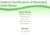 Indirect Gasification of Municipal Solid Waste Team Bravo Eleftherios Avtzis David Garcia Bryan Isles Zack Labaschin Alena Nguyen Mentor Dan Rusinak Che 397 - Team Bravo Overview • • • • • • • Design Basis Economics Block Flow Diagram Sample Calculations Conceptual Control Scheme Plant Plot Recommendations Che 397 - Team Bravo Design Basis • Project Design Goals • Indirect Gasification of Refuse-Derived Fuel using TBE Process • Providing High Quality Synthesis Gas to Team Alpha’s Specifications • Location: Newton County Landfill in Brooke, IN • Environmentally Friendly Process Che 397 - Team Bravo Design Basis •Commercial Scale Production •13,000 tons per day MSW • 6,000+ tons per day Syngas •Ideal Max. Output 7,100 tons per day •Scale-up Available Engineering Specifications Team Bravo Syngas Syngas (tons/day) Max. tons/day from 11,025 tons/day RDF 7,105 Team Alpha Syngas Specification Pressure 725 psi Temperature 518°F Min. tons/day 6,000 H2/CO Ratio 2 Che 397 - Team Bravo Economics This table displays the selective economics for year zero, one, five, eight, fifteen, and twenty. The project life is projected for twenty years. The net present value and internal rate of return are also displayed. IRR = 32.23% Che 397 - Team Bravo Economics This table displays the cost for selected processes and units required for Team Bravo’s indirect gasification of municipal solid waste. The capital cost as well as the operations, utilities, salaries, and annual cost in total are also listed. 332 Days in Op. Process Stage Acid Cleanup ZnO and Pot Still SMR and WGS Comp., HX and Misc. TBE Process RDF Processing Single Cost TIC $25,730,610 $9,326,704 $101,575,592 $100,965,603 $300,000,000 $112,665,824 CO2 Removal Olivine Disposal Raw Materials $25,730,610 N/A N/A N/A Capital Cost Total Op. Total Utilities Salaries Total Annual Costs $675,994,943 N/A N/A N/A N/A Che 397 - Team Bravo Annual Costs Utilities Op. Costs $726,218 $3,230,000 $32,438 $927,545 $36,406 $870,919 $88,400,000 $101,000,000 In Above In Above In Above In Above $726,218 N/A N/A N/A 3230000 $1,412,137 $3,205,769 $1,912,137 N/A $113,876,370.18 $89,921,280.80 $3,960,000 $207,757,650.98 Block Flow Diagram Streams Reflect PFD Return to landfill 5, 11,14 1 MSW MSW Processing Ash to landfill RDF Sulfur Halogens Hazardous materials 27,36 Gasifier 19 Raw SynGas 28 10 Cooling & Cleaning 42 51 Steam Electrical grid Electricity 71, A3, A4 Steam Generation 68,70 57 52 CO2 Team Alpha Gasoline Production SynGas at spec. 64 CO2 Removal 65 Che 397 - Team Bravo Methane Reforming 53 Clean SynGas Water Gas Shift A2 Block Flow Diagram Streams Reflect PFD 27, 36 Ash to landfill 1 MSW 964,512 Ib/Hr MSW Processing RDF 19 918,583 Ib/Hr 72 lb/Hr Olivine 21,954 Ib/Hr Ash TBE Gasification 20 5,11,14 Steam Return to landfill 365,600 Ib/Hr Che 397 - Team Bravo Raw SynGas 28 8,301 Ib/Hr NH3 740,221 Ib/Hr CO2 259,924 Ib/Hr CO 7,395 Ib/Hr C2H6 39,095 Ib/Hr C2H4 55,206 Ib/Hr H2 1,616 Ib/Hr HCl 3,020 Ib/Hr H2S 55,448 Ib/Hr CH4 71,381 Ib/Hr H2O Block Flow Diagram Streams Reflect PFD Raw SynGas 28 71,381 lb/Hr H2O 740,221 lb/Hr CO2 259,924 lb/Hr CO 55,448 lb/Hr CH4 55,206 lb/Hr H2 39,095 lb/Hr C2H4 7,395 lb/Hr C2H6 3,020 lb/Hr H2S 1,616 lb/Hr HCl 8,301 lb/Hr NH3 Cooling & Cleaning 51 2,071,381 Ib/Hr H2O 264,933 Ib/Hr CO2 2,866 Ib/Hr H2S 71,000 Ib/Hr MDEA 475,288 lb/Hr CO2 252,477 lb/Hr CO 51,619 lb/Hr CH4 55,098 lb/Hr H2 25,815 lb/Hr C2H4 3,330 lb/Hr C2H6 Che 397 - Team Bravo 42 Block Flow Diagram Streams Reflect PFD Clean SynGas 475,288 252,477 51,619 55,098 25,815 3,330 Ib/Hr CO2 Ib/Hr CO Ib/Hr CH4 Ib/Hr H2 Ib/Hr C2H4 Ib/Hr C2H6 51 Methane Reforming A2 52 x3 44,970 673,870 62,887 181,112 Ib/Hr CO2 Ib/Hr CO Ib/Hr H2 Ib/Hr H2O 99,212 Ib/Hr H2O Che 397 - Team Bravo Water Gas Shift 53 x3 289,758 518,095 74,014 80,972 Ib/Hr CO2 Ib/Hr CO Ib/Hr H2 Ib/Hr H2O Block Flow Diagram Streams Reflect PFD 57 54 289,758 518,095 74,014 80,972 Ib/Hr CO2 Ib/Hr CO Ib/Hr H2 Ib/Hr H2O 289,758 Ib/Hr CO2 2,000,000 Ib/Hr H2O CO2 Removal 64 437,500 62,500 65 80,595 11,514 Ib/Hr CO Ib/Hr H2 Che 397 - Team Bravo Ib/Hr CO Ib/Hr H2 Team Alpha Gasoline Production Sample Calculation Gasification Sizing Calculation CO CO2 CH4 H2 C2H4 C2H5 H20 Σ Kmol/Day 127,404 87,616.9 60,950.9 245,726 16,507.5 0 113,551 651,756.3 Sizing of Gasification Unit Inputs MW (Kg/Kmol) WT Frac MW x WT Frac (Kg/Kmol) 28 0.195477972 5.473383226 44 0.134431996 5.915007803 16 0.09351793 1.496286879 2 0.377021288 0.754042577 28 0.025327718 0.709176114 17 0 0 18 0.174223095 3.136015716 153 1 17.48391232 Table 5-1: Calculation of synthesis gas molecular weight for ideal gas density equation. Che 397 - Team Bravo Sample Calculation PV = NRT Gasification Sizing Calculation P= n RT V P !MW = ! RT ! syn = P MWsyn RT g g mol ! syn = = 374.4 3 m3 ² 5 Bar!m 8.314 !10 1123K mol!K 2Bar !17.48 Che 397 - Team Bravo Sample Calculation Gasification Sizing Calculation kmol kg kg w = 651, 756.3 !17.48 = 11, 392, 700.124 day kmol day m3 day hour m3 q = 30, 429, 220.42 ! ! = 352.2 day 24!hour 3600sec sec Assume superficial gas velocity of 7.5 m/s Che 397 - Team Bravo Sample Calculation Gasification Sizing Calculation m3 352.2 q sec = 46.96m 2 A= = m v 7.5 sec d= 4A ! = Che 397 - Team Bravo 4 !46.96m 2 ! = 7.73m Sample Calculation Absorber If !t = 0.6m H » 1.1(0.6m)(35stages) = 23.1m = 75.79 ft lb hr = 63.23 lb = 1012.85 kg rL = 3 ft 3 m3 4 ft 7.32 ×10 hr lb 8.65×10 5 hr = 4.23×10 -2 lb = 0.678 kg rV = 3 ft 3 m3 7 ft 2.04 ×10 0.5 é hr kg ù ê (1012.85 - 0.678) m3 ú 2 m ûv = -0.171( 0.6m) + 0.27× ( 0.6m) - 0.047 ê = 2.06 ú kg s ê ú 0.678 3 ë û m 6.63×10 6 ( ) Che 397 - Team Bravo Sample Calculation Absorber æ lb öæ kg öæ hr ö 4 ç8.65×10 5 ÷ç 0.4536 ÷ç ÷ è ø è ø è hr lb 3600s ø Dc = æ kg öæ mö p ç 0.678 3 ÷ç 2.06 ÷ è m øè sø Dc = 9.95m = 32.7 ft Che 397 - Team Bravo Conceptual Control Scheme The TBE Process Che 397 - Team Bravo Conceptual Control Scheme Acid Cleanup Che 