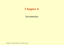 Chapter 6 Inventories Copyright © Cengage Learning. All rights reserved. Managing Inventories • Objective 1 – Explain the management decisions related to inventory accounting, evaluation of inventory level, and the effects of inventory misstatements on income measurement. Copyright © Cengage Learning. All rights reserved. 6-2 Inventory • Considered a current asset because it will normally be sold within a year’s time or within a company’s operating cycle. Merchandising Entities – Merchandise Inventory consists of all goods owned and held for sale in the regular course of business Copyright © Cengage Learning. All rights reserved. Manufacturing Entities – Maintain other types of inventories • Raw Materials • Work in Process • Finished Goods 6-3 Components of Work in Process and Finished Goods Inventory • Cost of the raw materials that go into the product • Cost of the labor used to convert the raw materials to finished goods • Overhead costs that support the production process (indirect materials like paint, glue; indirect labor such as salaries of supervisors; factory rent; depreciation of plant assets) Copyright © Cengage Learning. All rights reserved. 6-4 Inventory Decisions A primary objective of accounting is to determine income properly by matching costs of the period to revenues. • Inventory processing systems • Costing methods • Valuation methods Result in different amounts of reported net income, taxes paid, and cash flows Copyright © Cengage Learning. All rights reserved. 6-5 Inventory Turnover • Measurement of the number of times a company’s average inventory is sold during an accounting period. Inventory Turnover = Toyota’s Inventory Turnover = = Copyright © Cengage Learning. All rights reserved. Cost of Goods Sold Average Inventory $155,495 m ($15,281 m + $13,799 m) ÷ 2 10.7 times 6-6 Days’ Inventory On Hand Indicates the average number of days required to sell the inventory on hand. Number of Days in a Year Inventory Turnover Days’ Inventory on Hand = Toyota’s Days’ Inventory on Hand = = Copyright © Cengage Learning. All rights reserved. 365 days 10.7 times 34.1 days 6-7 Inventory Turnover for Selected Industries Copyright © Cengage Learning. All rights reserved. 6-8 Supply Chain Management Computerized system that a company uses to order and track inventory goods A just-in-time operating environment helps reduce inventory levels by coordinating orders and shipments of products so that they arrive “just in time” for customer orders Using these procedures and processes means that less money is tied up with carrying inventory Copyright © Cengage Learning. All rights reserved. 6-9 Effects of Inventory Misstatements on Income Measurement If inventory is overstated… Cost of goods sold is understated Income before income taxes is overstated If inventory is understated… Cost of goods sold is understated Income before income taxes is understated Copyright © Cengage Learning. All rights reserved. 6-10 Inventory Errors: Examples Column 1 Inventory Correctly Stated Net Sales Beg. Inv. Net purchases Cost of goods available for sale End. Inv. Column 2 Inventory Overstated Column 3 Inventory Understated $100,000 $100,000 $100,000 $12,000 $12,000 $12,000 58,000 58,000 58,000 $70,000 $70,000 $70,000 10,000 16,000 4,000 Cost of Goods Sold $ 60,000 $54,000 $ 66,000 Gross margin $ 40,000 46,000 $ 34,000 32,000 32,000 32,000 $ 8,000 $14,000 $ 2,000 Operating expenses Income before income taxes Copyright © Houghton Cengage Learning. Mifflin Company. All rights All reserved rights. reserved. 6-11 Inventory Cost and Valuation • Objective 2 – Define inventory cost, contrast goods flow and cost flow, and explain the lower-of-cost-or-market (LCM) rule. Copyright © Cengage Learning. All rights reserved. 6-12 Inventory Cost • Includes: – – – – Invoice price less purchases discounts Freight-in, including insurance in transit Applicable taxes and tariffs Cost for ordering, receiving, and storing • In principle, should be included in inventory cost • In practice, are usually considered expenses of the period (too difficult to allocate to specific inventory items) Copyright © Cengage Learning. All rights reserved. 6-13 Goods Flow and Cost Flow • Goods Flow Actual physical movement of goods in the operation of the company Cost Flow Association of costs with their assumed flow in the operation of the company Not always the same Copyright © Cengage Learning. All rights reserved. 6-14 Lower-of-Cost-or-Market Rule Cost is usually the most appropriate basis for the valuation of inventory. Sometimes inventory should be shown on financial statements at less than its cost. Physical deterioration, obsolescence, or decline in price level may cause a loss to occur. The lower-of-cost-or-market (LCM) rule requires that when the replacement cost of inventory falls below historical cost, based on one of the conventional inventory costing methods, the inventory is written down to the lower value and a loss is recorded. Copyright © Cengage Learning. All rights reserved. 6-15 Disclosure of Inventory Methods Cisco Annual Report Inventories: Inventories are stated at the lower of cost or market. Cost is computed…on a first-in, first-out basis. The company provides allowances on excess and obsolete inventories. Users should pay attention to the inventory disclosures in the notes to financial statements. Copyright © Cengage Learning. All rights reserved. 6-16 Inventory Cost Under the Periodic Inventory System • Objective 3 – Calculate inventory cost under the periodic inventory system using various costing methods. Copyright © Cengage Learning. All rights reserved. 6-17 Inventory Costing Methods Inventory cost is determined using one of the following generally accepted methods, each based on a different assumption of cost flow: 1. Specific identification method 2. Average-cost method 3. First-in, first-out method 4. Last-in, last-ou