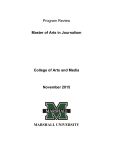 Program Review Master of Arts in Journalism College of Arts and Media November 2015 MARSHALL UNIVERSITY 2 3 College/School Dean’s Recommendation Deans, please indicate your recommendation and submit the rationale. Recommendation: Continuation at current level of funding. Rationale: (If you recommend a program for resource development identify all areas for specific development) The Master of Arts in Journalism complements a solid undergraduate program in the School of Journalism and Mass Communications. As is the case with the undergraduate degree, the graduate degree is deeply rooted in the liberal arts and the curricula supports the university mission to develop in our students higher orders of thinking, effective communication skills, and the ability to identify, investigate, and solve problems. Moreover, graduate students in the MA Journalism degree program are encouraged to contribute to the “store of knowledge through original research projects and through historic examinations of prominent journalism and mass communications professionals.” As noted in the program review narrative, enrollments have been trending downward locally and nationally over the past 5 years. Faculty are cognizant of the decline and have begun discussions about curriculum reform as one part of a larger strategy to address this issue. While the spring 2015 visit by the Accrediting Council on Education in Journalism and Mass Communications (ACEJMC) focused on the undergraduate degree, a telling comment in the visitors’ report applies to the undergraduate and graduate programs. They write that “the School is trying to keep up with the fast-changing media world.” Technology is changing fields of study in journalism and mass communications at lightning speed and insuring curricular currency is enormously challenging here and at institutions across the nation. Reasons for declining numbers of students are complex and will required multilayered solutions. Relevant offerings that keep pace with technology are critical and, as mentioned above, the faculty are working on this. Recognizing and seizing new opportunities that may in part be presented by the new configuration of the College of Arts and Media could lead to stronger numbers. Making sure that our program is thoroughly and accurately promoted is one component that we can address immediately, and institutional movement toward a comprehensive marketing campaign should help in this regard. Moreover, “right sizing” the graduate program to match available resources is essential. The 32 students who were in the program five years ago is not necessarily the right number for 2015, particularly given the multiple budget reductions over the same period of time. I am confident that the work that has begun on curriculum development, coupled with more targeted recruitment strategies, will result in a robust and appropriately sized program that continues the tradition of excellence in graduate education in journalism and mass communications. The program should continue at the current level of funding. ___Donald Van Horn__________________ Signature of the Dean ___November 3, 2015_____________ Date 4 Marshall University Program Review For purposes of program review, the academic year will begin in summer and end in spring. Program: Master of Arts in Journalism____________________________ College: Arts and Media_________________________________________ Date of Last Review: Academic Year 2009 – 2010 ____________________ I. CONSISTENCY WITH UNIVERSITY MISSION Provide your program’s mission statement. Explain how your mission supports the mission of your college and the mission of Marshall University. Mission Statement W. Page Pitt School of Journalism and Mass Communications (adopted 2001 – 2002) (amended 2008) (reviewed 2014) As a degree-granting academic unit at Marshall University, the W. Page Pitt School of Journalism and Mass Communications pursues Marshall’s general statement of purpose. Consequently, the program’s overall mission is to provide an academic experience that seeks to enable graduates to: think logically, critically and creatively, and be able to recognize this ability in others, communicate ideas clearly and effectively, both in speaking and in writing, evaluate the influences that help to shape individuals, institutions, and societies, understand the values, achievements, and aesthetic contributions of past and present cultures, and perceive, investigate and solve problems by enlisting the most appropriate historical, comparative, quantitative and qualitative research methods available. The W. Page Pitt School of Journalism and Mass Communications’ programs and curricula are based on the conviction that future journalists and mass communicators are best prepared for life and for their careers when they are broadly educated in the liberal arts. The importance of preparing them for the 5 demands of the workplace is also essential. Knowledge and skills essential to success in journalism and mass communications are also emphasized to prepare students for full participation – including leadership – in their professions. In addition, the School of Journalism and Mass Communications’ program seeks to promote knowledge and awareness about mass communications among students who do not intend to pursue careers in one of the mass communications fields. The SOJMC offers instruction for students seeking degrees in advertising, broadcast journalism, online journalism, print journalism, public relations, radiotelevision production and management and sports journalism. To conform to the university’s mission and the role and realities of the mass media industries in the USA and world, the SOJMC uses teaching, research and service to contribute to Marshall’s mission and, to that end, has adopted specific goals essential to the achievement of the University’s mission. The SOJMC seeks to: provide journalism and mass communications instru