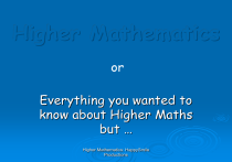 Higher Mathematics or Everything you wanted to know about Higher Maths but … Higher Mathematics: HappySmile Productions Pick a number 1 2 3 4. 5 6. 7 8 9. 10 11. 12. 13. 14. 15. 16 17 18 19 20 21 22 23 24 25 26 27 28 29 30 31 32. 33. 34. 35. 36 37. 38 39. 40 41 42 43. 44 45. 46 47. 48 49. 50 51. 52. 53 54 55 56. 57 58 59 60 61 62 63 64 65 66 67 68 69 70 71 72 73 74 75 76 77 78 79 80 81 82 83 84 85 86 87 88 89 90 91 92 93 94 95 96 97 98 99 100 101 102 103 104 105 106 107 108 109 110 111 112 113 114 115 116 117 118 119 120 121 122 123 124 125 126 127 128 129 130 131 132 133 134 135 136 137 138 139 140 Exit Exit Higher Mathematics: HappySmile Productions Question 1 How do you draw the graph of –f(x) given the graph of f(x) ? Exit Exit Higher Mathematics: HappySmile Productions answer Answer to Question 1 Reflect Return to question the graph in the x-axis Exit Exit Higher Mathematics: HappySmile Productions Question 2 For what values is the function f(x) = √(x-a) undefined? Exit Exit Higher Mathematics: HappySmile Productions answer Answer to Question 2 x Exit Exit <a Higher Mathematics: HappySmile Productions Return to question Question 3 If f(x) = then what is ’ f (x) ? Exit Exit n x Higher Mathematics: HappySmile Productions answer Answer to Question 3 n-1 nx Exit Exit Higher Mathematics: HappySmile Productions Return to question Question 4 What is the y general equation of a straight line passing through (a,b) with gradient m ? Exit Exit Higher Mathematics: HappySmile Productions (a,b) x answer Answer to Question 4 y – b = m(x – a) y (a,b) x Exit Exit Higher Mathematics: HappySmile Productions Return to question Question 5 If f(t) is the distance travelled in a certain time t seconds, then what ’ does f (t) represent ? Exit Exit Higher Mathematics: HappySmile Productions answer Answer to Question 5 Speed Exit Exit Return to question (velocity) Higher Mathematics: HappySmile Productions Question 6 What is an altitude of a triangle ? Exit Exit Higher Mathematics: HappySmile Productions answer Answer to Question 6 A Return to question line from a vertex, perpendicular to the opposite side Exit Exit Higher Mathematics: HappySmile Productions Question 7 What is logaa equal to ? Exit Exit Higher Mathematics: HappySmile Productions answer Answer to Question 7 1 Exit Exit Higher Mathematics: HappySmile Productions Return to question Question 8 Name the steps you take in order to differentiate functions like 2+ 3x + 1 x f(x) = √x Exit Exit Higher Mathematics: HappySmile Productions answer Answer to Question 8 (i) Change roots to powers (ii) split up into 3 fractions (iii) simplify each term (iv) differentiate Exit Exit Higher Mathematics: HappySmile Productions Return to question Question 9 How do you find where a curve crosses the y-axis ? Exit Exit Higher Mathematics: HappySmile Productions answer Answer to Question 9 Let x = 0 and solve Exit Exit Higher Mathematics: HappySmile Productions Return to question Question 10 How do you draw the graph of 2f(x) given the graph of f(x) ? Exit Exit Higher Mathematics: HappySmile Productions answer Answer to Question 10 Double the y-coordinates Exit Exit Higher Mathematics: HappySmile Productions Return to question Question 11 How do you find the gradient of a line, given the angle the line makes with the positive direction of the x-axis ? Exit Exit Higher Mathematics: HappySmile Productions answer Answer to Question 11 m = tan Θ y Θ x Exit Exit Higher Mathematics: HappySmile Productions Return to question Question 12 What is the equation of a horizontal line passing through the point (a,b) ? Exit Exit Higher Mathematics: HappySmile Productions answer Answer to Question 12 y =b y (a,b) x Exit Exit Higher Mathematics: HappySmile Productions Return to question Question 13 What do you know about the gradient of two perpendicular lines ? Exit Exit Higher Mathematics: HappySmile Productions answer Answer to Question 13 multiply together to give -1 Return to question They y i.e. m1xm2 = -1 Exit Exit Higher Mathematics: HappySmile Productions m1 x m2 Question 14 What is a median of a triangle ? Exit Exit Higher Mathematics: HappySmile Productions answer Answer to Question 14 A line from a vertex to the middle of the opposite side Exit Exit Higher Mathematics: HappySmile Productions Return to question Question 15 What is the gradient of a horizontal line ? Exit Exit Higher Mathematics: HappySmile Productions answer Answer to Question 15 0 y x Exit Exit Higher Mathematics: HappySmile Productions Return to question Question 16 How do you find the rate of change of a function at a particular point ? Exit Exit Higher Mathematics: HappySmile Productions answer Answer to Question 16 (i) Return to question differentiate (ii) fit in given x value Exit Exit Higher Mathematics: HappySmile Productions Question 17 How do you find the limit of a recurrence relation from its formula ? Exit Exit Higher Mathematics: HappySmile Productions answer Answer to Question 17 (i) let un+1 = un = L (ii) solve equation Remember: For un+1=aun+b, a limit exists if -1<a<1 Exit Exit Higher Mathematics: HappySmile Productions Return to question Question 18 How do you know when a recurrence relation of the form un+1 = aun + b converges ? Exit Exit Higher Mathematics: HappySmile Productions answer Answer to Question 18 -1 Exit Exit <a<1 Higher Mathematics: HappySmile Productions Return to question Question 19 Given a rec. relation in the form un+1 = aun + b and 3 consecutive terms, how do you find the values of a and b? Exit Exit Higher Mathematics: HappySmile Productions answer Answer to Question 19 (i) Return to question fit 1st term into un and nd 2 term into un+1 (ii) fit 2nd term into un and rd the 3 term into un+1 (iii) solve simultaneous equations Exit Exit Higher Mathematics: HappySmile Productions Question 20 How do you show that a curve is always decreasing? Exit Exit Higher Mathematics: HappySmile Productions answer Answer to Question 20 (i) differentiate (ii) show t