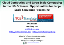 Cloud Computing and Large Scale Computing in the Life Sciences: Opportunities for Large Scale Sequence Processing May 30 2013 Geoffrey Fox gcf@indiana.edu http://www.infomall.org http://www.futuregrid.org School of Informatics and Computing Digital Science Center Indiana University Bloomington https://portal.futuregrid.org Abstract • Characteristics of applications suitable for clouds • Iterative MapReduce and related programming models: Simplifying the implementation of many data parallel applications • FutureGrid and a software defined Computing Testbed as a Service • Developing algorithms for clustering and dimension reduction running on clouds • Education and Training via MOOC’s https://portal.futuregrid.org 2 Clouds for this talk • A bunch of computers in an efficient data center with an excellent Internet connection • They were produced to meet need of public-facing Web 2.0 e-Commerce/Social Networking sites • They can be considered as “optimal giant data center” plus internet connection • Note enterprises use private clouds that are giant data centers but not optimized for Internet access • By definition “cheapest computing” (your own 100% utilized cluster competitive)? – Elasticity and nifty new software (Platform as a service) good https://portal.futuregrid.org Clouds in Technical Computing and Research https://portal.futuregrid.org 4 2 Aspects of Cloud Computing: Infrastructure and Runtimes • Cloud infrastructure: outsourcing of servers, computing, data, file space, utility computing, etc.. • Cloud runtimes or Platform: tools to do data-parallel (and other) computations. Valid on Clouds and traditional clusters – Apache Hadoop, Google MapReduce, Microsoft Dryad, Bigtable, Chubby and others – MapReduce designed for information retrieval but is excellent for a wide range of science data analysis applications – Can also do much traditional parallel computing for data-mining if extended to support iterative operations – Data Parallel File system as in HDFS and Bigtable https://portal.futuregrid.org What Applications work in Clouds • Pleasingly (moving to modestly) parallel applications of all sorts with roughly independent data or spawning independent simulations – Long tail of science and integration of distributed sensors • Commercial and Science Data analytics that can use MapReduce (some of such apps) or its iterative variants (most other data analytics apps) • Which science applications are using clouds? – Venus-C (Azure in Europe): 27 applications not using Scheduler, Workflow or MapReduce (except roll your own) – Substantial fraction of Azure applications are Life Science – 50% of domain applications on FutureGrid (>30 projects) are from Life Science – Locally Lilly corporation is commercial cloud user (for drug discovery) but not IU Biology https://portal.futuregrid.org 6 27 Venus-C Azure Applications Chemistry (3) Civil Protection (1) Biodiversity & Biology (2) • Lead Optimization in Drug Discovery • Molecular Docking • Fire Risk estimation and fire propagation • Biodiversity maps in marine species • Gait simulation Civil Eng. and Arch. (4) • Structural Analysis • Building information Management • Energy Efficiency in Buildings • Soil structure simulation Physics (1) • Simulation of Galaxies configuration Earth Sciences (1) • Seismic propagation Mol, Cell. & Gen. Bio. (7) • • • • • Genomic sequence analysis RNA prediction and analysis System Biology Loci Mapping Micro-arrays quality. ICT (2) • Logistics and vehicle routing • Social networks analysis Medicine (3) • Intensive Care Units decision support. • IM Radiotherapy planning. • Brain Imaging Mathematics (1) • Computational Algebra Mech, Naval & Aero. Eng. (2) • Vessels monitoring • Bevel gear manufacturing simulation https://portal.futuregrid.org 7 VENUS-C Final Review: The User Perspective 11-12/7 EBC Brussels Recent Life Science Azure Highlights • Twister4Azure iterative MapReduce applied to clustering and visualization of sequences • eScience Central in UK has developed an Azure backend to run workflows submitted in portal; large scale QSAR use • BetaSIM, a simulator from COSBI at Teento is driven by BlenX - a stochastic, process algebra based programming language for modeling and simulating biological systems as well as other complex dynamic systems and has beenported to Azure. • Annotation of regulatory sequences (UNC Charlotte) in sequenced bacterial genomes using comparative genomics-based algorithms using Azure Web and Worker roles or using Hadoop • Rosetta@home from Baker (Washington) used 2000 Azure cores serving as a BOINC service to run a substantial folding challenge • AzureBlast Clouds excellent at Blast and related applications https://portal.futuregrid.org 8 Parallelism over Users and Usages • “Long tail of science” can be an important usage mode of clouds. • In some areas like particle physics and astronomy, i.e. “big science”, there are just a few major instruments generating now petascale data driving discovery in a coordinated fashion. • In other areas such as genomics and environmental science, there are many “individual” researchers with distributed collection and analysis of data whose total data and processing needs can match the size of big science. • Clouds can provide scaling convenient resources for this important aspect of science. • Can be map only use of MapReduce if different usages naturally linked e.g. exploring docking of multiple chemicals or alignment of multiple DNA sequences – Collecting together or summarizing multiple “maps” is a simple Reduction https://portal.futuregrid.org 9 Data Intensive Programming Models https://portal.futuregrid.org 10 Science Computing Environments • Large Scale Supercomputers – Multicore nodes linked by high performance low latency network – Increasingly with GPU enhancement – Suitable for highly pa