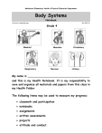 Methacton Elementary Health & Physical Education Department Body Systems Notebook 1 point per completed page Rev 2015-16 Grade 4 Skeletal Respiratory Muscular Nervous Circulatory Urinary My name is _____________________________________ and this is my Health Notebook. It is my responsibility to save and organize all materials and papers from this class in my Health Folder. The following items may be used to measure my progress: classwork and participation notebooks assignments written assessments projects attitude and conduct. PA State Standards 10.1.6.B Identify and describe the structure and function of the major body systems. skeletal muscular circulatory respiratory nervous urinary 10.1.6.B Identify health problems that can occur throughout life and describe ways to prevent them. Competencies Upon completion of this unit, students will be able to: describe the term “body system.” explain the following terms and how they come together to form a body system: - cells - tissues - organs. summarize the function of each of the following body systems: - skeletal muscular circulatory respiratory digestive urinary. identify and know the location of each of the major organs within each system. Health Teachers: Please note that this unit, up through the Respiratory System, should be completed by the end of February to coincide with the elementary Science curriculum. -1- The Human Body The human body is amazing! Directions: Fill in the blanks to complete the sentences below. 1.) Our bodies are made of tiny building blocks called ________________________. 2.) Cells of the same kind work together to form ___________________________. 3.) The heart, stomach and brain are examples of___________________________. 4.) Organs that work together to perform a certain job are called ______________. -2- The Skeletal System The skeletal system supports the body and gives it shape. Another function of the skeletal system is to work with muscles to move the body. A third function of the skeletal system is to protect the soft organs and body parts. For example, the skull protects the brain, while the ribs and breastbone (sternum) protect the lungs and heart. The backbone is made up of tiny bones called vertebrae that protect the spinal cord. The skeleton is made up of 206 bones. Besides bones, the skeleton also has a type of rubbery tissue called cartilage in all places where two bones meet. The cartilage cushions the bones and keeps them from rubbing together. The outer ear and the tip of the nose are very flexible because they are made up of cartilage. The place where two or more bones join together, such as in the elbow or ankle, is called a joint. There are several different types of joints in the body. Ligaments connect the bones in the joints of the body and help to keep them in place. In the very center of the bone is a large space filled with a type of tissue called marrow. Bone marrow is soft tissue that makes new blood cells. Getting plenty of calcium, minerals, vitamins and exercise helps keep your bones strong and healthy. Directions: Answer each of the following questions. 1.) What are the three functions of your skeletal system? a. _______________________________________________________ b. _______________________________________________________ c. _______________________________________________________ 2.) What is cartilage and where can it be found in your body? _______________________ __________________________________________________________________ 3.) What is the purpose of ligaments? ________________________________________ __________________________________________________________________ 4.) What is bone marrow? _________________________________________________ __________________________________________________________________ 5.) What can you do to keep your bones strong and healthy? ________________________ __________________________________________________________________ -3- Name That Bone Directions: Use the words from the word bank to label the diagram of the skeletal system. cranium patella ulna mandible vertebrae phalanges ribs sternum tibia radius humerus fibula tarsals carpals -4- femur pelvis clavicle I Did Not Know That! Directions: Use the code to learn more about bones. -5- The Muscular System We can move because of our muscles! The muscular system is made up of all the different muscles that cause movement. There are more than 600 muscles in the body that all control movement in some way. The two main types of muscles in the body are involuntary muscles and voluntary muscles. Involuntary muscles are muscles that cannot be consciously controlled. These are muscles, such as in the heart and stomach, that work without you needing to think about it. Voluntary muscles are muscles, such as in your arms, legs and face, that are under conscious control. This means the movement of voluntary muscles can be controlled. Voluntary muscles are also called skeletal muscles because they attach to the bones of the skeleton. Skeletal muscles move your bones by working in opposing pairs. When a muscle contracts, it pulls the bone in one direction. When the opposite muscle contracts, it pulls the bone in the other direction. Skeletal muscles are attached to the bones by tough bands called tendons. Muscles need to be exercised to stay healthy. Exercise strengthens and stretches the muscles. Without exercise, they become smaller and weaker. Eating foods rich in protein (eggs, meat, fish and beans) promotes the growth and repair of muscles. -6- Directions: Answer each of the following questions. 1.) What is the purpose of the muscular system? _________________________ ______________________________________________________________ 2.) What is the difference between a voluntary muscle and an involuntary muscle? ______________________________________________________________ ______________________________________________________________ 3.) How do the muscles cause the bones to move? _______________