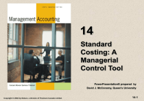 14 Standard Costing: A Managerial Control Tool PowerPresentation® prepared by David J. McConomy, Queen’s University Copyright © 2004 by Nelson, a division of Thomson Canada Limited. 14-1 Learning Objectives Explain how unit standards are set and why standard cost systems are adopted. Explain the purpose of a standard cost sheet. Describe the basic concepts underlying variance analysis and explain when variances should be investigated. Copyright © 2004 by Nelson, a division of Thomson Canada Limited. 14-2 Learning Objectives (continued) Compute the materials and labour variances and explain how they are used for control. Compute the variable and fixed overhead variances and explain their meaning. Use variance analysis as an analytical tool for profitability analysis. (Appendix A) Copyright © 2004 by Nelson, a division of Thomson Canada Limited. 14-3 Learning Objectives (continued) Prepare journal entries for materials and labour variances and describe the accounting for overhead variances. (Appendix B) Copyright © 2004 by Nelson, a division of Thomson Canada Limited. 14-4 Unit Standard Cost To determine the unit standard cost for a particular input, two decisions must be made: 1. How much of the input should be used per unit of output ? (Quantity decision) 2. How much should be paid for the quantity of the input to be used ? (Pricing decision) Copyright © 2004 by Nelson, a division of Thomson Canada Limited. 14-5 Types of Standards Ideal Standards demand maximum efficiency and can be achieved only if everything operates perfectly. Currently attainable standards can be achieved under efficient operating conditions. Copyright © 2004 by Nelson, a division of Thomson Canada Limited. 14-6 Sources for Quantitative Standards 1. Historical experience 2. Engineering studies 3. Input from operating personnel Copyright © 2004 by Nelson, a division of Thomson Canada Limited. 14-7 Factors for Price Standards - Materials 1. Market forces 2. Quality 3. Discounts 4. Freight Copyright © 2004 by Nelson, a division of Thomson Canada Limited. 14-8 Factors for Price Standards - Labour 1. Market forces 2. Trade unions 3. Payroll taxes 4. Qualifications Copyright © 2004 by Nelson, a division of Thomson Canada Limited. 14-9 Purposes of Standards To improve planning and control To facilitate product costing Copyright © 2004 by Nelson, a division of Thomson Canada Limited. 14-10 Cost Assignment Approaches Manufacturing Costs Direct Materials Direct labour Overhead Actual costing system Actual Actual Actual Normal costing system Actual Actual Budgeted Standard Standard Standard Standard costing system Copyright © 2004 by Nelson, a division of Thomson Canada Limited. 14-11 A Standard Cost Sheet Description Standard Price Standard Usage Standard Cost/Unit Direct materials Direct labour Variable overhead Fixed Overhead1 $1.50/kg. $6.00/hr. $10.00/hr. $8.00/hr. 10 kgs. 2 hours 2 hours 2 hours $15.00 12.00 20.00 16.00 $63.00 Other Operating Data for Period: Units produced 20,000 units 210,000 kilograms purchased @ $1.55 per kilogram; 205,000 kgs. used Direct labour costs 39,000 hours @ $6.10 per hour Variable overhead $410,000 1Fixed overhead $300,000; Rate = ($310,000/38,750 hrs) Copyright © 2004 by Nelson, a division of Thomson Canada Limited. 14-12 Variable Cost Variance Analysis: General Description Actual Quantity of Input at Actual Price AQ x AP Actual Quantity of Input at Standard Price AQ x SP Price Variance AQ x (AP - SP) Standard Quantity of Input at Standard Price SQ x SP Usage Variance SP x (AQ - SQ) Budget Variance (AQ x AP) - (SQ x SP) Copyright © 2004 by Nelson, a division of Thomson Canada Limited. 14-13 Variance Investigation Variances are investigated if two conditions are met: 1. The variance is material 2. The benefits of investigating and taking corrective action are greater than its costs Copyright © 2004 by Nelson, a division of Thomson Canada Limited. 14-14 Control Limits: Standard + Allowable Deviation Investigating occurs for values outside the allowable range. Example: Assume the allowable deviation may be the lesser of $8,000 or 10% of the standard. Suppose the standard is $50,000 and the actual deviation from standard is $6,000. Will the variance be investigated. Answer: Yes. Ten percent of standard is $5,000. Since $6,000 is larger than the allowable deviation, an investigation will take place. Copyright © 2004 by Nelson, a division of Thomson Canada Limited. 14-15 Material Variances Formula Approach: MPV = (AP - SP)AQ = ($1.55-$1.50)210,000 = $10,500 U MUV = (AQ - SQ)SP = (205,000 - 200,000)$1.50 = $7,500U SQ = 20,000 units x 10 lbs per unit Diagram Approach: AQ x AP 210,000 x $1.55 AQ x SP AQ x SP SQ x SP 210,000 x $1.50 205,000 x $1.50 MPV = $10,500U Responsibility: Purchasing 200,000 x $1.50 MUV = $7,500U Responsibility: Manufacturing Flexible Budget Variance = $18,000U Copyright © 2004 by Nelson, a division of Thomson Canada Limited. 14-16 Labour Variances Formula Approach: LRV = (AR - SR)AH = ($6.10 - $6.00)39,000 = $3,900 U LEV= (AH - SH)SR = (39,000 - 40,000)$6.00 = $6,000 F SQ = 20,000 units x 2 hrs. per unit Diagram Approach: AH x AR 39,000 x $6.10 AH x SR 39,000 x $6.00 LRV = $3,900 U Responsibility: Human Resources SH x SR 40,000 x $6.00 LEV = $6,000 F Responsibility: Manufacturing Flexible Budget Variance = $2,100 F Copyright © 2004 by Nelson, a division of Thomson Canada Limited. 14-17 Variable Overhead Variances Formula Approach: OSV = (AVOR - SVOR)AH = $410,000 - ($10 X 39,000 hrs) = $20,000 U OEV = (AH - SH)SVOR = (39,000 - 40,000)$10.00 = $10,000 F SQ = 20,000 units x 2 hrs. per unit Diagram Approach: AH x AVOR AH x SVOR $410,000 SH x SVOR 39,000 x $10.00 OSV = $20,000 U Responsibility: Manufacturing 40,000 x $10.00 OEV = $10,000 F Responsibility: Manufacturing Flexible Budget Variance = $10,000 U Copyright © 2004 by Nelson, a division of Thomson Canada Limited. 14-18 Fixed Overhead Variances Actual Overhead Budgeted Overhead Applied Overhead $310,000 