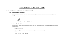 The Ultimate MAP Test Guide The MAP Reading test will test you on the following areas of reading. Word Recognition and Vocabulary: Students understand relationships between words and can use component structures and clues from context to decipher word meaning. Example: The girl is sitting at her 1. piano. 2. bed. 3. desk. 4. book. Reading Comprehension-Literal: Students can recall, identify, classify, and sequence details, facts, and stated main ideas from a variety of written materials and can interpret directions. Example: Read the story. Ryan likes to play ball. He likes his pet dog. His favorite toy is a truck. He is a little boy. What is he? 1. a dog 2. a girl 3. a boy 4. a ball Reading Comprehension-Inferential/Interpretive: Students can make reasonable predictions before, during, and after reading; can draw inferences necessary for understanding; can recognize cause-effect relationships; can synthesize information from a variety of written materials. Example: Read the story. Mother was getting ready for Sandy’s surprise tomorrow. She had baked a cake and invited all of Sandy’s friends. Now all she needed was seven candles for the cake. Tomorrow would be: 1. Sandy’s first day at school. 2. Sandy’s seventh birthday. 3. a good day to work in the yard. 4. Mother’s birthday. Reading Comprehension-Evaluation: Students understand fact, opinion, bias, assumption, and elements of persuasion. Students can compare works, evaluate conclusions, and apply what is learned. Example: Which is not a tool? 1. hammer 2. wrench 3. pliers 4. chair Literary Response and Analysis: Students can respond to stories based on characters, themes, plot, and setting. Example: Read the sentence. Before the children went outside to play, their father said, “Be sure to wear your mittens, warm jackets, hats, and boots.” This is part of a: 1. poem. 2. story. 3. song. 4. letter. Word Recognition and Vocabulary: Students understand relationships between words and can use component structures and clues from context to decipher word meaning. RIT Range: 161-170 Sample Question: Read the sentence. Juan was very blue when his puppy was missing. In this sentence, the word blue means 1. cold. 2. sky. 3. sad. 4. dog. 171-180 Read the story. At last, the children got to school. They were happy to see their teacher. The engine on the school bus had broken and was smoking. Another bus had to bring the students to school. In the paragraph, engine means 1. lunch. 2. camera. 3. truck. 4. motor. 181-190 Read the sentence. Sara has a new red velvet bonnet to wear on her head in the music program. The word bonnet probably means 1. dress. 2. hat. 3. play. 4. green. 191-200 The words road, rode, and rowed have their meanings listed below. Choose the word meaning that does not go with one of these words. 1. the past tense of ride 2. a machine that looks like a human 3. a broad trail 4. to propel a boat with oars 201-210 Which set of words all have the same root word? 1. extra, relax, pretext 2. knowledge, unknown, knowing 3. here, where, there 4. contain, restrain, plain 211-220 If the prefix “poly-” means many, then which of these words is a polysyllable? 221-230 Read the sentence. 1. princess 2. sculpture 3. personality 4. conscience The proud athlete spurned any offer of assistance. What does spurned mean? 1. condemned 230 and UP! 2. rejected with disdain 3. withheld 4. reluctantly turned down Read the paragraph. We mold our character through our living acts. As the years roll on, the accomplishments of yesteryear should be crystallized in a crowning tribute, symbolizing one’s life in respected simplicity. One of our memorials, selected while you live, will imperishably preserve your personality and continue the cherished ideals of your family name because the permanency of this inimitable, blue-gray granite is guaranteed. Choose an antonym for imperishably. 1. invulnerable 2. permanently 3. extinguishable 4. indestructibly Reading Comprehension-Literal: students can recall, identify, classify, and sequence details, facts, and stated main ideas from a variety of written materials and can interpret directions. RIT Range: 161-170 Sample Question: Read the label. This bug spray can be used on your grass. You can use it on your flowers, too. It can even be used on your trees, but do not use it where your pets go. The label says to keep this bug spray away from 1. trees. 2. flowers. 171-180 3. grass. 4. pets Read the story. Jose lives near the store, and his friend Ben lives several miles away. Ben asked Jose the shortest way to his home without going by the school. Jose told him, “Go two blocks south, six blocks west, and then three blocks south. My house is on the corner, number 8701.” After walking six blocks west, which direction should Ben go? 1. north 181-190 2. east 3. south 4. west Read the story. I can always count on seeing a lineup of sparrows on the telephone line outside my window. They are there night and day. The sparrows have become my friends through the summer — I have fed them and they have sung me songs. Which title tells the main idea of this story? 1. My Friends the Sparrows 2. Sparrows Are Fun 3. What Sparrows Do 4. Sparrows on the Line 191-200 Read the sentences about four animals. A. B. C. D. A large electric eel can release powerful electric shocks. Currents produced by electric catfish are loud enough to be heard. The snout fish use electric current to communicate. The stargazer fish may use electric power to attract a mate. What do all these fish have in common? 1. All live in fresh water rivers. 2. All have the ability to produce electric current. 3. All have the ability to harm humans. 4. They have a way to communicate that is different from all other animals. 201-210 Read the passage. The Presidential Physical Fitness Award can be earned by any boy or girl 10 years or over. The award is presented to students who meet the goals for these seven activities: 30-yard dash, 50-yard dash, 60