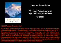 Lecture PowerPoint Physics: Principles with Applications, 6th edition Giancoli © 2005 Pearson Prentice Hall This work is protected by United States copyright laws and is provided solely for the use of instructors in teaching their courses and assessing student learning. Dissemination or sale of any part of this work (including on the World Wide Web) will destroy the integrity of the work and is not permitted. The work and materials from it should never be made available to students except by instructors using the accompanying text in their classes. All recipients of this work are expected to abide by these restrictions and to honor the intended pedagogical purposes and the needs of other instructors who rely on these materials. Modern Physics 26.9 The Ultimate Speed A basic result of special relativity is that nothing can equal or exceed the speed of light. This would require infinite momentum – not possible for anything with mass. 26.10 E = mc2; Mass and Energy At relativistic speeds, not only is the formula for momentum modified; that for energy is as well. The total energy can be written: (26-7b) Where the particle is at rest, (26-8) 26.10 E = mc2; Mass and Energy All the formulas presented here become the usual Newtonian kinematic formulas when the speeds are much smaller than the speed of light. There is no rule for when the speed is high enough that relativistic formulas must be used – it depends on the desired accuracy of the calculation. Chapter 27 Early Quantum Theory and Models of the Atom 27.1 Discovery and Properties of the Electron In the late 19th century, discharge tubes were made that emitted “cathode rays.” 27.1 Discovery and Properties of the Electron It was found that these rays could be deflected by electric or magnetic fields. 27.1 Discovery and Properties of the Electron By accelerating the rays through a known potential and then measuring the radius of their path in a known magnetic field, the charge to mass ratio could be measured: (27-1) The result is 27.1 Discovery and Properties of the Electron Cathode rays were soon called electrons. Millikan devised an experiment to measure the charge on the electron by measuring the electric field needed to suspend an oil droplet of known mass between parallel plates. 27.1 Discovery and Properties of the Electron The mass and charge of each droplet were measured; careful analysis of the data showed that the charge was always an integral multiple of a smallest charge, e. 27.1 Discovery and Properties of the Electron The currently accepted value of e is: Knowing e allows the electron mass to be calculated: 27.2 Planck’s Quantum Hypothesis; Blackbody Radiation All objects emit radiation whose total intensity is proportional to the fourth power of their temperature. This is called thermal radiation; a blackbody is one that emits thermal radiation only. 27.2 Planck’s Quantum Hypothesis; Blackbody Radiation The spectrum of blackbody radiation has been measured; it is found that the frequency of peak intensity increases linearly with temperature. 27.2 Planck’s Quantum Hypothesis; Blackbody Radiation This figure shows blackbody radiation curves for three different temperatures. Note that frequency increases to the left. 27.2 Planck’s Quantum Hypothesis; Blackbody Radiation This spectrum could not be reproduced using 19th-century physics. A solution was proposed by Max Planck in 1900: The energy of atomic oscillations within atoms cannot have an arbitrary value; it is related to the frequency: The constant h is now called Planck’s constant. 27.2 Planck’s Quantum Hypothesis; Blackbody Radiation Planck found the value of his constant by fitting blackbody curves: Planck’s proposal was that the energy of an oscillation had to be an integral multiple of hf. This is called the quantization of energy. 27.3 Photon Theory of Light and the Photoelectric Effect Einstein suggested that, given the success of Planck’s theory, light must be emitted in small energy packets: (27-4) These tiny packets, or particles, are called photons. 27.3 Photon Theory of Light and the Photoelectric Effect The photoelectric effect: If light strikes a metal, electrons are emitted. The effect does not occur if the frequency of the light is too low; the kinetic energy of the electrons increases with frequency. 27.3 Photon Theory of Light and the Photoelectric Effect If light is a wave, theory predicts: 1. Number of electrons and their energy should increase with intensity 2. Frequency would not matter 27.3 Photon Theory of Light and the Photoelectric Effect If light is particles, theory predicts: • Increasing intensity increases number of electrons but not energy • Above a minimum energy required to break atomic bond, kinetic energy will increase linearly with frequency • There is a cutoff frequency below which no electrons will be emitted, regardless of intensity 27.3 Photon Theory of Light and the Photoelectric Effect The particle theory assumes that an electron absorbs a single photon. Plotting the kinetic energy vs. frequency: This shows clear agreement with the photon theory, and not with wave theory. 27.3 Photon Theory of Light and the Photoelectric Effect The photoelectric effect is how “electric eye” detectors work. It is also used for movie film soundtracks. 27.4 Energy, Mass, and Momentum of a Photon Clearly, a photon must travel at the speed of light. Looking at the relativistic equation for momentum, it is clear that this can only happen if its rest mass is zero. We already know that the energy is hf; we can put this in the relativistic energy-momentum relation and find the momentum: (27-6) 27.4 Compton Effect Compton did experiments in which he scattered X-rays from different materials. He found that the scattered X-rays had a slightly longer wavelength (and less energy) than the incident ones, and that the wavelength depended on the scattering angle: (27-7) 27.4 Compton Effect This is another effect that is correctly pre