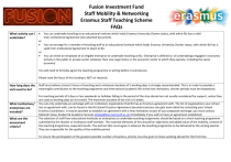 Fusion Investment Fund Staff Mobility & Networking Erasmus Staff Teaching Scheme FAQs What activity can I undertake? You can undertake teaching at an educational institute which holds Erasmus University Charter status, with which BU has a valid Inter-institutional Agreement (see attached document). or You can arrange for a member of teaching staff at an educational institute which holds Erasmus University Charter status, with which BU has a valid Inter-institutional Agreement to teach at BU. or You can invite an employee of an eligible enterprise to undertake teaching at BU. Enterprise is defined as ‘all undertakings engaged in economic activity in the public or private sector whatever their size, legal status or the economic sector in which they operate, including the social economy’ You will need to formally agree the teaching programme in writing before it commences. Please note the focus of this funding is NOT on research. How long does the visit need to be? What institutions/ enterprises are included? What are the assessment criteria? Staff must deliver at least 5 hours of teaching and a minimum duration of 5 working days is strongly recommended. This is in order to provide a meaningful contribution to the teaching programme and international academic life at the host institution; shorter periods must be exceptional. For teaching periods of 5 days or less weekends or holidays falling in the period of the stay abroad are not usually considered for support, unless they are used as working days (or for travel). The maximum duration of the visit is 6 weeks. You can only undertake an exchange with an institution/ organisation that BU has an Erasmus agreement with. The list of organisations your school has an agreement with, can be found in the BU School Erasmus Agreement document and you can gain more detail by contacting your School Erasmus Coordinator. It may be possible to establish an agreement with a new institution as part of your proposed exchange; you must contact Deborah Velay, Student & Academic Services dvelay@bournemouth.ac.uk immediately if you wish to have an agreement established. The selection of staff from educational institutes or enterprises to undertake teaching assignments should be based on a short teaching programme submitted by the teacher or enterprise staff member. The essential elements of this should be: objectives and added value of the mobility, content of the teaching programme, expected results. The partner HEIs must agree in advance the teaching programme to be delivered by the visiting teacher. They are responsible for the quality of the mobility period. To ensure the participation of the greatest possible number of teachers, priority must be given to those working abroad for the first time. What period is covered? What expenditure is covered by the grant? 15 January 2013 to 30 June 2013. Mobility grants for staff are provided as contributions towards subsistence and travel. Subsistence: maximum rates can be found on the accompanying documentation and payments will only be given for those which have a receipt and up to the maximum rate for the area travelled to. Subsistence payments will be made on the basis of evidence of time spent teaching. Up to two days spent travelling may be included in subsistence payments. While your grant may be awarded to the amount you have requested, based on maximum permitted rate you have calculated, the amount you will actually be reimbursed will be that for which you only have receipts in accordance with European Commission procedures. Any underspend will be claimed back. Travel costs: these are calculated on the basis of receipted expenditure. Costs may cover travel from the point of departure to the host, but do not include local travel during the mobility. The maximum grant for travel costs is € 500 although you can request an exception for higher costs for long distance travel e.g. to French external territories. To convert your travel costs from sterling into Euro use £1.00 = €1.25. To calculate the cost of your activity, please consult the Maximum Subsistence Rates document. What is the maximum amount of funding I can apply for? Can I apply for special needs assistance where mobility would not be possible without extra financial support?* The Erasmus Staff Mobility grant will cover up to a total of €1,000. The SMN Committee may provide any amount over this requested in an application, but this is not guaranteed. The quality of the application, strategic importance of the mobility and value for money will be taken into consideration when assessing applications. Why do I have to fill in a different form to the other FIF strands? The British Council who administer the funds to BU have specific reporting requirements and the application form has been adjusted in light of this. A signature from your Deputy Dean for Research or Education is needed to accept that the applicant’s school will fund the mobility upfront; funds are later transferred to the school on receipt of all project paperwork. Staff who need to apply for a special needs allowance should do so using the application form provided by the scheme administrator, no later than the 7th December 2012. The sending HEI is responsible for ensuring that application forms are correctly completed, and providing evidence that the host institution knows of the special needs and that necessary arrangements are being made at the host institution to meet the person’s needs. A detailed estimate of costs is required in the application. Please also provide a statement from a doctor or other authority confirming the special needs, its severity, its impact on the Erasmus mobility and all your additional requirements. The application should provide information on any other sources of financial support that the staff member receives and indicate why this is insufficient for the proposed mobility period. Fusion Investment Fund Staff Mobility & Networking Erasmus Staf