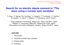 Workshop on Fundamental Physics Using Atoms 7 - 9 August 2010, Osaka Search for an electric dipole moment in 129Xe atom using a nuclear spin oscillator T. Inoue,1 T. Nanao,1 M. Tsuchiya,1 H. Hayashi,1 T. Furukawa,1 A. Yoshimi,2 M. Uchida,1 H. Ueno,2 Y. Matsuo,2 T. Fukuyama,3 and K. Asahi1 1 Tokyo Institute of Technology, Meguro-ku, Tokyo 152-8551, Japan 2 RIKEN, 2-1 Horosawa, Wako-shi, Saitama 351-0198, Japan 3 Ritsumeikan University, Nojihigashi, Kusatsu, Shiga 525-8577, Japan OUTLINE: 1. Introduction 2. "Optically coupled" spin oscillator 3. Present status 4. Summary 1. Introduction Electric Dipole Moment (Permanent) Electric Dipole Moment Electric Dipole Moment (EDM) d s + ++ -+ Eext = 0 +q -+ + + a = d ≡ qa -q - or, d particle or, (r )rd3r i L EDM d 5 F 2 Electric dipole moment (EDM) s d + ++ - - - s + ++ d time reversal spin : s → -s EDM : d→d - - - d ≠ 0 : Violation of T ⇒ Violation of CP (CPT theorem) ● The violation of CP is implemented in the Standard Model (SM), but ... ● CP violation in SM (K-M mechanism) is not sufficient to explain the matterantimatter asymmetry observed in the universe. Thus, ... ● An extra CP-violation is required. Electric dipole moment (EDM) s d + ++ - - - s + ++ d time reversal spin : s → -s EDM : d→d - - - d ≠ 0 : Violation of T ⇒ Violation of CP (CPT theorem) Sites of EDM searches • neutron • paramagnetic atoms (Tl, Fr, Cs, ...) • diamagnetic atoms (129Xe, 199Hg, Rn, Ra, ...) • molecules (TlF, YbF, PbO, ThO, ...) • charged particles (d, , ...) dN de S de dN, d ⇒ Probing different facets of anticipated new physics Electric dipole moment (EDM) s + ++ - - - s d + ++ d time reversal spin : s → -s EDM : d→d - - - d ≠ 0 : Violation of T ⇒ Violation of CP (CPT theorem) M. Pospelov and A. Ritz, Annals of Phys. 318, (2005) 119-169 EDM in 129Xe atoms •stable particle •macroscopic number of particles •EDM generated by a nuclear Schiff moment •P,T-violating NN interaction Schiff moment Tl, Fr, Cs… 129Xe, 199Hg, Rn, Ra… How does the EDM appear in a diamagnetic atom? Point nucleus in an atom Nucleus with a finite size Nucleus Electrostatic F(r) due to a cloud of atomic electrons EDM d q q = + d = q EDM d q Dx = d/q q Atomic electrons do not "know" whether the nucleus has EDM. Atomic electrons feel a nontrivial charge distribution unside the nucleus. Electron cloud Nucleus Electron cloud Nucleus datom ≠0 Nontrivial charge distribution in the nucleus generates an EDM in atom: datom 2 0 Dˆ P P eSchiff 0 E0 EP P , where Dˆ e Ri i Schiff 4 S ( R) S 1 2 5 2 3 ( r ) r r r d r 10 nucleus 3 Schiff moment d(129Xe) = 3.8×105 fm2 ·S(129Xe) d(199Hg) = 2.8×104 fm2 ·S(199Hg) [Ginges & Flambaum, Phys. Rep. 397 (04) 63] What generates a Schiff moment ? --- (In language of nuclear physics) CP-violating components of the NN interaction generate S. ●Case of 199Hg S ( 199 Hg) 0.0010 g NN g(0)NN 0.074 g NN g(1)NN 0.018 g NN g(2)NN e fm3 with SkO' effective interaction, [J.H. de Jesus and J. Engel, Ann. Phys. 318 (05) 119] d d g(0)NN d u d d , g(1)NN u d ●Case of 129Xe Flambaum, Khriplovich, Sushkov, 1985 Dzuba, Flambaum, Porsev, 2009 Yoshinaga's group, consideration fro shell model in progress. Neutron EDM predicted values d = 1027 e·cm E = 10 kV/cm D = 10 nHz ( Dw 1°/day) d(199Hg) < 3.1×10-29 ecm Grifith et al., PRL 102 (2009) 101601 Standard Model (dn = 10-(31-33) ) d(129Xe) < 4.1×10-27 ecm Rosenberry and Chupp, PRL 86 (2001) 22 [Pendlebury and Hinds, NIM A 440 (00) 471] Detection of an EDM H μ B d E Energy shift upon an E-field reversal E // B E // B H B dE H B dE Shift in a precession frequency Energy levels for a spin 1/2 (for a case of > 0, d > 0) m B0 E0 m ⇒ signal of an EDM D 4dE h Desires long precession times => Spin maser B0 E // B B0 E // B h h 0 2 B 2dE 2 B 2dE (E // B ) (E // B) h h the difference 1 2 B0 E0 1 2 B hν B E s E s Key issue for a high-sensitivity EDM detection: Free precession Time Transverse spin Transverse spin ― Realization of a long precession time ‘Spin maser’ state Time [T.E. Chupp et al, Phys. Rev. Lett. 72 (94) 2363] [M.A. Rosenberry and T.E. Chupp, Phys. Re. Lett. 86 (2001) 22] Spin maser ● 129Xe polarization vector P = I/I ● Static field B0 = (Bx, By, B0) ● P follows the Bloch equations: 1 P B P P T1,2 B relaxation term or, dPx P Py B0 Pz By x , dt T2 dPy dt Pz Bx Px B0 Py T2 , dPz P Px By Py Bx z P0 Pz G. dt T1 Pumping term [T.E. Chupp et al, Phys. Rev. Lett. 72 (94) 2363] [M.A. Rosenberry and T.E. Chupp, Phys. Re. Lett. 86 (2001) 22] Spin maser ● If a capacitor C is connected to form a resonating circuit, the coil produces a transverse B field, B(t), Bx (t ) Py (t ) By (t ) Px (t ) B dPx P Py B0 Pz By x , dt T2 dPy dt Pz Bx Px B0 Py T2 , dPz P Px By Py Bx z P0 Pz G. dt T1 dPx P w0 Py Pz Px x , dt T2 dPy dt w0 Px Pz Py Py T2 (1) , (2) dPz P Px Px Py Py z P0 Pz G. dt T1 (3) B P x y B Px y w0 B0 Taking (1) + i (2) and setting Px (t ) iPy (t ) eiwt P (t ) dP 1 Pz i w w0 P , d t T2 2 dPz P P z P0 Pz G. dt T1 (4) (3') dP dPz 0 and 0 The steady state solutions . dt dt ・Trivial solution: ・Non-trivial solution: Peq 0, Pz eq P eq GT1 P0 GT1 1 1 1/ GT1 G 1 eq , with w =w0 . P0 , Pz T2 T2 Spin oscillator ● Now we devise the transverse part of the B field, B(t), to follow P Bx (t ) Py (t ) By (t ) Px (t ) B(t) B(t) Spin detection dPx P Py B0 Pz By x , dt T2 dPy dt Pz Bx Px B0 Py T2 , dPz P Px By Py Bx z P0 Pz G. dt T1 Maser oscillation transient steady oscillation Setup for the maser experiment Si photodiode ・Bandwidth : 0 ~ 500 kHz magnetic shield (4-layer) ・permalloy B0 Solenoid coil (static field) ・B0 = 30.6 mG (I = 7.354 mA) l/4 plate Heater T 70 C spin precession signal Pumping laser ・l = 794.76 nm (Rb D1line) ・Dl = 3 nm ・Power ~ 11 W PEM 129Xe gas cell 18 mm 129Xe : 230 torr N2 : 100 torr Rb : ~ 1 mg Pyrex glass SurfaSil coating Probe laser ・DFB laser ・l = 794.76 nm (Rb D1line) ・Dl = 8.4×10-6 nm ・Power : 15 mW Spin polarization of 129Xe and 