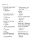 Unit 4 Practice Test Multiple Choice Identify the choice that best completes the statement or answers the question. b. absolute threshold; difference threshold 1. Complete sensation in the absence of complete c. sensory interaction; feature detection perception is best illustrated by a. Weber's law. d. feature detection; sensory interaction b. prosopagnosia. e. sensation; perception c. conduction deafness. 6. Bottom-up processing involves analysis that d. color constancy. e. sensory interaction. 2. As the brain receives information about the lines, angles, and edges of objects in the environment, higher-level cells process and interpret the information to consciously recognize objects. This process best illustrates a. sensation. b. bottom-up processing. c. perception. d. selective attention. e. psychophysics. 3. The detection and encoding of stimulus energies by the nervous system is called a. signal detection. b. priming. c. synaesthesia. d. accommodation. e. sensation. 4. The process by which we select, organize, and interpret sensory information in order to recognize meaningful objects and events is called a. sensory adaptation. b. parallel processing. c. sensation. d. perception. e. accommodation. 5. Hearing a sequence of sounds of different pitches is to ________ as recognizing the sound sequence as a familiar melody is to ________. a. the just noticeable difference; accommodation begins with the a. optic nerve. b. sensory receptors. c. cerebral cortex. d. feature detectors. e. occipital lobe. 7. You typically fail to consciously perceive that your own nose is in your line of vision. This best illustrates a. subliminal perception. b. change blindness. c. fovea. d. selective attention. e. the visual cliff. 8. While a man provided directions to a construction worker, two experimenters rudely interrupted by passing between them carrying a door. The student's failure to notice that the construction worker was replaced by a different person during this interruption illustrates a. blind spot. b. gate-control theory. c. bottom-up processing. d. change blindness. e. top-down processing. 9. Research participants picked one of two photographed faces as more attractive. When researchers cleverly switched the photos, participants readily explained why they preferred the face they had actually rejected. Their behavior illustrated a. the blind spot. b. choice blindness. c. feature detectors. d. sensory interaction. e. perceptual adaptation. 10. The minimum amount of stimulation a person needs to detect a stimulus 50 percent of the time is called the a. adaptation threshold. b. difference threshold. c. subliminal threshold. d. absolute threshold. e. change threshold. 11. Although Manuel was sitting right next to his parents, he smelled a skunk minutes before they did. Apparently, Manuel has a lower ________ for skunk odor than his parents have. a. accommodation level b. absolute threshold c. tolerance level d. olfactory saturation level e. adaptation level 12. When you are expecting an incoming text message, you are much more likely to notice it the second it arrives. This best illustrates a. priming. b. signal detection theory. c. difference thresholds. d. absolute thresholds. e. Weber's law. 13. Photographs of people were rated more positively if the photos immediately followed a briefly flashed image of kittens. This best illustrates the impact of a. sensory adaptation. b. interposition. c. retinal disparity. d. priming. e. prosopagnosia. 14. If the just-noticeable difference for a 10-ounce weight is 1 ounce, the just noticeable difference for an 80-ounce weight would be ________ ounce(s). a. 1 b. 2 c. 4 d. 8 e. 10 15. Sensory adaptation helps us to focus our attention on what kind of stimuli? a. familiar b. subliminal c. novel d. intense e. transduced 16. After listening to your high-volume car stereo for 15 minutes, you fail to realize how loudly the music is blasting. This best illustrates a. Weber's law. b. accommodation. c. sensory adaptation. d. the volley principle. e. transduction. 17. The constant quivering movements of our eyes enable us to a. focus the light on our retina. b. adjust the size of the pupil. c. minimize sensory adaptation. d. perceive speed more accurately. e. see in low levels of light. 18. Humans experience the longest visible electromagnetic waves as a. the color blue-violet and the shortest visible waves as red. b. the color red and the shortest visible waves as green. c. the color blue and the shortest visible waves as yellow. d. the color red and the shortest visible waves as blue-violet. e. the color black and the shortest visible waves as white. 19. Intensity is to brightness as wavelength is to a. accommodation. b. frequency. c. amplitude. d. hue. e. disparity. 20. Brightness is to intensity as hue is to a. amplitude. b. color. c. pitch. d. wavelength. e. frequency. 21. Which process allows more light to reach the periphery of the retina? a. accommodation of the lens b. transduction of the blind spot c. dilation of the pupil d. sensory adaptation of feature detectors e. focusing light effectively on the fovea 22. Which cells for visual processing are located closest to the back of the retina? a. ganglion cells b. bipolar cells c. rods and cones d. feature detectors e. occipital cells 23. Bipolar cells are located in the a. optic nerve. b. retina. c. blind spot. d. lens. e. cochlea. 24. Under very dim levels of illumination a. the iris expands to allow more light to reach the retina. b. rods are more light-sensitive than cones. c. foveas react to increase the sensitivity of the optic nerve. d. feature detectors in the retina activate. e. rods fire according to place theory to perceive the available light. 25. Which receptor cells most directly enable us to distinguish different wavelengths of light? a. rods b. cones c. bipolar cells d. feature detectors e. optic nerves 26. Rods are a. more light-sensitive and more color- sensitive than are cones. b. less light-s