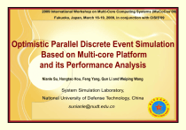 2009 International Workshop on Multi-Core Computing Systems (MuCoCos’09) Fukuoka, Japan, March 16-19, 2009, in conjunction with CISIS'09 Optimistic Parallel Discrete Event Simulation Based on Multi-core Platform and its Performance Analysis Nianle Su, Hongtao Hou, Feng Yang, Qun Li and Weiping Wang System Simulation Laboratory, National University of Defense Technology, China sunianle@nudt.edu.cn Agenda Introduction Multi-core computer Optimistic parallel discrete event simulation based on multi-core platform Parallel programming model Synchronization algorithm Optimistic PDES simulator Performance analysis Conclusion and future work MuCoCos'09 2 1. Introduction Hardware Trend: Multi-core Era Software Trend: Concurrency Revolution Modeling and Simulation Field Simulation applications put forward higher and higher requirement on the executing speed as the modeled physical systems are becoming more and more complicated Parallel simulation is an effective way to speed up the running of simulation Multi-core computer will offer a new parallel computing platform with high performance-price ratio and small volume to parallel simulation This paper researches the parallel discrete event simulation based on multi-core platform using optimistic synchronization algorithm. 2. Multi-core computer Thread Level Parallelism Simultaneous Multi-threading Chip Multi-Processor Multi-core Many-core Two conclusions for applications running on multi-core platform Conclusion 1. When multiple applications are executed, the performance on multi-core platform is better than single-core platform with the same clock frequency. Conclusion 2. Applications without parallelization can’t make full use of computing power on multi-core platform. 2. Multi-core computer Figure 1. State of task manager when serial simulator is running on HP Server 3. Optimistic parallel discrete event simulation based on multi-core platform Discrete Event Simulation Parallel Discrete Event Simulation (PDES) Platform Traditional SuperComputer shared-memory multiprocessors distributed-memory multicomputers The prices are too high to be afforded, which limits the extensive popularization of PDES Multi-core Computer high performance-price ratio, small purchasing risk, easy moving, high memory access speed, windows OS compatible, easy operation, etc Platform of PDES: Shift from traditional supercomputer to multi-core computer Future Desktop Simulation: Parallel Simulation based on Multi-core or Many-core Platform 3. Optimistic parallel discrete event simulation based on multi-core platform In order to parallelize discrete event simulation on multi-core platform, two of the most important problems to be solved: parallel programming model synchronization algorithm 3.1. Parallel programming model Function: to partition simulation into multiple logical processes (LPs) and distribute these LPs among executing cores on multi-core platforms for running Shared memory model a software thread will be created for each LP and threads communicate with each other by accessing shared variables and using thread synchronization primitives system calls (Windows and Unix system functions) thread libraries (such as Win32 threads, POSIX threads, OpenMP, Threading Building Blocks) programming language support (such as JAVA and C#) 3.1. Parallel programming model Message passing model a software process will be created for each LP and processes communicate with each other by sending and receiving explicit messages. MPI PVM the multiple processes/threads created are all scheduled by operating systems. Generally they will be assigned the same priority. Programmers need not to distribute them to executing cores manually. Considering the good portability of message passing model, MPI is chosen in this paper. 3.1. Parallel programming model With MPI adopted, interaction among LPs in PDES is completed entirely through explicit messages. Several kinds of messages need to be transferred: initialization message start message event message negative event message GVT update message terminate token Before these messages are sent, they have to be transformed into byte stream through serialization. After received, byte stream has to be transformed back into different kinds of messages through deserialization. 3.2. Synchronization algorithm By parallel programming model, we distribute multiple LPs to multiple cores on multi-core platform and execute LPs simultaneously. Unfortunately, events can’t be ensured to access LPs in time-stamp order. This problem is called synchronization of PDES and it’s the central problem of PDES. A synchronization algorithm is needed to ensure that events are processed in a correct order and the parallel execution of the simulator yields the same results as a sequential execution. Optimistic synchronization VS Conservative synchronization Optimistic algorithms use a detection and recovery approach. 3.2. Synchronization algorithm Concepts related to optimistic algorithms State Saving Roll Back Global Virtual Time Fossil Collection In order to recover from errors, the states before LP processes events should be When LP receives an some event commonly with time- used saved. There are stamp smallerforthan itssaving, local simulation methods state such as whole clock (thissaving, event is called a straggler state periodic state saving, Optimistic synchronization algorithm GVTshould at wallclock time T (GVTT) during the event), it should state restore its state incremental saving and and reverse consume much memory to save simulation states and execution is defined as the sendcomputation. anti-message to cancel the event events. After GVT is calculated, memory minimum time-stamp among all sent earlier. This process is called roll used by states and events that are unprocessed older and partially processed back. than GVT can be reclaimed and messages reused. and anti-messages in the system This process is called fossil collection. at wallclock time T. Sam