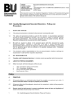 Owner: Version number: Effective date: Date of last review: Due for review: Educational Development and Quality 3.0 15th September 2014 (For 2014-15 and 2015-16 Academic Years) August 2014 Every 3 years [Title] Policy This document is part of the Academic Regulations, Policies and Procedures which govern the University’s academic provision. Each document has a unique document number to indicate which section of the series it belongs to. 10A - Quality Management Records Retention: Policy and Procedure 1. SCOPE AND PURPOSE 1.1 This policy and procedure is intended for Bournemouth University (BU) staff. 1.2 This policy and procedure provides a guide for the retention of documentation generated through the quality management activities of the University in relation to teaching, learning and student administration. This document is based upon the earlier University Records Retention Schedule and is informed by JISC infoNET guidance. 1.3 BU staff are required to adhere to the procedure given within this document for quality assurance purposes. Members of staff need to be able to access information and documentation where necessary to respond to external queries and therefore it is important that the guidelines given here are reflected in the practice employed within Professional Services and Faculties. 1.4 The procedure outlines responsibilities for the core documentation, therefore clarifying the requirements for staff and their respective departments. 2. KEY RESPONSIBILITIES 2.1 Faculties and Professional Services: to maintain records as specified within this document. 3. LINKS TO OTHER BU DOCUMENTS 3.1 Other documents with direct relevance to this one are: 10B - Committees: Policy and Procedure 10C - Committees: Guidelines Use of Cohort for online applications Data Protection Policy Policy 4. PRINCIPLES 4.1 All records relating to an individual student should be complete, accurate and up to date. A record of education needs to be kept in perpetuity for all students. 4.2 All personal data should be adequate, relevant and not excessive in relation to the purpose for which it is retained. 4.3 Records should be held securely to prevent unauthorised access to them and duplication of student information should be kept to a minimum. 1 10A - Quality Management Records Retention: Policy and Procedure 4.4 Some professional, statutory or regulatory bodies (PSRBs) may have additional requirements which need to be adhered to in addition to those stated for BU. 4.5 BU aims to retain the majority of records in electronic format, although it should be remembered that for retention purposes the format of the record is immaterial. Procedures 5. RESPONSIBILITIES AND RETENTION PERIODS FOR CORE RECORDS 5.1 Retention periods vary considerably depending upon the type of record. separates out records into four key areas: 2 This procedure Student Records – where information will relate specifically to individual students, applicants or enquirers; Programme Documentation - includes all documentation relevant to programme creation, delivery, management and monitoring; Assessment Records - details documentation relating to assessment including assignment/examination briefs and papers through to assessment board paper management; Meetings and Documentation held centrally - includes guidance on committee paperwork, External Examiners, PSRBs, Partner contracts and Audit materials. 10A - Quality Management Records Retention: Policy and Procedure 5.2 Student Records Core student record. To include at a minimum: Student name Date of birth Address at start and end of programme Previous qualifications/ fulfilment of admissions criteria Programmes undertaken (with dates) Overall grades and classification achieved Name, date and result of award Professional registrations with PSRBs Where core record is held Are additional copies required Held in Unit-e (or other locations e.g. HEMIS where records were not transferred over). Other information may be held on student file for as long as is necessary for operational purposes within Faculty/ Partner Normally kept as an electronic record within the student record system Faculty/ Partner No Format of record electronic or hard copy (E or H) E or H1 Retention Period E or H 6 years from graduation or any subsequent action/ correspondence whichever is later. Note: The UKBA require that visa and passport copies are kept for 1 year after the student completes their programme Permanently retained For Partners under the Validation Model: the Partner will maintain the core record within their own database system Student files and any associated information (such as that relating to application, transfer, withdrawal, ALS, mitigation etc) students on programmes that do not lead to a professional registration with a PSRB 1 3 Pre-Electronic Student Records 10A - Quality Management Records Retention: Policy and Procedure Where core record is held Are additional copies required Student files and any associated information (such as that relating to application, transfer, withdrawal, ALS , mitigation etc) students on programmes that do lead to a professional registration with a PSRB Faculty/ Partner No Additional Learning Support (ALS) student records (initial assessment, screening, diagnostic assessment, medical evidence, Disabled Students Allowance (DSA), Individual Learning Programme (ILP), independent study management info, all e-mails, letters, texts and general communications) ALS Marked student work not collected by students Faculty/ Partner Note: students to be advised at the start of the programme that any uncollected work will be destroyed after one year 4 Format of record electronic or hard copy (E or H) E or H Retention Period Copy of ALS advice note to be kept on the student file within the Faculty/ Partner E or H 6 years from graduation or any subsequent action/ correspondence whichever is later No E or H (Electronic records held in myBU can be retrieved if necessary) Current academi