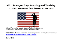 MCLI Dialogue Day: Reaching and Teaching Student Veterans for Classroom Success Miguel Fernandez, Faculty Liaison for Student Veterans Composition, Literature, Creative Writing Faculty Presentation & Entire Toolkit for developing veteran friendly faculty training: http://miguelfernandez.com/?p=65 Nov 13 2015 AGENDA (2.5 hrs) 1:40pm-2pm THE most impt thing you can do for your classroom: Sample SYLLABUS section for Military Connected: win (faculty)-win(students)-win(admin & support) 2pm-2:20pm Background on Veterans: Stereotypes, Myths or Realities? Practical tips: Rounds 1, 2, 3 2:20pm-2:30pm BREAK (2:30 A. Olivas) AGENDA (2.5 hrs) 2:40pm-3:15pm Role of Veteran Services & A Student Veteran Biggest wish, biggest problem, thing they wish others knew Walk-through: Scenario: triggered incident 3pm Q&A 3:15-3:25: Active Learning: 3 scenarios: Groups for 10 min 3:25: GROUP Discuss scenarios of 3: for solutions 3:50 CLOSE UP: Evals, Assessement (Reflections) For Faculty Professional Growth • • • • Fill out Sign up Sheet Complete and hand in Evaluation form Complete assessment/reflection form Complete the application for Faculty Prof. Growth Non-Academic Clock hours avail online within 90 days and turn in the paper copy to your FPG representative. internal_app.doc https://mcli.maricopa.edu/files/fpg/internal_app.doc [46k] • I will complete attendance Verif form Introductions • • • • Name, job/title, College/affiliation What you hope to get from this session Overview: What caught your attention? • How many people, have had interactions with veteran students, co-workers, employees, etc that brought to attention the ‘vet’ part? • Positive? (leadership, drive, direct action)? • Negative? (confrontations, conflict, off norm reactions, anger issues?) Why Military connected students can be challenges in the classroom • Priority of education vs life demands • Cynicism towards academics and civilians • Out of school for some time treated as developmental • Accommodations (NOT exceptions!) • Cannot relate to younger students • Want Structure! • “Bad habits” issues of authority, especially with female instructors Why Military connected students can be assets in the classroom • • • • • • Inclusion Diversity Experience Leadership Follow through Values become ‘mission’ Hey it was Veteran’s Day! • YES/NO: Ask Vets to stand up and say: Thank you for your Service? The what’s next A section on your Syllabus for Military-connected Students • http://cgc.edu/veterans and click on ‘Faculty Training & Resources’ Syllabus Section HEADER • Student Veteran/Reserves/Guard/Active Duty: Support & Responsibilities: ‘Student veterans are DEFINED as any branch/level of prior, active or current military service – active, retired, reserves, guard, combat, support, logistics, with/without GI Bill, attending college as a student’. Student Veterans have access to ALL standard college student services (tutoring, computer lab, clubs,etc) plus specific veteran support and transition resources. Syllabus Section A: • A)The college operates for all students under the mission of ‘accommodation, not exceptions’ when it comes to course content and grading, college requirements and expectations, and the ‘contract’ of the course syllabus. That said, there are massive assets and support available for all stages and needs of student vets transitioning to college. Syllabus Section: B • B)Student veterans are ‘strongly suggested’ to self-identify to the instructor on or before day 1 [“I want my vet students to get a fair shake, so…”] “(privately is fine), especially if seeking awareness for or needing accommodations including but not limited to scheduling (VA appointments, unit activation/deployments possible mid-semester), course content (PTSD trigger risk topics or activities, for example), physical or other service-related needs(service animal, visual or hearing impaired assistance/ technologies, PTSD, in-treatment status, seating location needs, etc). Some accommodations require confirmation, such as registering with DRS (Disability Resources Services). Contact Office of Student Veteran Services for further information on any questions related to accommodation needs. Reasons for excusable absences for student veterans must be presented as early as possible and may be considered only for previously self-identified veterans” Syllabus Section C: • C) Accommodations: Excused Absences for student veterans, reservists and activated military connected: “As documented in the student handbook and college rules, reasons for excusable absences for student veterans must be presented as early as possible (VA appointments, medical procedures (eg surgery) including pre and post recovery periods, activations, reservist training).” Syllabus Section D: • D) #1 Student Veteran issue: VA Policy if you Stop Attending Class: F vs DROP: ‘Students who simply stop attending classes will be dropped, with possible consequences related to VA policies and payments’ (can range from VA /GI Bill requiring student to repay the course out of pocket, lowered and/or pro-rated living allowance, change in full time student status which may affect benefits). If you need to stop attending a class, contact the instructor as soon as possible, give a reason, check your options with instructor and Office of Student Veteran Services.” Syllabus Section E: “E) Primary Rallypoint/Student Veteran starter Contact: Office of Student Veteran Services 480,726.4122, Coyote Center 2nd floor (Services Coordinator: Reda Chambers, tel:480-726-4094, reda.chambers@cgc.edu ). Start here for ‘what do I do next at the college’ questions, Green Zone contacts on campus, referral points, G.I. Bill and Also: student veteran’s lounge • Pecos Campus Lounge: Coyote Center, 2nd Floor. Tel: 480,726.4122. Open 8am – 5pm Williams Campus Lounge: Bluford Hall, Tel: 480.988.8177. 7360 E.