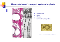 The evolution of transport systems in plants Introduction Xylem Phloem Summation; integration http://www.xs4all.nl/~steurh/eng/rhynia.html evolution or revolution ? In the beginning…………. carbon oxygen ozone nitrogen light hydrogen migration air hydrocarbons stress land water ? ? ? ? The symplast and apoplast Symplast - Defined as that region of the living plant, that is bounded (enclosed by) a plasmamembrane. The cells forming this group are called a DOMAIN, and DOMAINS are connected via PLASMODESMATA. next Apoplast. By definition, all regions of living plant cells NOT bounded by a plasmamembrane. This must include the CELL WALL as well as intercellular spaces. These two constitute FREE SPACE in the plant. Apoplast thus involved in the (free) movement of substances and the principal conduit in this case, must be the xylem or xylem-associated cells that LACK a plasmamembrane. xylem and phloem - the parallels Phloem and xylem have distinct physiological functions, and their distinctly-different functions give them a unique parallelism. The xylem conducts water, usually acropetally, from root to shoot and the leaf, (in a sense, from source to sink) whilst the phloem in the crudest sense, transports carbohydrate and other substances from a site of manufacture (source) to a site of utilization (sink). In both cases, tubes are involved – sieve tubes in the phloem, and xylem vessels and narrower trachieds in the xylem. Both systems are associated with parenchymatous elements, and both are relatively delicate structures. It is now more than 160 years since, for example, the publication of Hartig’s descriptions of the bark of trees. There is much new information concerning structure and function, but also, we have become more aware of the fossil record, allowing us to trace the evolution of these remarkable conduits through some 500 million years of evolution. //3 phloem - early work 1. In 1837, Theodor Hartig published his work on the organization of the trunks of forest trees, and commented on the then “completely uninvestigated elementary organs” of what was called the ‘sap skin’ (Safthaut) of trees. 2. Significantly, Hartig described three types of cell – Siebfasern, Siebröhren and keulenförmige Saftröhen – in English, the sieve elements and laticifers common in Euphorbia for example. 3. The Siebröhren and Siebfasern correspond entirely to what we describe today as sieve tubes and in the latter case, to sieve cells, associated cambial cells, phloem parenchyma as well as sclerenchymatous elements. 4. In 1858, Nägeli coined the term ‘phloem’ top describe the food conducting systems in higher plants. // 1-4 Moving on. Developing the xylem transport system Initially, transport of water in plants that had just emerged onto land, would have been a physiological necessity – Why? Ancient origins Indeterminate hydroid or stromatoporoids in Starostinella nordica Upper Permian ca 280 MY Since then many examples in which hydroids appear. Stelar arrangements and tissue organisation All comparisons serve to underscore the fundamental relationship in early vascular plants between the evolution of increased complexity in stelar architectures and the evolution of complex lateral branches and leaves. water transporting function is the crucial factor in the evolution of the various steles. Vascular plants seem to be the ideal study group for integrating developmental process directly into analysis of homology and estimation of phylogenetic relationship. summary: main evolutionary trends TRACHEID DIMORPHISM 1 •pit membrane diameter decreases •reduction in size of borders on pits •fewer pits tracheid fiber tracheid libriform fiber summary: main evolutionary trends TRACHEID DIMORPHISM 2 tracheid fiber tracheid libriform fiber SPECIAL EVOLUTIONARY TRENDS tracheid dimorphism: vasicentric tracheids + septate fiber tracheids fiber tracheid dimorphism: fiber tracheids + vasicentric tracheids fiber dimorphism: parenchymalike fibers (or parenchyma) + libriform fibers Narrow is best ? Tracheids in their various forms are thus the principal water conducting cells in gymnosperms, as well as in vesselless dicotyledons. They present many advantages in terms of transport. Think for example, of the boreal forests – what is the species composition? click Mostly gymnosperm, some vesselless angiosperms Why? Vessel bearing dicotyledon Vessel elements and tracheids much shorter than those in vessel-less wood Transition from vessel-less to vessel-bearing wood. Qualitatively, a marked drop in the length of the tracheid to primitive vessel occurs. Vessel end retains remnant primary wall strands Scalariform perforation plates Scalariform perforation plates are indicative of the evolutionary level of the species, just as shortening of the vessel elements is a (reliable) factor indicative of evolutionary advancement, so to is the shape, structure and hence, morphology of the scalariform perforation plate associated with the end wall perforation of a vessel. Bordered bars in primitive species vary but all are subdivided as in this example. Overview of variation and evolutionary lines of scalariform perforation plates evolutionary paths towards simplified perforation plates. Does this suggest environmental and cliamatalogical influences? Variations and evolutionary lines of scalariform perforation plates 1. scalariform = ladder-like structure Perforation plates become simpler, but still flake- or strand-like. Advantages? Disadvantages? Climatology? Variations and evolutionary lines of scalariform perforation plates 2. coalescence of pores into larger structures. Advantages? Disadvantages? Climatology? Lateral wall pitting, in tracheids and vessels scalariform transitional opposite alternate The bordered pit – micro-engineered flow control Once the pit membrane pores are blocked, flow is impeded minimum air bubble size is larger than the size of the pit membrane pores weakening of the wall is less