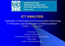 ICT ANALYSIS “Application of Information and Communication Technology to Production and Dissemination of Official statistics” 10 May – 11 July 2007 M Q Hasan Lecturer/ Statistician UN Statistical Institute for Asia and the Pacific Chiba, Japan Email : hasan@unsiap.or.jp 1 Objective To gain knowledge on – ICT in general – Key ICT indicators – Situation analysis 2 Contents ICT in general ICT in an organisation ICT in a particular context Some software Discussions References 3 ICT Definition ICT consists of hardware, software, networks, and media for collection, storage, processing, transmission, and presentation of information (voice, data, text, images) Information & Communication Technology Sector Strategy Paper of the World Bank Group, April 2002, http://info.worldbank.org/ict/ICT_ssp.html 4 ICT Sector ICT sectors are defined by the OECD as a combination of manufacturing and services industries that capture, transmit and display data and information electronically. 5 OECD Key ICT indicators 1. Access lines and channels in total /per 100 inhabitants for OECD 2. Mobile subscribers in total / per 100 inhabitants for OECD 3. Internet subscribers in total for OECD 4a. Broadband subscribers per 100 inhabitants in OECD countries 4b.Availability of Digital Subscriber Lines (DSL) in OECD countries 6 OECD Key ICT indicators 5. Cable TV subscribers in total for OECD 6a Households with access to the Internet in selected OECD countries 6b Households with access to a home computer 7 OECD Key ICT indicators 7a Internet penetration by size class. Percentage of businesses with ten or more employees using the Internet 7b Businesses using the Internet and businesses receiving orders over the Internet 8. Share of ICT-related occupations in the total economy in selected countries 8 OECD Key ICT indicators 9a. Telecommunication services revenue in total for OECD 9b. Mobile telecommunication services revenue in total for OECD 9c. Telecommunication infrastructure investment in total for OECD 9 OECD Key ICT indicators 11a. ICT patents as a percentage of national total (EPO) in selected countries 11b. Share of countries in ICT patents at the EPO 12. Trade in ICT goods and services 10 OECD Key ICT indicators 13. Top 50 telecommunications firms and IT firms 14. Contribution of ICT-using services to value added per person engaged 15. Contributions of ICT investment to GDP growth Source: http://www.oecd.org/ 11 Evolutions in Technology Optimisation and Performance (mainframes LANs) Integration of components Client server based systems Increased ‘simplicity’ of applications Operating systems etc. Specialized software for statistical processing Functionality/Price Accessibility 12 ICT and the NSO 13 Missions of NSO Providing statistical data for policy formation – Managing IT Planning Implementation Evaluation etc 14 Missions of NSO Managing IT Data collection Data processing including validations Data Analysis Data archiving Data dissemination 15 Missions of NSO Data collection Census Sample survey Administrative records Others 16 Data Processing Planning Define Data Requirements Pre- processing activities Activities, such as Sample design, Pilot survey etc. Data Analysis Data Conversion Data Cleaning Final Report Finalise Indicators Questionnaire Design Data collection Report Writing Possible Stages in data collection procedure 17 Data Input Electronic Forms Computer Assisted Interviewing (CAI) Computer assisted data entry Administrative records Imaging/OMR/OCR etc Keying 18 Throughput Data integration and data processing Classification Imputation Analysis 19 Data output Data archiving Data mining Data confidentiality Electronic online dissemination – Electronic offline dissemination – Real time, etc. Manual intervention Publication Etc. 20 Further output Data management – DBMS etc. Content Management – System analysis 21 ICT ANALYSIS 22 ICT and the NSO Computer hardware – CPU Computer hardware - accessories Computer software – – – – – Operating systems Applications Software Development Software Resource sharing tools Etc. Computer network equipments 23 ICT and the NSO NSO Concerns Available Expertise Development Trainings Cost – – Establishment Procurement – H/W, S/W, L/W Maintenance 24 ICT and the NSO Factors influencing the choice of software Functionality Robust and Reliable Easy to learn/operate/maintain Hardware platform Human resources Affordable Training Previous knowledge/reference 25 ICT and the NSO Selected areas of interest Hardware and operating system Communication (software side) Communication (network side) Storage Security Data Conversion Back-end Servers Report Preparations and Presentations Graphics 26 ICT and the NSO Hardware and operating system – Operating systems Different flavors of Unix – Sun Solaris, HP Unix etc Linux Windows based system Apple Macintosh based systems Etc. 27 ICT and the NSO Computer software – Application / Development software Data entry, processing, management Statistical Analysis Data Dissemination Database Compilers AntiVirus and Security Content Management 28 Free software Users' have freedom to run, copy, distribute, study, change and improve the software. More precisely, it refers to four kinds of freedom – The freedom to run the program, for any purpose (freedom 0). – The freedom to study how the program works, and adapt it to your needs (freedom 1). Access to the source code is a precondition for this. – The freedom to redistribute copies so you can help your neighbor (freedom 2). – The freedom to improve the program, and release your improvements to the public, so that the whole community benefits (freedom 3). Access to the source code is a precondition for this. http://www.gnu.org/philosophy/free-sw.html 29 Open Source Initiative (OSI) Non-profit corporation dedicated to managing and promoting the Open Source Definition for the good of the community, specifically through the OSI Certified Open Source Soft