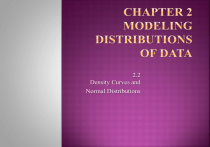 2.2 Density Curves and Normal Distributions Exploring Quantitative Data In Chapter 1, we developed a kit of graphical and numerical tools for describing distributions. Now, we’ll add one more step to the strategy. Exploring Quantitative Data 1. Always plot your data: make a graph, usually a dotplot, stemplot, or histogram. 2. Look for the overall pattern (shape, center, and spread) and for striking departures such as outliers. 3. Calculate a numerical summary to briefly describe center and spread. 4. Sometimes the overall pattern of a large number of observations is so regular that we can describe it by a smooth curve. A density curve is a curve that *is always on or above the horizontal axis, and *has area exactly 1 underneath it. A density curve describes the overall pattern of a distribution. The area under the curve and above any interval of values on the horizontal axis is the proportion of all observations that fall in that interval. A symmetric curve balances at its center because the two sides are identical. The mean and median of a symmetric density curve are equal, as in figure (a) below. Distinguishing the Median and Mean of a Density Curve The median of a density curve is the equal-areas point, the point that divides the area under the curve in half. The mean of a density curve is the balance point, at which the curve would balance if made of solid material. The median and the mean are the same for a symmetric density curve. They both lie at the center of the curve. The mean of a skewed curve is pulled away from the median in the direction of the long tail. *A density curve is an idealized description of a distribution of data. *We distinguish between the mean and standard deviation of the density curve and the mean and standard deviation computed from the actual observations. *The usual notation for the mean of a density curve is µ (the Greek letter mu). We write the standard deviation of a density curve as σ (the Greek letter sigma). Normal Distributions *One particularly important class of density curves are the Normal curves, which describe Normal distributions. *All Normal curves have the same shape: symmetric, single-peaked, and bell-shaped *Any specific Normal curve is completely described by giving its mean µ and its standard deviation σ. Two Normal curves, showing the mean µ and standard deviation σ. Normal distribution and Normal curve A Normal distribution is described by a Normal density curve. Any particular Normal distribution is completely specified by two numbers: its mean µ and standard deviation σ. *The mean of a Normal distribution is the center of the symmetric Normal curve. *The standard deviation is the distance from the center to the change-ofcurvature points on either side. *We abbreviate the Normal distribution with mean µ and standard deviation σ as N(µ,σ). Why are the Normal distributions important in statistics? *Normal distributions are good descriptions for some distributions of real data. *Normal distributions are good approximations of the results of many kinds of chance outcomes. *Many statistical inference procedures are based on Normal distributions. The 68–95–99.7 Rule Although there are many Normal curves, they all have properties in common. The 68-95-99.7 Rule In the Normal distribution with mean µ and standard deviation σ: *Approximately 68% of the observations fall within σ of µ. *Approximately 95% of the observations fall within 2σ of µ. *Approximately 99.7% of the observations fall within 3σ of µ. Example 1: The distribution of Iowa Test of Basic Skills (ITBS) vocabulary scores for 7th grade students in Gary, Indiana, is close to Normal. Suppose the distribution is N(6.84, 1.55). a) What percent of the ITBS vocabulary scores are less than 3.74? Show your work. Notice that a score of 3.74 is exactly two standard deviations below the mean. By the 68–95–99.7 rule, about 95% of all scores are between μ − 2σ = 6.84 − (2)(1.55) = 6.84 − 3.10 = 3.74 and μ + 2σ = 6.84 + (2)(1.55) = 6.84 + 3.10 = 9.94 The other 5% of scores are outside this range. Because Normal distributions are symmetric, half of these scores are lower than 3.74 and half are higher than 9.94. That is, ab out 2.5% of the ITBS scores are below 3.74. b) What percent of the scores are between 5.29 and 9.94? Show your work. Let’s start with a picture. Figure (b) shows the area under the Normal density curve between 5.29 and 9.94. We can see that about 68% + 13.5% = 81.5% of ITBS scores are between 5.29 and 9.94. The Standard Normal Distribution All Normal distributions are the same if we measure in units of size σ from the mean µ as center. The standard Normal distribution is the Normal distribution with mean 0 and standard deviation 1. If a variable x has any Normal distribution N(µ,σ) with mean µ and standard deviation σ, then the standardized variable z x has the standard Normal distribution, N(0,1). The Standard Normal Table Because all Normal distributions are the same when we standardize, we can find areas under any Normal curve from a single table. The standard Normal Table (Table A) is a table of areas under the standard Normal curve. The table entry for each value z is the area under the curve to the left of z. A common student mistake is to look up a z-value in Table A and report the entry corresponding to that z-value, regardless of whether the problem asks for the area to the left or to the right of that z-value. To prevent making this mistake, always sketch the standard Normal curve, mark the z-value, and shade the area of interest. And before you finish, make sure your answer is reasonable in the context of the problem. Suppose we want to find the proportion of observations from the standard Normal distribution that are less than 0.81. We can use Table A: P(z < 0.81) = .7910 Z .00 .01 .02 0.7 .7580 .7611 .7642 0.8 .7881 .7910 .7939 0.9 .8159 .8186 .8212 Example 2: Find the proportion of observations from the standard N