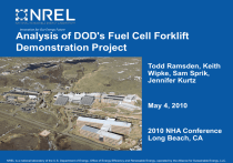 Innovation for Our Energy Future Analysis of DOD's Fuel Cell Forklift Demonstration Project Todd Ramsden, Keith Wipke, Sam Sprik, Jennifer Kurtz May 4, 2010 2010 NHA Conference Long Beach, CA NREL is a national laboratory of the U.S. Department of Energy, Office of Energy Efficiency and Renewable Energy, operated by the Alliance for Sustainable Energy, LLC. Outline • • • • • Project Overview NREL Data Handling Analysis Results Planned Analyses Business Case for FC Forklifts • Summary Innovation for Our Energy Future • EPACT 2005 – Section 783 requires lease/purchase of stationary and portable fuel cells for electrical power • Executive Order 13423 provides framework for early adoption of fuel cell systems Fuel Cell Stack Costs (Dollars ($) per kW) • Encourage deployment of fuel cells at volumes which can lower costs and impact the initial commercialization of hydrogen and fuel cell technologies • Enable government acquisitions with aim towards promoting market acceptance and producing data to validate technologies in real-world applications $4,000 4000 • Policies exist to require $3,500 3500 federal government to $3,000 3000 lead by example $2,500 2500 $2,000 2000 $1,500 1500 $1,000 1000 $500 Government Acquisitions (Units per year) Context – Federal Government Efforts 500 $0 0 2005 2010 ―Baseline ―Government Acquisition Program ― Material Handling Equipment ― Backup Power (1–5 kW) Innovation for Our Energy Future 2015 2020 Source: David Greene, ORNL; K.G. Duleep, Energy and Environmental Analysis, Inc. Bootstrapping a Sustainable North American PEM Fuel Cell Industry: Could a Federal Acquisition Program Make a Difference? Overview of DLA FC Forklift Demonstration 4 Fuel Cell Forklift Demonstration Projects • DOD’s Defense Logistics Agency uses over 3,000 forklifts to accomplish its warehousing operations in DOD’s 26 Defense Distribution Centers • DLA has selected 4 warehouse sites to operate and demonstrate multiple hydrogen generation, dispensing and fuel cell technologies to power materials handling equipment (MHE) for a 24-month pilot phase • DDSP is DLA’s first fuel cell MHE pilot site • Ribbon cutting: February 10, 2009 Locations: DDSP: 40 forklifts, delivered (cryogenic) hydrogen, indoor dispensing DDWG: 20 forklifts, hydrogen via onsite natural gas reformation, mobile refueling DDJC: 20 forklifts, hydrogen via solar electrolysis Ft. Lewis: 19 forklifts, 1 bus, wastewater digester gas hydrogen, mobile refueling Duration: 2 years of operation at each site Technology Validation: NREL to perform data analysis to validate fuel cell technologies Innovation for Our Energy Future Goals of DLA FC Forklift Demonstration • Be an early adopter and principal demonstrator of fuel cell technologies in MHE applications • Promote competition in the marketplace, provide a market demand, and foster commercialization • Support improved Technology and Manufacturing Readiness levels • Spiral development of FC technologies • Assess and highlight the business case (value proposition) for fuel cells in forklift applications NREL’s data analysis used for TRL and business case assessment Innovation for Our Energy Future NREL Project Role Independent Technology Assessment • Analyze fuel cell system and hydrogen infrastructure technologies, including performance, operation, and safety • Establish a baseline of real-world fuel cell operation and maintenance data and identify technical/market barriers • Leverage data processing and analysis capabilities from the DOE fuel cell vehicle Learning Demonstration project • Support growth of fuel cell markets by analyzing technology and performance relevant to the value proposition • Report on technology to fuel cell and hydrogen stakeholders Innovation for Our Energy Future NREL Data Handling and Analysis Bundled data delivered to NREL quarterly Composite Data Products (CDPs) •Aggregated data across multiple systems, sites, and teams • Publish analysis results without revealing proprietary data every 6 months Internal analysis completed quarterly Detailed Data Products (DDPs) •Individual data analyses • Identify individual contribution to CDPs • Only shared with partner who supplied data every 6 months Innovation for Our Energy Future Defense Depot Susquehanna PA Project • DDSP is the first DLA fuel cell forklift site • Project partners: Air Products, Plug Power, East Penn/Nuvera • Over 12 months of operation and detailed data available • Available data provides a realworld understanding of fuel cell forklift operations • Data from this forklift installation used to develop the initial Composite Data Products on early market deployments of fuel cell forklifts Innovation for Our Energy Future Experience to Date at DDSP Based on project data through December 31, 2009 Innovation for Our Energy Future Deployment & Usage – Forklift Operations Forklift Operating Hours By Quarter Combined Fleet Through 2009Q4 18000 Total Fleet Operating Hours = 53843 16000 Nearly 54,000 hours of operation by the combined fleet of 40 fuel cell forklifts Total Fleet Op Hours 14000 12000 10000 8000 6000 4000 2000 Forklifts in Operation By Quarter Combined Fleet Through 2009Q4 0 50 09Q1 09Q2 09Q3 09Q4 45 NREL cdpFL11 Created: Apr-19-10 11:18 AM 40 35 About 15,000 hours of operation each quarter Count 30 25 20 15 10 5 0 2009 Q1 NREL cdpFL01 Created: Apr-19-10 11:18 AM Innovation for Our Energy Future 2009 Q2 2009 Q3 2009 Q4 Deployment & Usage – Refueling & H2 Use Hydrogen Dispensed By Quarter Dispenser Data for Combined Fleet 3000 Cumulative Hydrogen Dispensed = 8566 kg Hydrogen Dispensed [kg] 2500 Over 8,500 kg of hydrogen dispensed, about 2,400 kg each quarter 2000 1500 1000 500 0 Fueling Events By Quarter Dispenser Data for Combined Fleet 2009Q1 2009Q2 2009Q3 5000 2009Q4 NREL cdpFL04 Created: Apr-19-10 11:19 AM 4500 Cumulative Fuelings = 14659 4000 Nearly 15,000 fueling events, about 4,000 fuelings