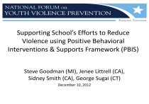 Supporting School’s Efforts to Reduce Violence using Positive Behavioral Interventions & Supports Framework (PBIS) Steve Goodman (MI), Jenee Littrell (CA), Sidney Smith (CA), George Sugai (CT) December 10, 2012 3 Purposes: Describe…. 1. 2. 3 PBIS examples of Features of how PBIS school-wide multiframework has tiered behavior been used to framework (PBIS) improve for addressing conditions for school violence learning 3. Enhance relationships between juvenile justice, education, & community leaders Sidney Smith Steve Goodman Dep. Dir., Children’s Behavioral Health, Monterey County Behavioral Health, Salinas, CA Dir. MI Integrated Behavior & Learning Support Initiative, Ottawa Area Intermediate S.D., Holland, MI Jenee Littrell Dir. of Guidance & Wellness Grossmont Union High School District, El Cajon, CA George Sugai Dir. Ctr. Behavioral Education & Research, Neag School of Education, University of CT, Storrs, CT Overview: School-wide Multitiered Systems Framework George Sugai University of Connecticut George.sugai@uconn.edu www.CBER.org www.PBIS.org High rates of reactive management Minor problem behavior linked to major consequences Increasingly negative school climates Mismatch between problem & intervention Nov 1985 Kappan Getting Tough School Discipline Challenge: Academic & behavior success (failure) are linked! Teaching to Corner CONTINUUM OF SCHOOL-WIDE INSTRUCTIONAL & POSITIVE BEHAVIOR SUPPORT FEW ~5% ~15% SOME Primary Prevention: School-/ClassroomWide Systems for All Students, Staff, & Settings ALL ~80% of Students Tertiary Prevention: Specialized Individualized Systems for Students with High-Risk Behavior Secondary Prevention: Specialized Group Systems for Students with At-Risk Behavior PBIS (aka SWPBS) is Framework for enhancing adoption & implementation of Continuum of evidence-based interventions to achieve Academically & behaviorally important outcomes for All students Prevention Logic for All Redesign of teaching environments…not students Prevention Objectives Prevention Actions Prevent Decrease worsening & Eliminate reduce developmen triggers & t of new intensity of maintainers problem of problem existing problem behaviors behaviors behaviors Add triggers Teach, & monitor, & maintainers acknowledge prosocial of prosocial behavior behavior Biglan, 1995; Mayer, 1995; Walker et al., 1996 IMPLEMENTATION W/ FIDELITY CONTINUUM OF CONTINUOUS EVIDENCE-BASED PROGRESS INTERVENTIONS MONITORING UNIVERSAL SCREENING MTSS PBIS DATA-BASED DECISION MAKING & PROBLEM SOLVING CONTENT EXPERTISE & FLUENCY TEAM-BASED IMPLEMENTATION Multi-tiered Systems of Support Whole-school Data-driven Prevention-based framework For improving learning outcomes For all students Through layered continuum Of evidence-based practices & systems Math Intensive Science Targeted Tech Continuum of Support “Theora” Spanish Reading Writing Soc skills Universal Soc Studies Basketball Dec 7, 2007 Label behavior…not people Intensive Anger man. Prob Sol. Continuum of Support: “Molcom” Targeted Acc. Fdbk Ind. play Adult rel. Self-assess Attend. Universal Coop play Peer interac Align behavioral Dec 7, 2007supports ESTABLISHING CONTINUUM of SWPBS TERTIARYPREVENTION PREVENTION TERTIARY •• Function-based support •• Wraparound •• Person-centered planning •• •• SECONDARY SECONDARY PREVENTION PREVENTION •• Check in/out •• Targeted social skills instruction •• Peer-based supports •• Social skills club •• PRIMARY PRIMARY PREVENTION PREVENTION •• Teach SW expectations •• Proactive SW discipline •• Positive reinforcement •• Effective instruction •• Parent engagement •• RCT & Group Design PBIS Studies Bradshaw, C.P., Koth, C. W., Thornton, L. A., & Leaf, P. J. (2009). Altering school climate through school-wide Positive Behavioral Interventions and Supports: Findings from a grouprandomized effectiveness trial. Prevention Science, 10(2), 100-115 Bradshaw, C. P., Koth, C. W., Bevans, K. B., Ialongo, N., & Leaf, P. J. (2008). The impact of school-wide Positive Behavioral Interventions and Supports (PBIS) on the organizational health of elementary schools. School Psychology Quarterly, 23(4), 462-473. Bradshaw, C. P., Mitchell, M. M., & Leaf, P. J. (2010). Examining the effects of School-Wide Positive Behavioral Interventions and Supports on student outcomes: Results from a randomized controlled effectiveness trial in elementary schools. Journal of Positive Behavior Interventions, 12, 133-148. Bradshaw, C. P., Reinke, W. M., Brown, L. D., Bevans, K. B., & Leaf, P. J. (2008). Implementation of school-wide Positive Behavioral Interventions and Supports (PBIS) in elementary schools: Observations from a randomized trial. Education & Treatment of Children, 31, 1-26. Bradshaw, C. P., Waasdorp, T. E., & Leaf, P. J. (in press). Effects of school-wide positive behavioral interventions and supports on child behavior problems. Pediatrics. Horner, R., Sugai, G., Smolkowski, K., Eber, L., Nakasato, J., Todd, A., & Esperanza, J., (2009). A randomized, wait-list controlled effectiveness trial assessing school-wide positive behavior support in elementary schools. Journal of Positive Behavior Interventions, 11, 133-145. Horner, R. H., Sugai, G., & Anderson, C. M. (2010). Examining the evidence base for school-wide positive behavior support. Focus on Exceptionality, 42(8), 1-14. Waasdorp, T. E., Bradshaw, C. P., & Leaf, P. J. (in press). The impact of school-wide positive behavioral interventions and supports (SWPBIS) on bullying and peer rejection: A randomized controlled effectiveness trial. Archives of Pediatrics and Adolescent Medicine. PRACTICE “Don’t Throw Stones!” Effective IMPLEMENTATION Effective Maximum Student Benefits Not Effective Fixsen & Blase, 2009 Not Effective Colorado Data Colorado Data 2012-13 State of Colorado TOTAL SUSPENSIONS Classroom - ISS - OSS 115,000 110,000 105,000 100,000 95,000 90,000 85,000 All Colorado Schools Suspensions by Incident Type (20