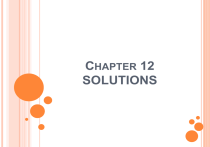 CHAPTER 12 SOLUTIONS CHAPTER 12 Section 1 – Types of Mixtures Section 2 – The Solution Process Section 3 – Concentration of Solutions 12.1 - TYPES OF MIXTURES Distinguish between electrolytes and nonelectrolytes. List three different solute-solvent combinations. Compare the properties of suspensions, colloids, and solutions. Distinguish between electrolytes and nonelectrolytes. INTRODUCTION Sugar & Water is a mixture Soil is a mixture 2 or more different substances Homogeneous Mixture (uniform properties) Heterogeneous Mixture (nonuniform properties) SOLUTIONS Solution: homogeneous mixture of two or more substances Solute: substance dissolved in a solution Solvent: substance doing the dissolving (usually in a large quantity) Can be any combination of solid, liquid, or gas A homogeneous mixture of solids is called an alloy Ex: brass – “solution” of zinc in copper EXAMPLES OF SOLUTIONS In these examples, the substance with the greater volume is the solvent PARTICLE MODELS FOR GOLD AND A GOLD ALLOY SOLUTIONS Soluble: capable of being dissolved Insoluble: not capable of being dissolved - What substances are soluble? Depends on your solute & your solvent (and other factors, too) In general, follow the rule: “like dissolves like” POLARITY & SOLUBILITY Polar substances dissolve in polar substances Ionic compounds Polar molecules Nonpolar substances dissolve in nonpolar substances Nonpolar molecules Organic compounds LIKE DISSOLVES LIKE HETEROGENEOUS VS. HOMOGENEOUS SUSPENSIONS Suspension: particles in a solvent are so large they settle out unless the mixture is constantly stirred What is an example of a suspension? Oil and water Sand and water COLLOIDS Colloid: particles are small enough to be suspended throughout the solvent by constant movement of the surrounding molecules (particles that are intermediate in size) Colloidal particles make up the dispersed phase, and water is the dispersing medium. What are some examples of Colloids? Paint (solid in liquid) Whipped cream (gas in liquid) fog EMULSIONS – A SPECIFIC TYPE OF COLLOID a mixture of two or more immiscible (un-blendable) liquids TYNDALL EFFECT Tydnall Effect: when light is scattered by colloidal particles dispersed in a transparent medium (like water) This is used to distinguish between a solution and a colloid SOLUTIONS, COLLOIDS, AND SUSPENSIONS Solutions Colloids Suspensions Type of Mixture Homogeneous Heterogenous Particle Size 0.01 – 1 nm 1 – 1000 nm > 1000 nm Separation? No separation No separation Particles settle Filtration Possible? No No Yes Tyndell Effect? No Yes Yes & No Property Uniformity? Uniform nonuniform ELECTROLYTES Electrolyte: a substance that dissolves in water to give a solution that conducts electric current What would make a good electrolyte? Ionic compounds – the positive and negative ions separate from each other in solution and are free to move making it possible for an electric current to pass through the solution Polar covalent molecules NONELECTROLYTE Nonelectrolyte: a substance that dissolves in water to give a solution that does not conduct electricity Neutral solute molecules do not contain mobile charged particles so they do not conduct electric current Example: sugars, alcohols, organic hydrocarbons STRONG AND WEAK ELECTROLYTES The strength of an electrolyte depends on the ability of a substance to form ions, or the degree of ionization or dissociation. ELECTRICAL CONDUCTIVITY OF SOLUTIONS STRONG ELECTROLYTES Strong Electrolyte: conducts electricity well due to presence of all or almost all of the dissolved compound as ions What is an example of a strong electrolyte? Strong acids (HCl, HNO3) Strong bases (NaOH) ionic compounds (assuming their soluble) WEAK ELECTROLYTES Weak Electrolyte: conducts electricity poorly due to presence of a small amount of the dissolved compound as ions While some of the compound ionizes, some does not What is an example of a weak electrolyte? Weak acids and bases Ex: Acetic Acid, H3PO4 & NH3 (weak base) – HF H O ( aq ) + F (aq ) 3 [HF] >> [H+] and [F–] MODELS FOR STRONG AND WEAK ELECTROLYTES AND NONELECTROLYTES 12.2 - THE SOLUTION PROCESS List and explain three factors that affect the rate at which a solid solute dissolves in a liquid solvent. Explain solution equilibrium, and distinguish among saturated, unsaturated, and supersaturated solutions. Explain the meaning of “like dissolves like” in terms of polar and nonpolar substances. List the three interactions that contribute to the enthalpy of a solution, and explain how they combine to cause dissolution to be exothermic or endothermic. Compare the effects of temperature and pressure on solubility. FACTORS AFFECTING THE RATE OF DISSOLUTION 1. Increase the surface area -- because dissolution occurs at the surface 2. Stirring or shaking -- increases contact between solvent and solute 3. Increase the temperature -- increases collisions between solute and solvent and are of higher energy DISSOLVING PROCESS VIDEO SOLUBILITY If you add spoonful after spoonful of sugar to tea, eventually no more sugar will dissolve. There is a limit to the amount of solute that can dissolve in a solvent. SOLUBILITY VALUES Solubility: measure of how much solute can be dissolved in a specific amount of solvent at specific temperature Specifically, how much is required to form a saturated solution Example: solubility of sugar is 204 g per 100 g of water at 20OC Solubilities vary widely and must be determined experimentally SOLUTIONS Saturated Solution: contains the maximum amount of dissolved solute How does this happen? When a solute is added, the molecules leave the solid surface and move about at random. 1. 2. As more solute is added, more collisions occur between dissolved solute particles. Some of the solute molecules return to the crystal. 3. When maximum solubility is reached molecules are returning to the solid form at the same rate they are going into solution. This is called solution equilibrium SOLUTIONS