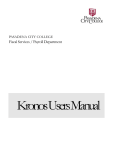 PASADENA CITY COLLEGE Fiscal Services / Payroll Department KronosUsersManual PASADENA CITY COLLEGE FISCAL SERVICES Kronos Users Manual Kronos Workforce Central Suite, Version 6.1 @ www.pasadena.edu 1570 East Colorado Blvd • Suite C203 Pasadena, CA 91106 Phone 626.585.7451 • Fax 626.585.7968 Table of Contents Workforce Timekeeper for Pasadena City College ................... 1 Logging on and off ................................................................... 2 Timekeeping Cycle Overview ................................................... 3 Additional Guidance ................................................................. 4 Workforce Timekeeper: Guide for Employees .......................... 5 Using the Inbox ........................................................................ 6 Using the Messages tab.................................................................. 6 Using the Tasks tab ........................................................................ 8 Using My Requests .................................................................. 9 Entering time .......................................................................... 10 Classified Employee timecard ....................................................... 11 Certificated Employee timecard .................................................... 11 Classified Hourly Employee (Time Stamp).................................... 12 Approving timecards ..................................................................... 14 Viewing timecard totals ................................................................. 14 Using calendars ..................................................................... 15 Viewing reports ...................................................................... 15 Workforce Timekeeper: Guide for Department Administrators 16 Employee Information ............................................................ 16 Navigation .............................................................................. 16 The Data Entry User home page .................................................. 17 Timekeeping cycle overview................................................... 18 Finding and acting on employee data ..................................... 18 Saving data ................................................................................... 18 Finding employees using QuickFind ............................................. 18 Acting on employee data in Genies .............................................. 19 Working from Genies .................................................................... 19 Managing timecards ............................................................... 21 About calculating and displaying totals ......................................... 21 Common timecard tasks ............................................................... 22 Entering paid time off .................................................................... 22 Transferring time ........................................................................... 23 Approving and signing off timecards ............................................. 24 Modifying previously submitted timecards..................................... 24 Printing timecards ......................................................................... 25 Obtaining information about accruals ............................................ 25 i Sending e-mail about timecards .................................................... 26 Group editing ......................................................................... 26 Using the Inbox ...................................................................... 30 Opening messages ....................................................................... 30 Sending messages ....................................................................... 30 Replying to messages ................................................................... 30 Deleting messages ....................................................................... 31 Printing messages ........................................................................ 31 Completing assigned tasks ........................................................... 31 Reassigning assigned tasks.......................................................... 31 Managing time using calendars .............................................. 31 Using the Work & Absence Summary ........................................... 32 Sending workflow notifications ............................................... 32 Advanced searching ............................................................... 33 Finding employees using HyperFind ............................................. 33 Creating HyperFind queries .......................................................... 33 Approving Scheduled Requests ............................................. 34 Scheduling employees ........................................................... 35 Scheduler concepts....................................................................... 35 Schedule views ............................................................................. 36 Building schedules ........................................................................ 37 Creating shifts for individuals ........................................................ 37 Creating schedule patterns for individuals .................................... 39 Creating temporary changes to schedules .................................... 40 Entering planned leave time.......................................................... 41 Entering transfers .......................................................................... 41 Using schedule groups.................................................................. 42 Generating reports ................................................................. 46 Accessing reports using Genies .................................................... 48 Printing rep