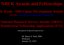 NIH K Awards and Fellowships K Kiosk - NIH Career Development Awards http://http://grants.nih.gov/training/careerdevelopmentawards National Research Service Awards (NRSA) Postdoctoral Fellowship Applications (F32) http://grants.nih.gov/training/nrsa.htm Dr. Harry S. Nick, PhD Professor January 22, 2015 Why a K award? To allow a professional candidate, who has completed training, the opportunity to transition into a faculty position and compete at the NIH RO1 level. All mentored K awards require that the applicant: be a U.S. citizen or permanent resident of the U.S. be located at a U.S. institution. have preliminary data on which to base his/her hypothesis driven 3-5 year research project in an area of interest to the NIH Institute. have one or more mentors. be able to devote, 9 calendar months (75%) effort to the K-award. Standard K deadlines (new applications)*: Feb. 12, June 12, and Oct. 12 Types of K Awards Mentored K01 K08 K07 K12 K23 K25 K99 Independent K02 K22 R00 Mid-Career K24 K18 Career Award Wizard An Excel file with K award statistics per institute Career Development Awards by Activity Code and NIH Institutes/Centers (246 KB) - Fiscal Years 2003 - 2010 http://grants.nih.gov/training/careerdevelopmentawards.htm K08 The Mentored Clinical Scientist Development Award (K08) provides support to develop outstanding clinician research scientists. The objective of the NIH Mentored Clinical Scientist Research Career Development Award (K08) program is to provide salary and research support for a sustained period of “protected time” (3-5 years) to support didactic study and/or mentored research for individuals with clinical doctoral degrees (e.g., M.D., D.D.S., D.M.D., D.O., D.C., O.D., N.D., D.V.M., Pharm.D., or Ph.D. in clinical disciplines). The K08 provides support for an intensive, mentored research career to develop experience in biomedical or behavioral research, including translational research leading to research independence. NIH: Mentored Clinical Scientist Research Career Development Award (Parent K08) (PA11-193) (See NOT-OD-11-063) NCI: NCI Mentored Clinical Scientist Research Career Development Award to Promote Diversity (K08) (PAR-12-051) NIAMS: Mentored Clinical Scientist Research Career Development Award in Muscular Dystrophy Research (K08) (PA-11-077) K08 cont. Candidates for this award must have a clinical doctoral degree and cannot have been a PI on another NIH grant. The candidate must identify a mentor or mentoring team who will supervise the proposed career development and research experience. The candidate must have a “full-time” appointment at the academic institution that is the applicant institution (VA appointments must be discussed with NIH staff). The total project period may not exceed 5 years. The salary proposed must be appropriately related to the existing salary structure. Applicants must download the SF424 (R&R) application package. K08 cont. Application: •Candidate’s Background •Career Goals and Objectives •Career Development/Training Activities During Award Period •Training in the Responsible Conduct of Research •Statements by Mentor, Co-mentor(s), Consultants, Contributors •Description of Institutional Environment •Institutional Commitment to the Candidate’s Research Career Development (75% time!) •Research Strategy •Appendix •Letters of Reference K08 cont. RESEARCH STRATEGY A sound research project consistent with the candidate’s level of research development and career development plan. The research description should demonstrate the quality of the candidate’s research, the novelty, significance, creativity and approach, and the ability of the candidate to carry out the research. The application must describe the relationship between the proposed research plan and the mentor’s research. If more than one mentor is proposed, the respective areas of expertise and responsibility should be described. Data and Safety Monitoring (when applicable): Candidates proposing to conduct clinical trials should consult with relevant IC staff for specific NIH institute requirements. Example Specific Aims Advances in cancer therapy have improved survival rates; however primary ovarian failure and infertility can be major side effects of chemotherapy in childhood and adult female cancer patients. The associated threat on fertility in patients of reproductive age is often as devastating a psychological factor as the cancer diagnosis itself. In females, localized radiation treatment or systemic chemotherapy with alkylating agents can lead to chemotherapy-induced amenorrhea (CIA) and premature menopause through direct effects on primordial follicle (PMF) pools. Cyclophosphamide (CY), as a mainstay in breast cancer treatment, is most commonly implicated in decreasing ovarian function through direct reduction in PMF pools ( ). CY, a bifunctional alkylating agent, is also given for treatment of multiple other cancers, lupus erythematosus, and other autoimmune problems with obvious impact on the child bearing decisions of premenopausal women. Current measures to address chemotherapy-induced infertility involve cryopreservation of ovarian tissues: embryo freezing, oocyte tissue freezing and oocyte freezing ( ). Our AIMS will address an alternative approach for maintenance of ovarian reserve following CY exposure based on transcriptional activation of Foxo3a by a specific anti-metabolite, 2-deoxyglucose (2-DG) as adjuvant therapy. Studies in animal models have established that Foxo3a serves as a critical brake for the activation/transition from primordial to primary follicle. Foxo3a -/- mice exhibit a distinctive ovarian phenotype of global follicular activation leading to a phenotype indicative of primary ovarian failure and premature menopause. Similarly, female transgenic animals specifically designed to over-express constitutively active Foxo3a in oocytes were infertile caused by retarded oocyte growth and follicular development, and a