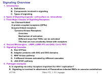Signaling Overview 1. Introduction A. Definitions B. Components involved in signaling C. Types of signaling 2. Types of Signaling Ligands - cell-surface vs. intracellular 3. Three Major Classes of Signaling Receptors Ion Channel-linked G protein-coupled receptors (GPRs) Enzyme-linked receptors Tyrosine-Kinase Receptors Overview Mechanism of activation Different ways that TKRs can be activated TKs that are non-covalently linked with receptors 4. Second Messengers: cAMP, cGMP, IP3 and DAG, Ca+2, PIP3 5. Signaling Cascades A. Ras GTPase B. Adaptor proteins with SH2 and SH3 domains C. MAP kinase pathway D. 5 different kinases activated by different cascades E. JAK-STAT pathway 6. Pathogen examples A. Is signaling via entry receptors important for HIV-1 replication? B. Signaling is involved in attachment of Plasmodium-infected RBCs to vascular endothelium 4/27/06 Pabio 552, J. R. Lingappa 1 Signaling Overview 1. Introduction A. Definitions Signaling: Cell-cell communication via signals. Signal transduction: Process of converting extracellular signals into intra-cellular responses. Ligand: The signaling molecule. Receptors: Bind specific ligands. Transmit signals to intracellular targets. Different receptors can respond differently to the same ligand. B. Components involved in signaling: Ligands Receptors Intracellular Signaling Proteins Intermediary Proteins Enzymes Second Messengers Target Proteins Inactivating Proteins 4/27/06 Overview of Signal Transduction Pabio 552, J. R. Lingappa 2 Types of Signaling Signaling Overview 1. Introduction C. Types of signaling i. Contact-dependent - via proteins in the PM: ii. Via Secreted Signals: a. Autocrine - via growth factors, cell that releases the signal is also the target. b. Paracrine - via neurotransmitters and cytokines, action on adjacent target cells. c. Endocrine - via hormones, action on distant target cells. d. Synaptic - via neurotransmitters, action on post-synaptic cell in response to electrical stimuli 2. Types of Signaling Ligands: A. Ligands that bind to cell-surface receptors: 1. Neurotransmitters (NT), i.e. norepinephrine, histamine hydrophilic (charged, polar) 2. Peptide hormones (P), i.e. insulin - can't cross membrane 3. Growth factors (GF), i.e. NGF, EGF, PDGF 4. Lipophilic signaling molecules, i.e. prostaglandins B. Ligands that bind to intracellular receptors: lipid soluble hormones that diffuse across the plasma membrane and interact with receptors in the cytosol or nucleus. i.e. steroids, thyroxine, retinoic acid, nitric oxide. 4/27/06 Pabio 552, J. R. Lingappa 3 Signaling Overview 3. Three major classes of surface receptors for signaling : 4/27/06 Pabio 552, J. R. Lingappa 4 Signaling Overview 3. Three major classes of surface receptors for signaling, cont.: A. Ion Channels: won’t be covered here B. G protein-coupled receptors (GPRs): largest family of cell surface receptors; present in all eukaryotes; ex: HIV chemokine receptors. C. 1. Overview: a. 7 trans-membrane spanning domains b. Act as receptors for many different ligands including NT, H, and P c. Large amount of receptor diversity, but common mechanism of action d. Transmit signals to intracellular targets via G proteins e. Targets are plasma membrane bound enzymes or ion channels 2. Mechanism of Activation of GPRs: a. Binding of ligand to extracellular domain of GPRs induces conformational change that allows cytosolic domain of the receptor to bind to inactive G protein at inner face of PM. b. This interaction activates the G protein, which dissociates from the receptor c. Activated G protein subunit can now bind GTP instead of GDP, causing dissociation into activated vs. subunits. Each of these can go on to activate target proteins. 4/27/06 Pabio 552, J. R. Lingappa 5 Monomeric GTPase GAP binds to the GTP-bound GTPase and increases the rate of GTP hydrolysis GEF binds to the GTPase and alters its conformation so it releases GDP 4/27/06 Pabio 552, J. R. Lingappa 6 Signaling Overview 3. Three major classes of surface receptors for signaling, cont.: C. Enzyme-linked receptors: 1. Tyrosine kinase-linked receptors (TKRs). A. Overview of TKRs: 1. Cell surface receptors that are directly linked to intracellular enzymes (kinases). 2. Includes receptors for most growth factors (NGF, EGF. PDGF), insulin, and Src. 3. Common structure: N terminal extracellular ligand-binding domain, single TM domain, cytosolic C-terminal domain with tyrosine kinase activity. 4. Can be single polypeptide or dimer. Examples of tyrosine kinase-linked receptors (TKRs): 4/27/06 Pabio 552, J. R. Lingappa 7 Signaling Overview 3. Three major classes of surface receptors for signaling, cont.: C. Enzyme-linked receptors, cont.: 1. Tyrosine kinase-linked receptors (TKRs) B. Mechanism of activation of TKRs: i. ligand binding induces receptor dimerization (receptor crosslinking). ii. dimerization leads to autophosphorylation of the receptor (cross-phosphorylation). iii. phosphorylation increases kinase activity & also creates specific new binding sites. iv. proteins that bind to these new binding sites transmit intracellular signals. 4/27/06 Pabio 552, J. R. Lingappa 8 How receptor tyrosine kinases work together with monomeric GTPases: 4/27/06 Pabio 552, J. R. Lingappa 9 Signaling Overview 3. Three major classes of surface receptors for signaling, cont.: C. Enzyme-linked receptors, cont.: 1. Tyrosine kinase-linked receptors (TKRs) B. Mechanism of activation of TKRs: v. example: Src homology 2 (SH2) domains on other proteins bind to phosphotyrosine containing regions of TKRs resulting in: a. localization of SH2-containing proteins at plasma membrane. b. association of SH2-containing proteins with other proteins. c. phosphorylation of SH2-containing proteins. d. activation of enzymatic activity of SH2-containing proteins. From Janeway, Immunobiology, 5th edition 4/27/06 Pabio 552, J. R. Lingappa 10 Signaling Overview 3. Three major classes of surface receptors for signaling, cont.: C. Enzyme-linked recept
