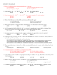 REVIEW: FINAL EXAM 1. Which of the following does not represent an increase in entropy? (a) a solid melting (c) a solute being dissolved in a solvent (b) a gas changing to a liquid (d) water being heated 2. In the reaction Mg + Cu+2 (aq) Cu + a) Mg b) Cu+2 Mg+2 (aq), the oxidizing agent is c) Mg+2 d) Cu 3. Given the reaction 2Cr + 3Cu2+ --> 3Cu + 2Cr3+ what is the net potential (Eo) for the reaction? (a) 0.40 V (c) 0.46 V (b) 1.08 V (d) 2.50 V 4. Which of the following invariably shifts a system at equilibrium to the right? a) increasing pressure b) removal of some product c) addition of a catalyst d) decreasing temperature 5. Which gaseous product is formed when dilute nitric acid reacts with silver metal in the absence of air? (A)H2 (B)O2 (C)NH3 (D)NO 6. A 65.25 g sample of CuSO4•5H2O (M = 249.7) is dissolved in enough water to make 0.800 L of solution. What volume of this solution must be diluted with water to make 1.00 L of 0.100 M CuSO4? (A) 3.27 mL (B) 81.6 mL (C) 209 mL (D) 306 mL 7. How many moles of O2 are required for the complete combustion of 2.2 g of C3H8 to form CO2 and H2O? (A)0.050 (B)0.15 (C)0.25 (D)0.50 8. In the titration of a monoprotic acid with a solution of sodium hydroxide of known concentration, what quantities are equal at the equivalence point? (A) the concentrations of hydroxide and hydronium ions (B) the number of moles of hydroxide ion added and the number of moles of hydronium ion initially present (C) the volume of sodium hydroxide solution added and the volume of acid solution initially present (D) the number of moles of hydroxide ion added and the number of moles of monoprotic acid initially present 9. When a nonvolatile solute is dissolved in a volatile solvent, which characteristic is greater for the solution than for the solvent? (A)boiling point (B)freezing point (C)rate of evaporation (D)vapor pressure 10. A chemical reaction is most likely to occur spontaneously if the: (a) free energy change(G) is negative (c) activation energy is positive (b) entropy change(S) is negative (d) heat of reaction(H) is positive 11. A 30 milliliter sample of NaOH is completely neutralized by 10 milliliters of 1.5 M HCl. What is the molarity of the NaOH solution? a) 0.25 M b) 0.50 M c) 1.5 M d) 4.5 M 12. When a crystal is added to a solution and additional crystals immediately form,the original solution was a) unsaturated b) a colloidal dispersion c) saturated d) at the triple point e) supersaturated 13. A sample of gas occupies a volume of 9.23 L at 345 K and 1.40 atm. What is its volume at 525 K and 3.20 atm? (A)2.65 L (B)6.14 L (C)13.9 L (D)32.1 L 14. Which one of the following sets of conditions would result in a reaction that is spontaneous at high temperatures but non-spontaneous at low temperatures? (A) ΔH > 0, ΔS > 0 (B) ΔH > 0, ΔS < 0 (C) ΔH < 0, ΔS < 0 (D) ΔH < 0, ΔS > 0 15. Given the balanced reaction: 3H2 + N2 2NH3 + 92.2 kJ , how many grams of NH3 must be produced in order to liberate 184.4 kJ? a) 17.0 g b) 34.0 g c) 68.0 g d)136.0 g 16. Which of the following is an example of a redox reaction? a) HCl + KOH KCl + H2O b) CaCO3 CaO + CO2 c) C + H2O CO + H2 d) BaCl2 + Na2SO4 BaSO4 + 2 NaCl 17. The oxidation number of Mn atom in the compound KMnO4 is equal to: (a) -2 (c) +5 (b) +1 (d) +7 18. A substance has an empirical formula of C3H5 and a molecular mass of 410 g/mol. Its molecular formula is: a) C3H5 b) C15H25 c) C30H50 d) C33H55 19. The percent by mass of oxygen in MgO is closest to a) 16 % b) 24 % c) 40 % d) 60 % 20. In the reaction: 2Na (s) + S (s) Na2S (s), sulfur is: a) oxidized b) reduced c) melted d) neutralized 21. What is the total number of molecules contained in 45 grams of NO? 23 a) 1.0 b) 2.0 c) 6.0 x 10 22. When a neutral atom undergoes reduction, its oxidation number a) decreases b) increases d) 9.0 x 10 23 c) remains the same 23. The published value for the specific heat capacity of Fe is 0.449 J/gC. Joe Chemist performs an experiment and find the specific heat capacity for the Fe to be 0.598 J/gC. Joe’s percent error is a) 33.2% b) 3.32 % c) 24.9 % d) 0% 24. The phase change that occurs when a substance changes from a solid to a gas is called : a) sublimation b) deposition c) supercooling 25. A solution is made by mixing 0.43 moles of A and 0.65 moles of B. The mole fraction of B is: a) 0.40 b) 0.66 c) 1.51 d) crystallization d) 0.56 26. Which of the following is true about a system at equilibrium? a) the amounts of products and reactants are equal b) the activation energy of the forward reaction is equal to the activation energy of the reverse reaction c) the forward reaction is always exothermic d) the rate of the forward reaction equals the rate of the reverse reaction 27. Which change will decrease the rate of the reaction between I2(s) and H2(g)? (A)Increasing the partial pressure of H2(g) (B)Adding the I2(s) as one piece rather than as several small ones (C)Heating the reaction mixture (D)Adding a catalyst for the reaction 28. Consider the system at equilibrium: 2SO2(g) + O2(g) the yield of SO3(g)? I Increasing the temperature II Increasing the volume of the container (A) I only (B) II only 2SO3(g) for which ∆H < 0. Which change(s) will increase (C) Both I and II (D) Neither I nor II 29. Consider the hypothetical reaction: A + 2B → C The rate remains constant when the concentration of A is doubled and the concentration of B is held constant. The reaction rate doubles when the concentration of B is doubled and the concentration of A is held constant. What are the orders of A and B in this reaction? (A) A = 0, B = 1 (B) A = 0, B = 2 (C) A = 1, B = 2 (D) A = 1, B = 0 30. Which one of the following mixtures creates a buffer solution? (A) 10.0 mL 0.10 M NaOH, 10.0 mL 0.10 M HF (B) 20.0 mL 0.10 M NaOH, 15.0 mL 0.10 M HF (C) 15.0 mL 0.10 M NaOH, 20.0 mL 0.10 M HF (D) 10.0 mL 0.10 M NaOH, 5.0 mL 0.20 M HF 31. A 0.015 M solution of a weak acid has a pH of 3.52. What is the value of the Ka for this acid? (A)2.0 x 10–2 (B)6.2 x