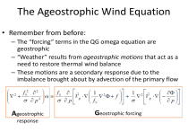 The Ageostrophic Wind Equation • Remember from before: – The “forcing” terms in the QG omega equation are geostrophic – “Weather” results from ageostrophic motions that act as a need to restore thermal wind balance – These motions are a secondary response due to the imbalance brought about by advection of the primary flow Ageostrophic response Geostrophic forcing The Ageostrophic Wind Equation • Knowing and understanding the ageostrophic wind is a powerful concept in weather analysis and forecasting – The ageostrophic wind will allow us to better identify areas of CONV and DIV aloft • Typically apply the ageostrophic wind at the jet level, however, it can also apply at the surface • Remember, with the jet stream: – Strong curvature regions are important – Identifying areas of acceleration and deceleration • In fact, the above is MORE important than our knowledge of 4-quadrant jet theory for identifying areas of DIV/CONV aloft Ageostrophic Wind Definition The horizontal wind can be partitioned into a geostrophic and ageostrophic component: **The ageostrophic wind represents the difference between what the wind is actually doing and what it would be doing if it were in a perfect geostrophic balance Basically, any wind blowing at an angle to isoheights/isobars will have an ageostrophic component Wind blowing at a 90° angle to isobars/heights is strictly ageostrophic Ageostrophic Wind Equation (Natural Coordinates) æ k ¶V ö æ V 2 ö æ V ¶V ö æ w k ¶V ö æ k ö Vag = ç ´ ÷ - ç t ÷+ç n÷ + ç ´ ÷-ç ´ F÷ è f ¶t ø è fRs ø è f ¶s ø è f ¶p ø è f ø Term 1 • Term 2 Term 3 Term 1: Isallohypsic or isallobaric Acceleration Term – Height tendency / pressure tendency term • Term 2: Centripetal or Centrifugal Acceleration Term – Curvature Term – Important along troughs/ridges • Term 3: Speed Divergence Term – Speed Acceleration Term – Look for significant changes in velocity along the flow – Important in entrance/exit regions of jet streaks • Term 4: Vertical Advection Term – Relates to the thermal field – Note the omega vertical motion in pressure coordinates • Term 5: Friction Term – Most important at the surface – Friction always opposes the wind Term 4 Term 5 Natural Coordinate System Review • Natural coordinates are another way of representing direction. It is based on the relative motion of the object of interest, rather than a fixed coordinate plane • Three unit vectors: – t: oriented parallel to direction of velocity vector – n: oriented perpendicular to the velocity vector and points to the left of the flow – k: directed vertically upward • We also define “s” as the horizontal distance along a curve followed by an air parcel • “R” is the radius of curvature following the parcel motion – If the center of curvature is in the positive n direction, then R>0 Ageostrophic Wind Equation (Natural Coordinates) æ k ¶V ö æ V 2 ö æ V ¶V ö æ w k ¶V ö æ k ö Vag = ç ´ ÷ - ç t ÷+ç n÷ + ç ´ ÷-ç ´ F÷ è f ¶t ø è fRs ø è f ¶s ø è f ¶p ø è f ø Term 1 • Term 2 Term 3 Term 1: Isallohypsic or isallobaric Acceleration Term – Height tendency / pressure tendency term • Term 2: Centripetal or Centrifugal Acceleration Term – Curvature Term – Important along troughs/ridges • Term 3: Speed Divergence Term – Speed Acceleration Term – Look for significant changes in velocity along the flow – Important in entrance/exit regions of jet streaks • Term 4: Vertical Advection Term – Relates to the thermal field – Note the omega vertical motion in pressure coordinates • Term 5: Friction Term – Most important at the surface – Friction always opposes the wind Term 4 Term 5 Term 1 Isallohypsic or Isallobaric Acceleration Term • An isallohypse is a contour of constant height change • An isallobar is a contour of constant pressure change • **Height or pressure changes produces an ageostrophic wind Term 1 • For a constant pressure surface: k ¶V -g ¶z g é ¶z ù ´ » 2 Ñ » 2 ê-Ñ ú f ¶t f ¶t f ë ¶t û **Gradient of the height change with time** Term 1 • For a constant height surface (i.e. surface charts) k ¶V a é ¶p ù ´ » 2 ê-Ñ ú f ¶t f ë ¶t û **Gradient of the pressure change with time** Term 1 Isallohypsic or Isallobaric Acceleration Term • Board Example… • The contour defines a gradient of height change • The gradient vector points toward lower values • Based on our equation, we also find the Vag is always oriented along the gradient vector – i.e., Vag due to term 1 points towards the lowest pressure/height falls Term 1 Isallohypsic or Isallobaric Acceleration Term • Since f is in the denominator of Term 1, Vag has a latitudinal dependence. • Since f is small at low latitudes, a 30 m height change at 20N over a 100km distance will produce a larger Vag than the same height change at 60N – i.e., a smaller height change at low latitudes will produce a larger Vag • A developing hurricane (rapid height/pressure falls) produces a massive Vag (also occurs at low latitudes!) Term 1 Isallohypsic or Isallobaric Acceleration Term • Let’s look at term 1 as it pertains to divergence. • Remember, divergence is defined as the ageostrophic component of the wind – Geostrophic wind is non-divergent • Board notes • **Laplacian of the height change field will define divergence Term 1 Isallohypsic or Isallobaric Acceleration Term • Recall that the Laplacian operator is positive in local minima regions and negative in local maxima (“opposite operator”) • Thus, a height fall center would have a positive Laplacian and a height rise center would have a negative Laplacian • Example with falling heights • Example with rising heights Term 1 Pressure/Height Tendency Term • Vag due to term 1 points toward the lowest pressure/height falls • Vag due to term 1 points away from the highest pressure/height ri