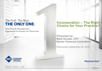 Incorporation – The Right Choice for Your Practice? Presented by: Mark Donato, CFP Senior Financial Consultant Wednesday September 26, 2012 MD Puts Physicians First ™ Created in 1969 to manage the retirement finances of CMA members – Wholly owned by the CMA and an exclusive benefit of CMA membership EQUITY – Guide more than $30MDPIM billion inUS assets for over POOL 100,000 physicians and their families – Uniquely focused on driving maximum value for members through objective non-commissioned advice and world-class investment management at a very low price Partnering with the OMA, everything we do is for the benefit of our members – MD and the OMA are natural partners in delivering value to Ontario Physicians – Currently partnering through Membership and the Insurance Alliance initiatives The First. The Best. The Only One. MDPIM US EQUITY POOL “ In a recent study,1 48% of CMA members identified MD as their primary investment firm, making us by far the dominant wealth manager for members. By comparison, only 11% identified our closest competitor.” Brian Peters President and Chief Executive Officer 1 Source: MD Physician Services Loyalty Survey, November 2011. Why MD? Engineered exclusively for physicians – – – Over 40 years of experience working for physicians and their families MDPIM to provide advice POOL and services USthe EQUITY you need Team approach to bring specialization and strength to achieving client goals Among the lowest management expense ratios (MERs) in the industry Top scores in overall customer satisfaction – – Scored 770/1000 in the 2011 J.D. Power survey of full service investment firms in Canada 5 out of 5 Power Circle ratings from J.D. Power = “among the best” in full-service firms Our private investment counsel arm ranked number one inprovides asset growth MD Physician Services financial products and services, the MD family of mutual funds, investment counselling services and practice management products and services through the MD group10 of companies. For a detailed list of these companies, visit md.cma.ca. amongst the largest private investment counsel firms in Canada Agenda Advantages of incorporation – Tax deferral – Income splitting Incorporation myths and facts Is incorporation the right choice for me? – Questions to consider Q&A – MD Advisor Panel Should I incorporate my medical practice? Running the numbers The Tax Deferral Advantage 2012 Tax Rate Comparison Corporation Individual Active Business Income <$500,000 15.50% 45.00% >$500,000 27.50% 45.00% Interest 47.00% 45.00% Non-eligible dividends 33.33% 33.00% Eligible dividends 33.33% 26.00% Capital gains 23.50% 22.50% Investment Income Total tax example: Corporate small business rate x Personal non-eligible dividend tax rate 1 - (1-0.1550) x (1-0.3300) (1-0.5728) = Total tax of 43.41% Integration A general tax policy designed to ensure that: – Income earned and distributed by a Canadian Controlled Private Corporation (CCPC), – is subject to (virtually) the same amount of total tax, – as if the same amount of income was earned by an individual taxpayer directly. Should I Incorporate? Case 1 - Mary Mary is a single GP who has been paying down debt and saving in her RRSP. She has now paid off her mortgage and is considering incorporating her medical practice. In order to meet her current lifestyle needs, Mary, along with the help of her accountant, has determined that she would need to pay herself a salary of $150,000 from the corporation. This salary level also allows for continued RRSP contributions. Case 1: The Numbers Unincorporated Income (after expenses) Salary Ongoing incorporation costs Net income 300,000 300,000 145,000 (22,475) 122,525 Corporate net income Taxes - corporation After-Tax Income (Retained in Corp.) Personal income Taxes - personal Net salary Combined Personal & Corporate After-Tax Income Deferral advantage Corporation Year 1 Year 2+ 300,000 300,000 (150,000) (150,000) (5,000) (2,500) 145,000 147,500 147,500 (22,863) Taxed Corporately 124,637 300,000 (122,000) 178,000 150,000 (52,100) 97,900 150,000 (52,100) 97,900 178,000 220,425 222,537 42,425 Income 44,537 Taxed Personally Case 1: Conclusions Mary will benefit from tax deferral on the savings she retains in her professional corporation. Mary can also use RRSP contributions (from her salary of $150,000) for additional tax deferral. Conclusion: Incorporation is a valid option for Mary. Should I Incorporate? Case 2 – Joe and Julie Joe is a young GP, married to Julie. They have three children and a large mortgage on their principal residence. To meet Joe’s cash flow needs, the corporation would need to pay him a salary of $132,500 as well as a dividend distribution equal to the funds remaining in the corporation. Due to Julie’s income level there are no splitting opportunities. Case 2: The Numbers Unincorporated Income (after expenses) Salary Ongoing incorporation costs Net income 300,000 300,000 Corporate net income Taxes - corporation After-Tax Income Dividend Distribution (non-eligible) Funds retained in Corporation 162,500 (25,188) 137,312 137,312 0 165,000 (25,575) 139,425 139,425 0 132,500 139,425 (89,597) 182,328 182,328 Personal salary income Personal non-eligible dividend income Taxes - personal Net salary (122,000) 178,000 132,500 137,312 (88,909) 180,903 Combined Personal & Corporate After-Tax Income 178,000 180,903 Increase (decrease) in savings 300,000 Incorporated Year 1 Year 2+ 300,000 300,000 (132,500) (132,500) (5,000) (2,500) 162,500 165,000 2,903 4,328 Income Taxed Corporately Taxed Personally Case 2: Conclusions For Joe and Julie: Little savings retained in the corporation means minimal tax deferral Due to the additional expenses of incorporation, there is little tax savings Incorporation for Joe would mean more administrative work and very little (if any) tax savings Result? Joe may decide not to incorporate Key Considerations: Tax Deferral In order to defer taxes, 